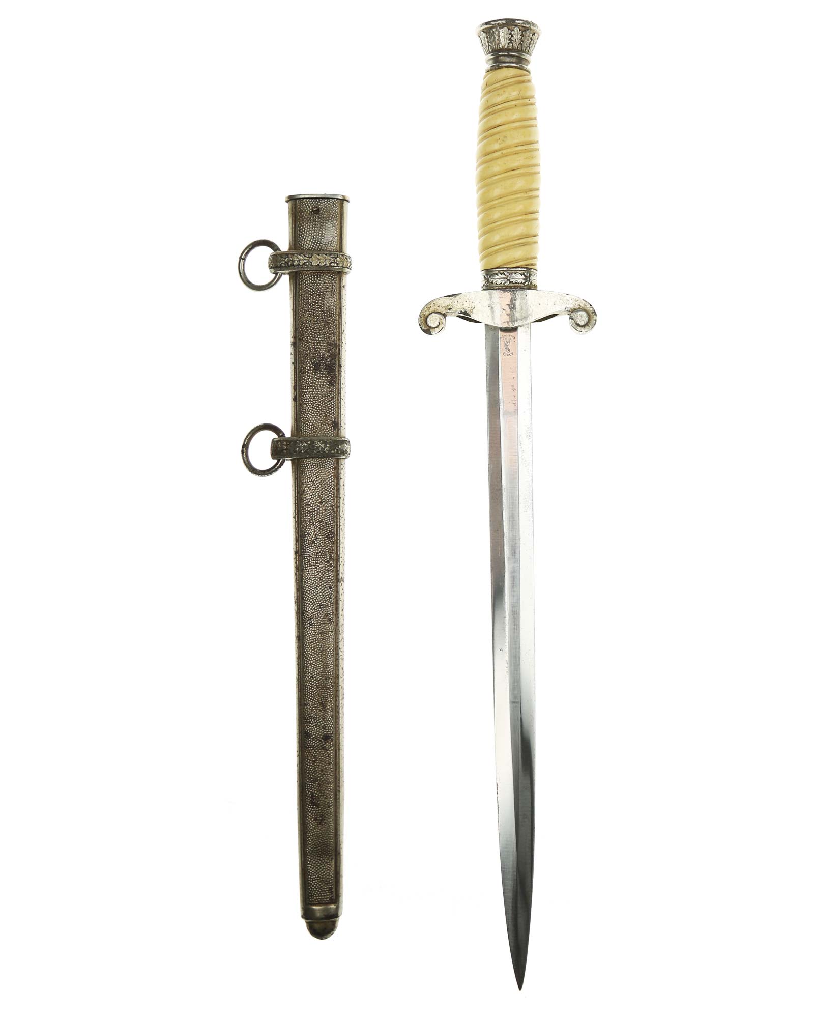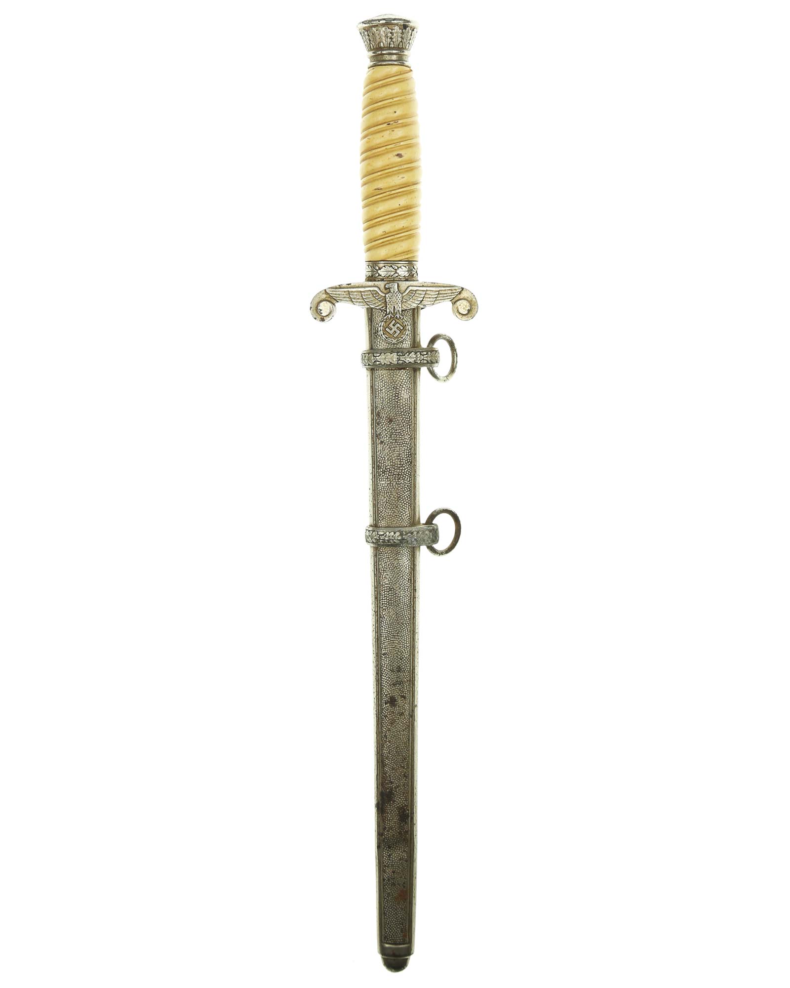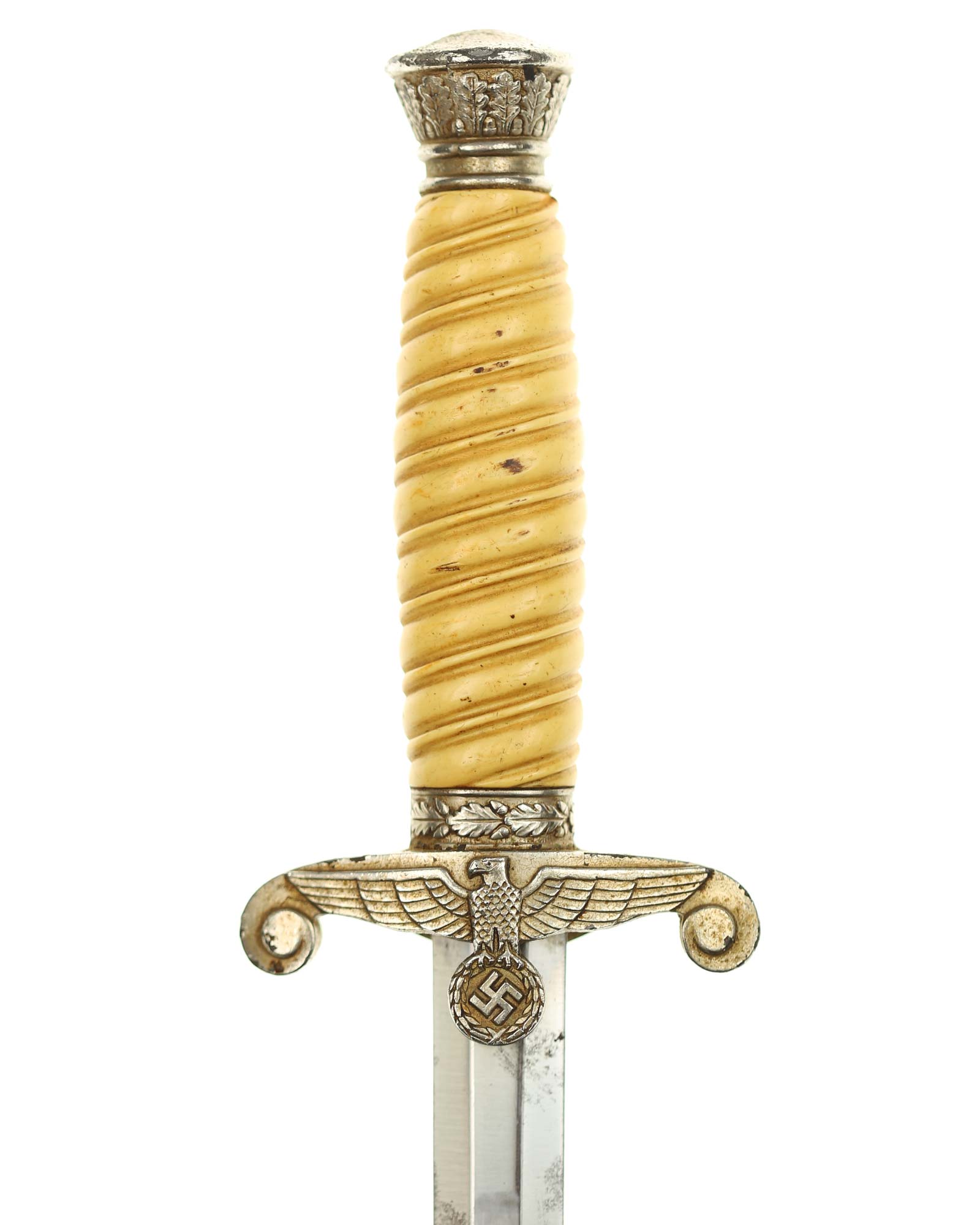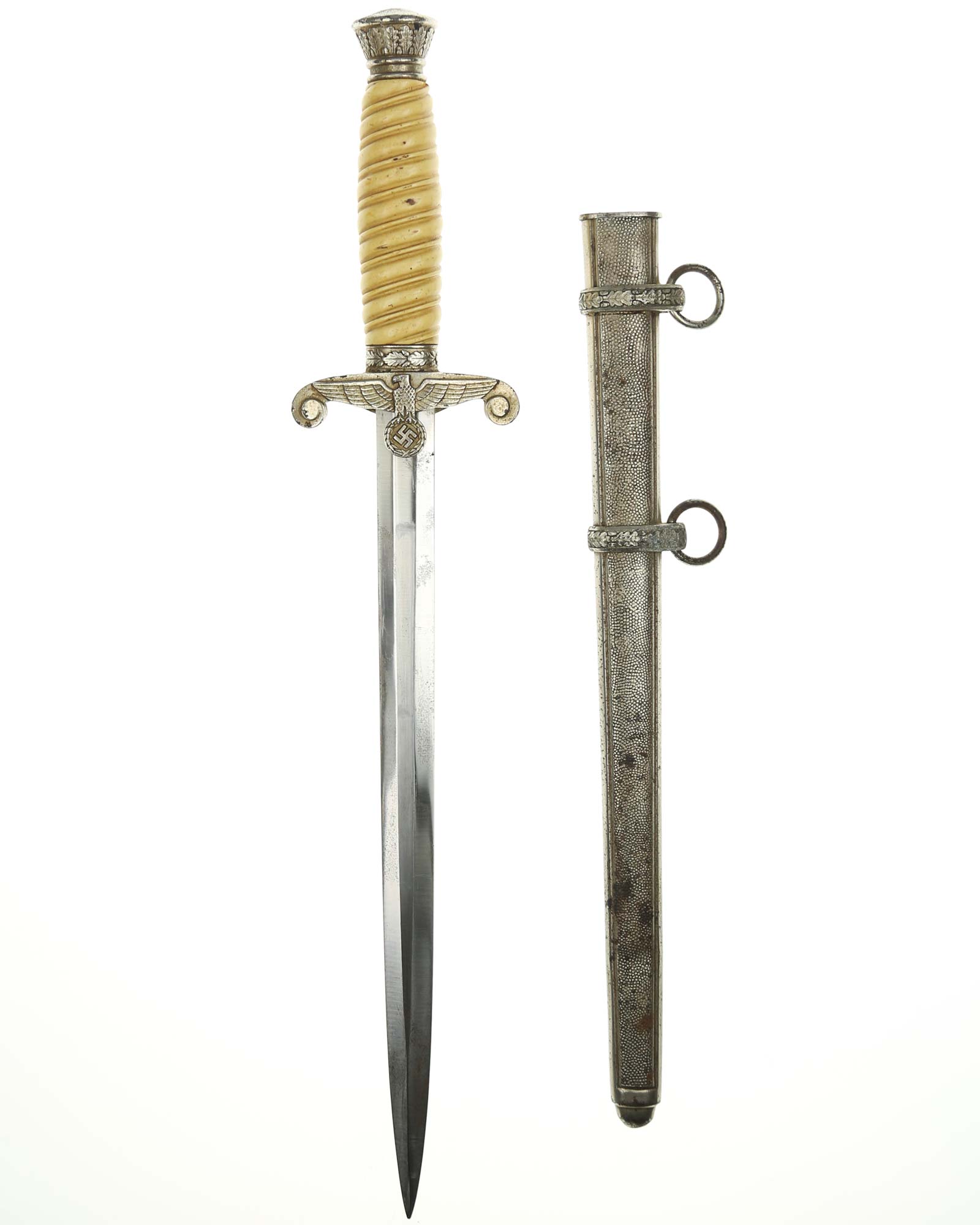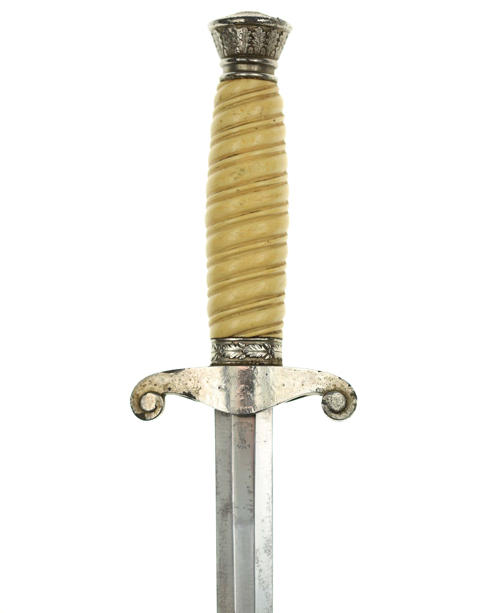 Griff: Der Griff ist rund mit zweifach verdrehten Kanneluren. Der Griff ist aus weißem Zelluloid. Die Form der Kanneluren ist konvex bzw. nach außen gewölbt. Der Knauf ist konisch und ist auf die Klingenangel festgeschraubt, er ist mit 12 Eichenlaubblätter verziert. Am unteren Ende des Griffes befindet sich der Griffring, der mit 6 Eichenblätter in einer Reihe nebeneinander verziert ist. Die Parierstange ist in Form eines Reichsadlers, der nach links schaut. Zu den beiden Enden hin wirbeln die Flügel nach unten. In der Mitte befindet sich der Adler, der in seinen Krallen einen Kranz mit dem Hakenkreuz festhält.