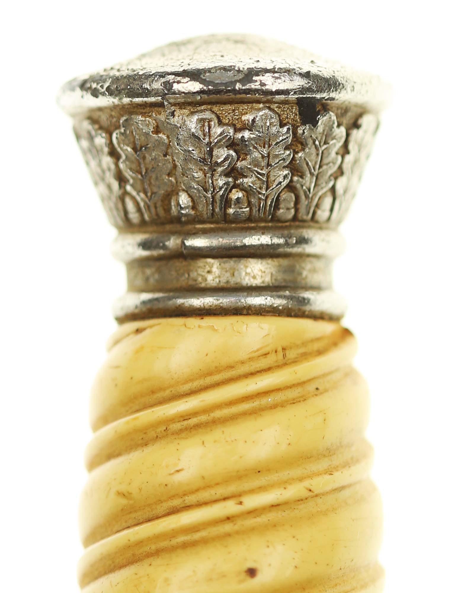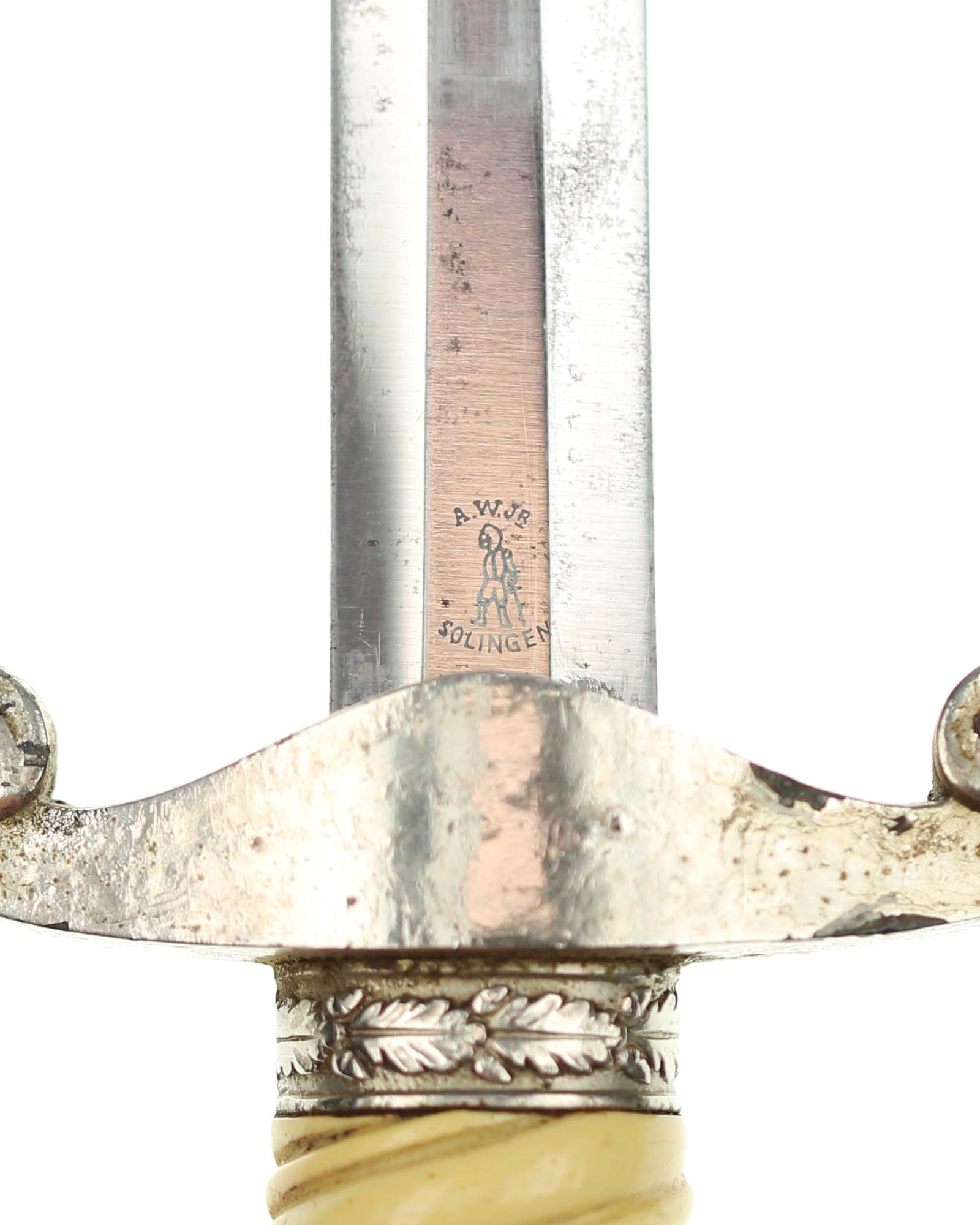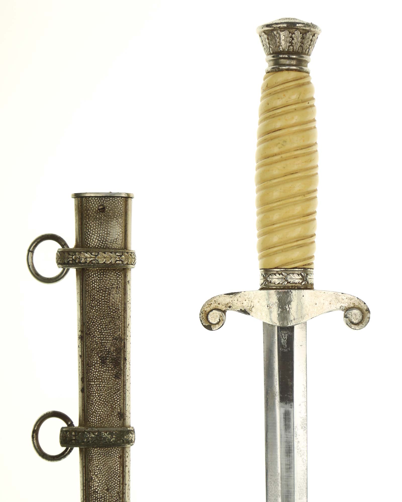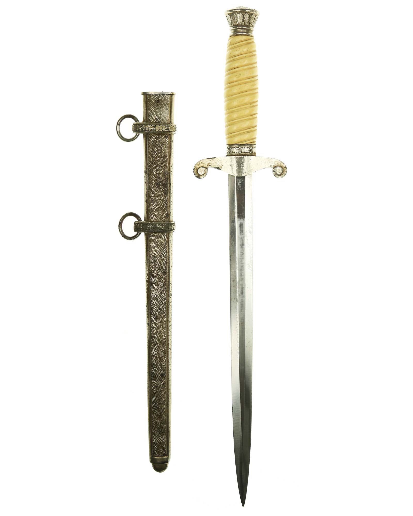 Griff: Der Griff ist rund mit zweifach verdrehten Kanneluren. Der Griff ist aus weißem Zelluloid. Die Form der Kanneluren ist konvex bzw. nach außen gewölbt. Der Knauf ist konisch und ist auf die Klingenangel festgeschraubt, er ist mit 12 Eichenlaubblätter verziert. Am unteren Ende des Griffes befindet sich der Griffring, der mit 6 Eichenblätter in einer Reihe nebeneinander verziert ist. Die Parierstange ist in Form eines Reichsadlers, der nach links schaut. Zu den beiden Enden hin wirbeln die Flügel nach unten. In der Mitte befindet sich der Adler, der in seinen Krallen einen Kranz mit dem Hakenkreuz festhält.