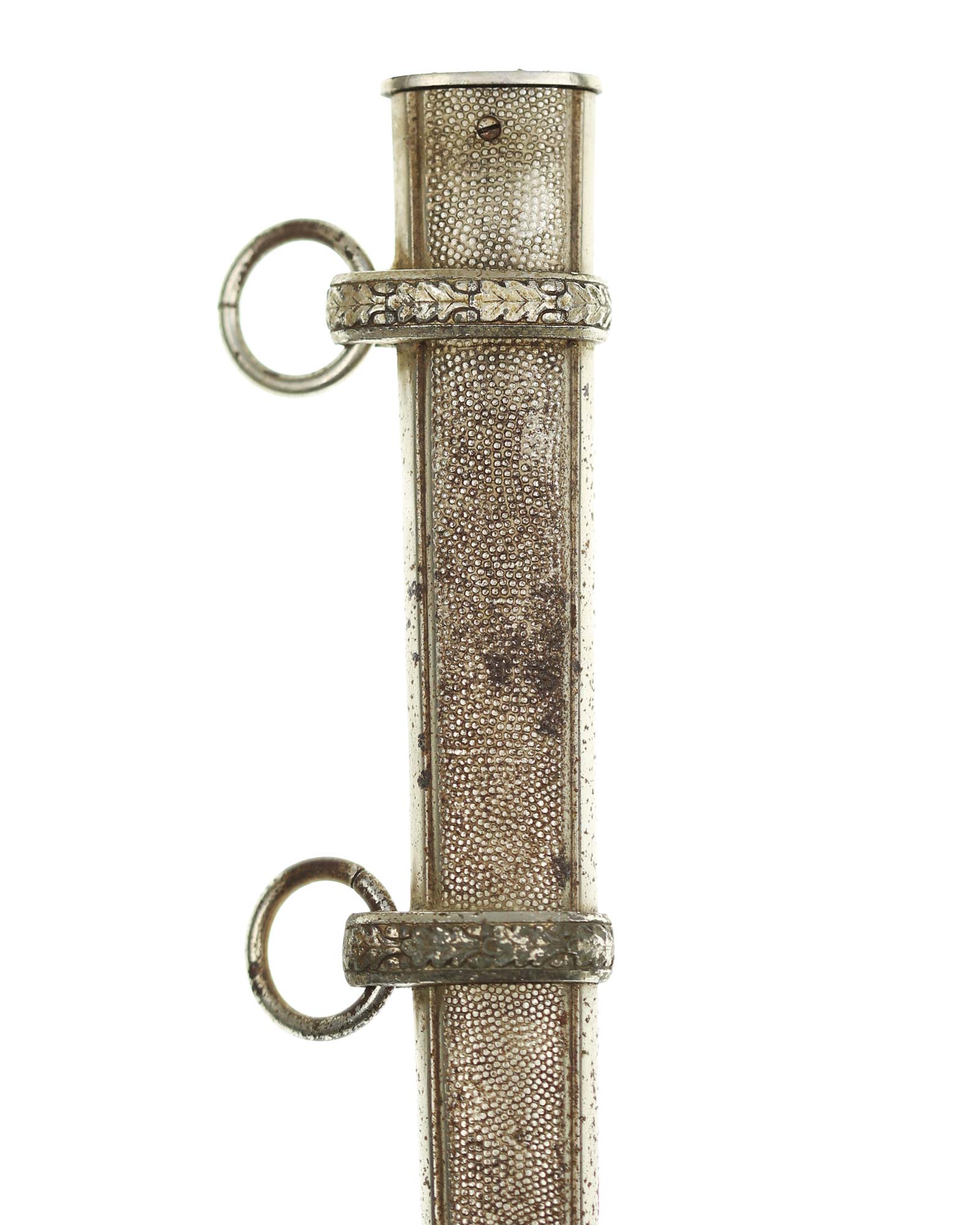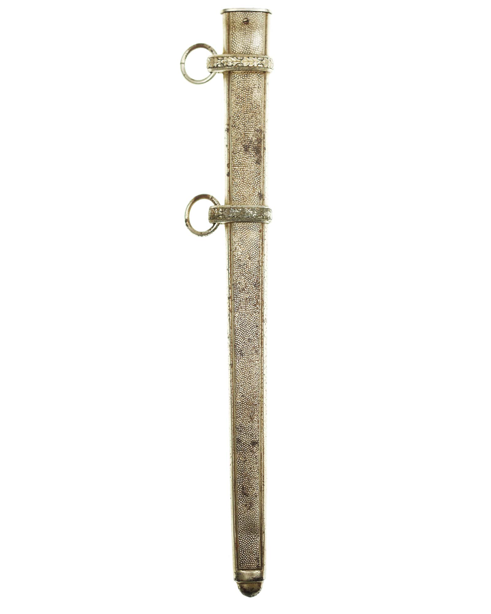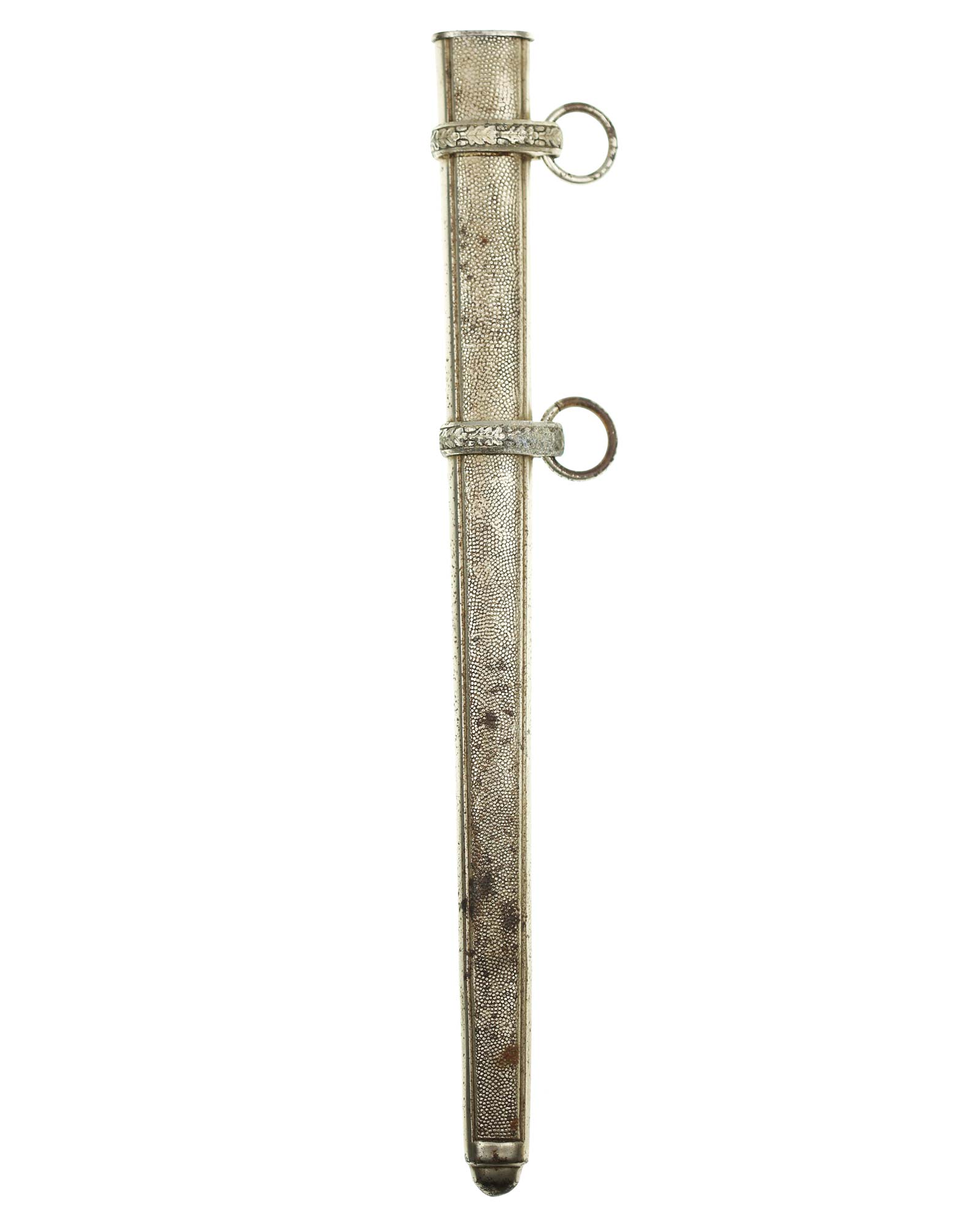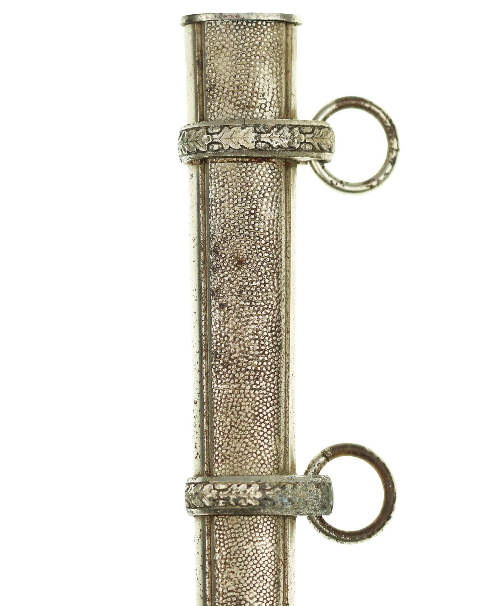 Scheide: Die Scheide besteht aus Mundblech und aus zwei Eichenlaub verzierten Scheidenbändern mit zwei losen Trageringen, diese sind komplett geschlossen. Die Scheide ist aus einem Stück Stahlblech gezogen und auf der Vorder- und Rückseite mit körniger Oberflächenstruktur versehen. Die Spitze ist abgerundet und nicht eingedrückt. Das Mundstück ist separat eingesetzt und mit einer Schraube befestigt.