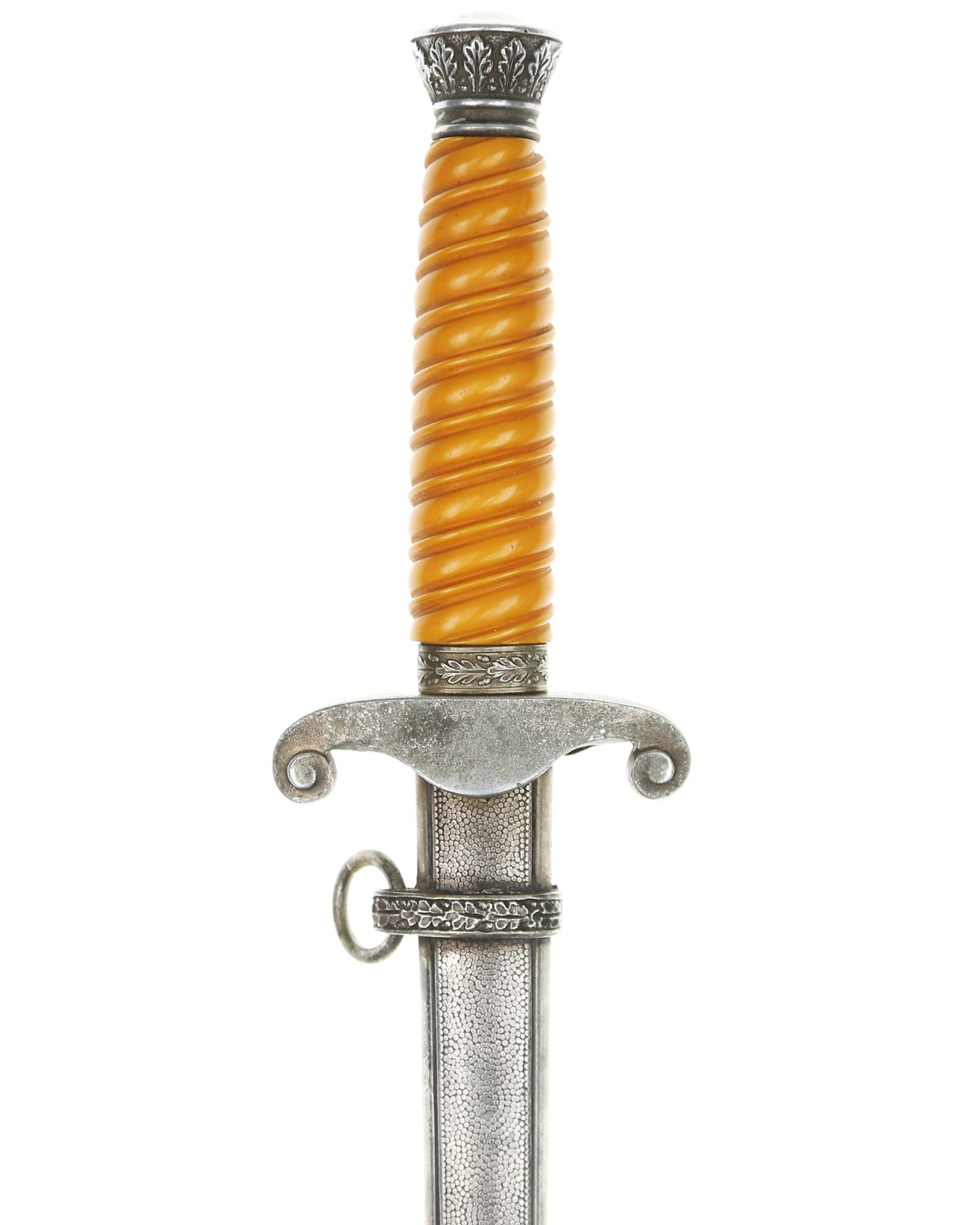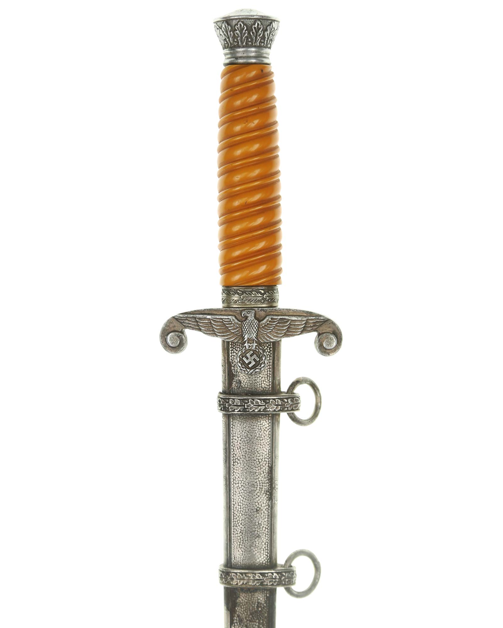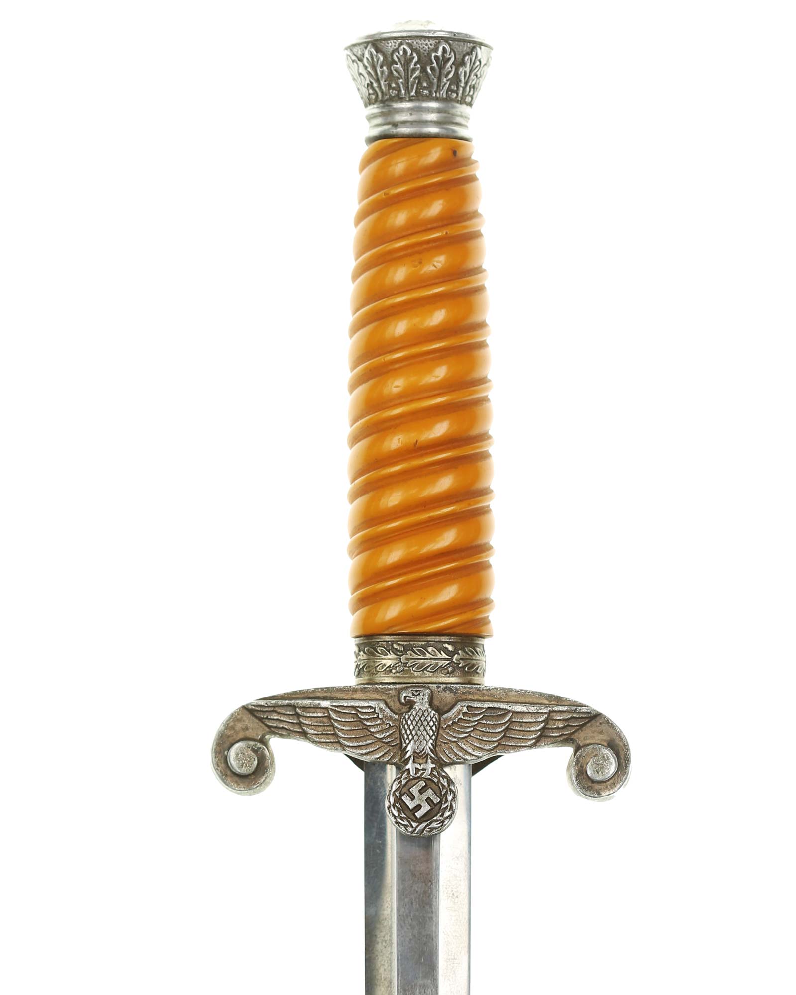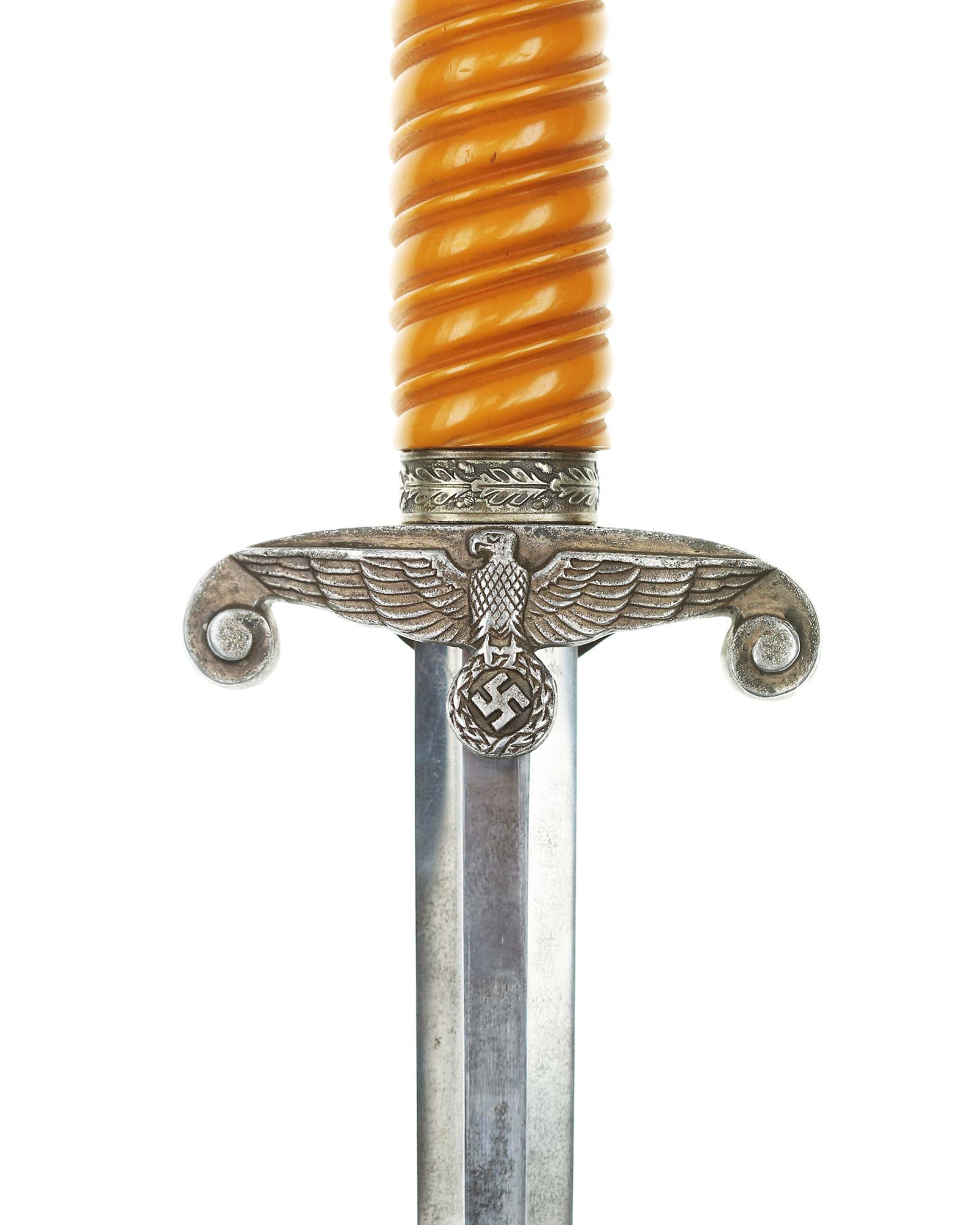 Griff: Der Griff ist rund mit zweifach verdrehten Kanneluren. Der Griff ist aus gelben Trolen. Die Form der Kanneluren ist konvex bzw. nach außen gewölbt. Der Knauf ist konisch und ist auf die Klingenangel festgeschraubt, dieser ist mit 12 Eichenlaubblätter verziert. Am unteren Ende des Griffes befindet sich der Griffring. Die Parierstange ist in Form eines Reichsadlers, der nach links schaut. Zu den beiden Enden hin wirbeln die Flügel nach unten. In der Mitte befindet sich der Adler, der in seinen Krallen einen Kranz mit dem Hakenkreuz festhält.
