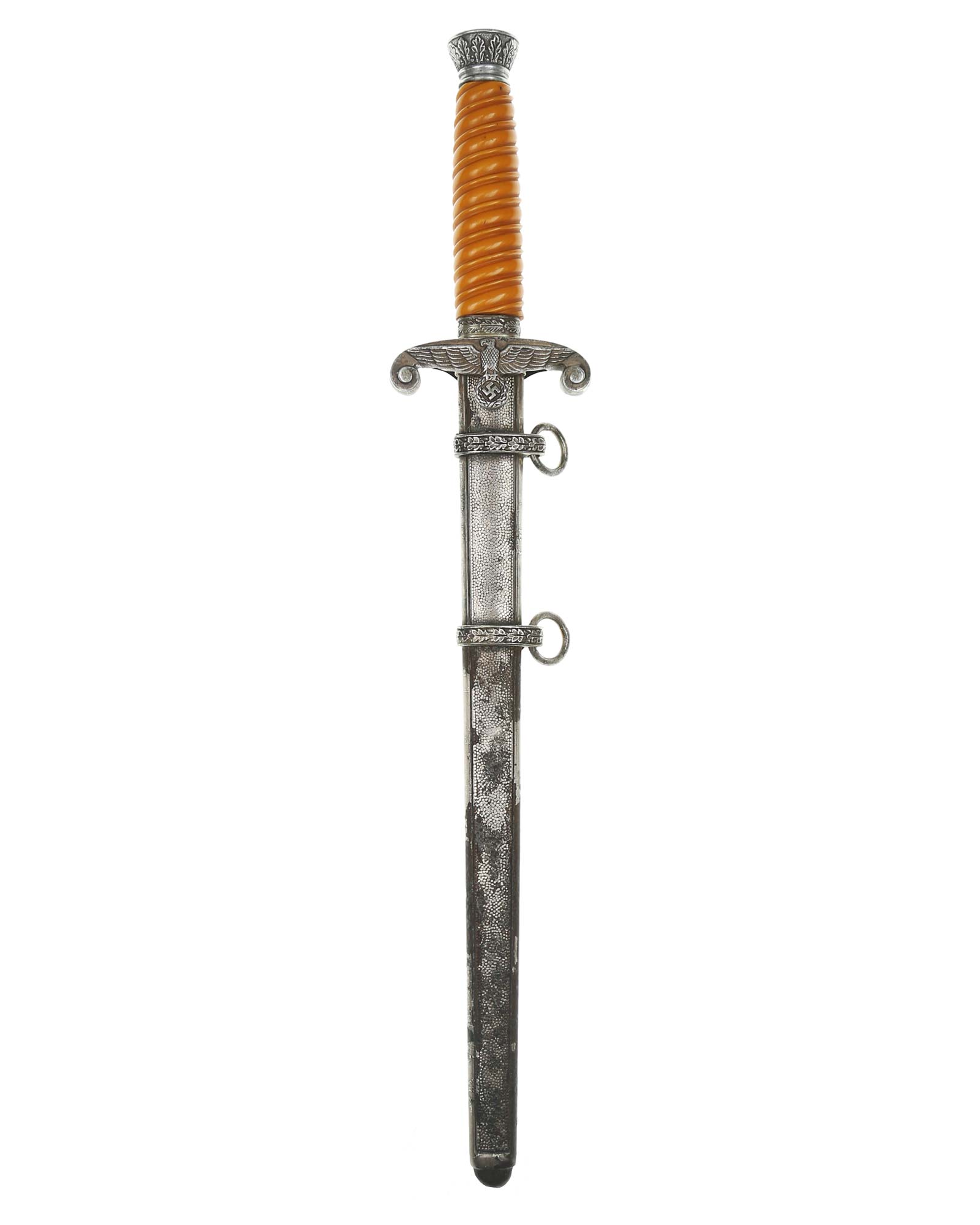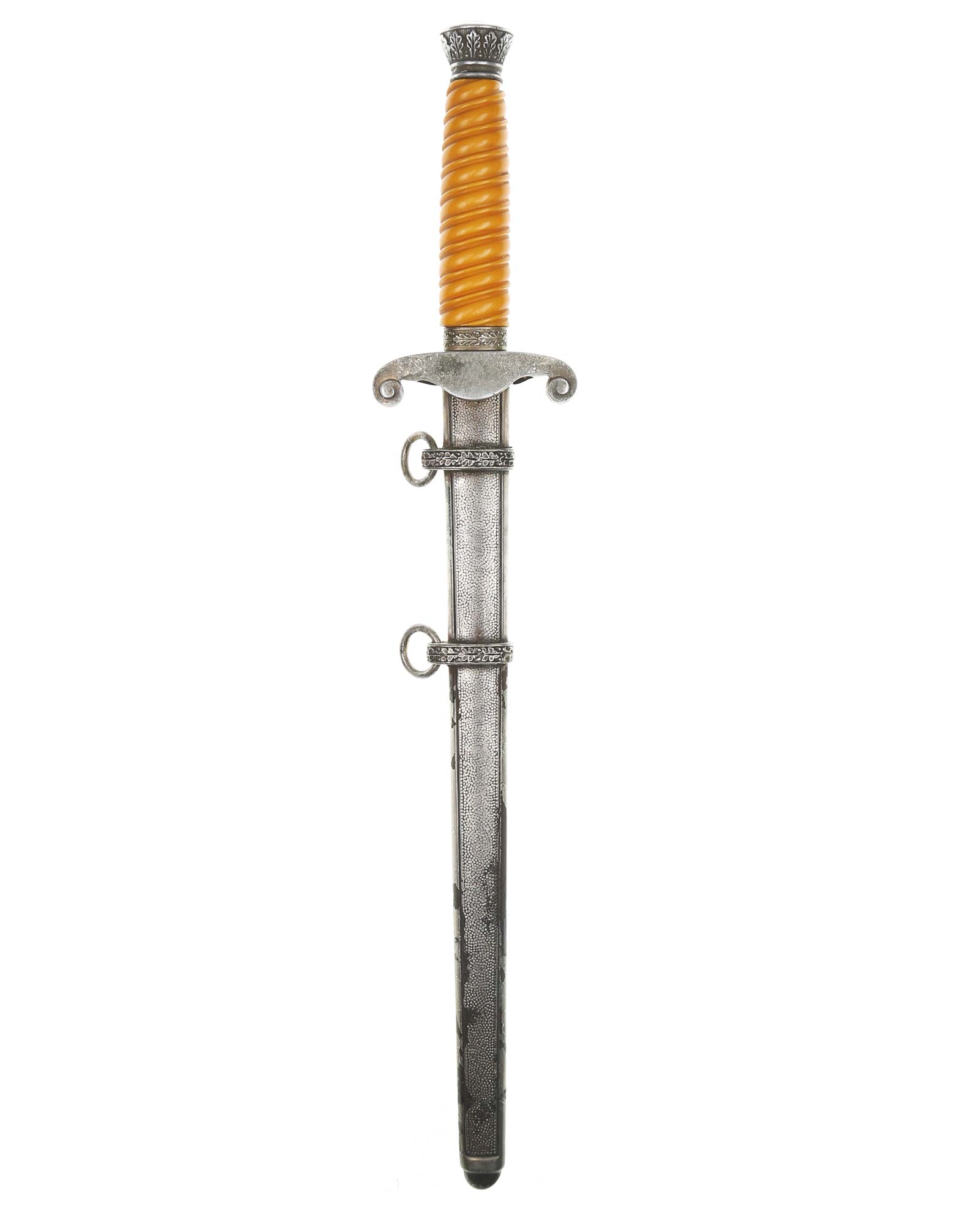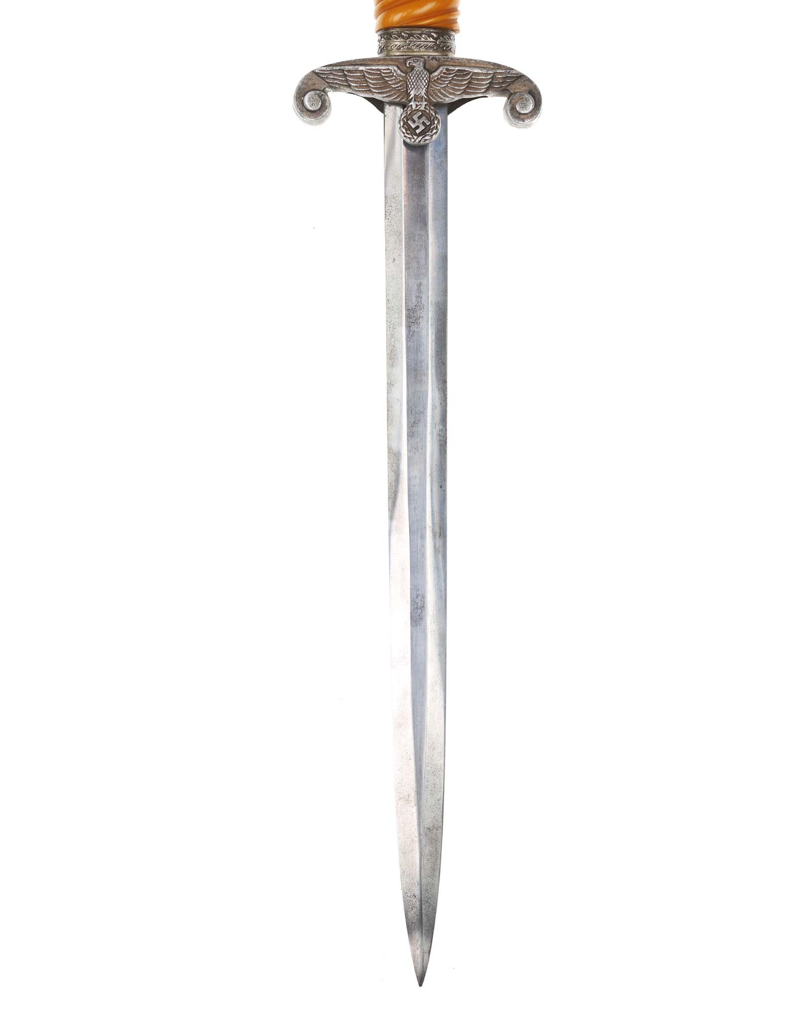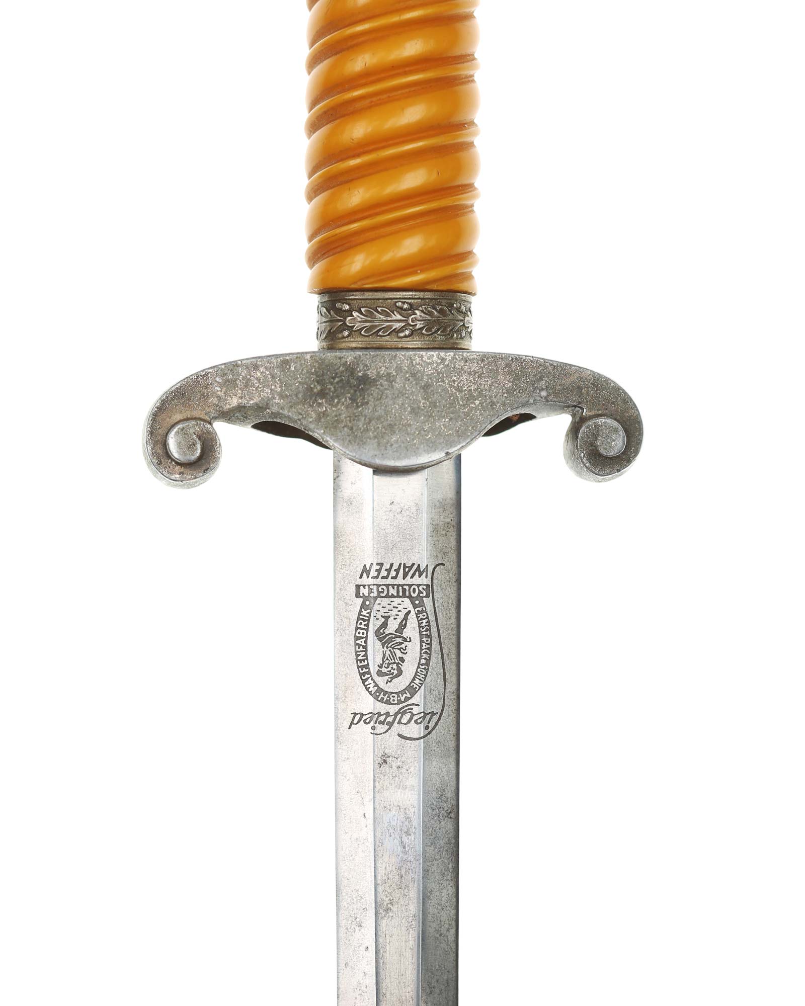 Griff: Der Griff ist rund mit zweifach verdrehten Kanneluren. Der Griff ist aus gelben Trolen. Die Form der Kanneluren ist konvex bzw. nach außen gewölbt. Der Knauf ist konisch und ist auf die Klingenangel festgeschraubt, dieser ist mit 12 Eichenlaubblätter verziert. Am unteren Ende des Griffes befindet sich der Griffring. Die Parierstange ist in Form eines Reichsadlers, der nach links schaut. Zu den beiden Enden hin wirbeln die Flügel nach unten. In der Mitte befindet sich der Adler, der in seinen Krallen einen Kranz mit dem Hakenkreuz festhält.