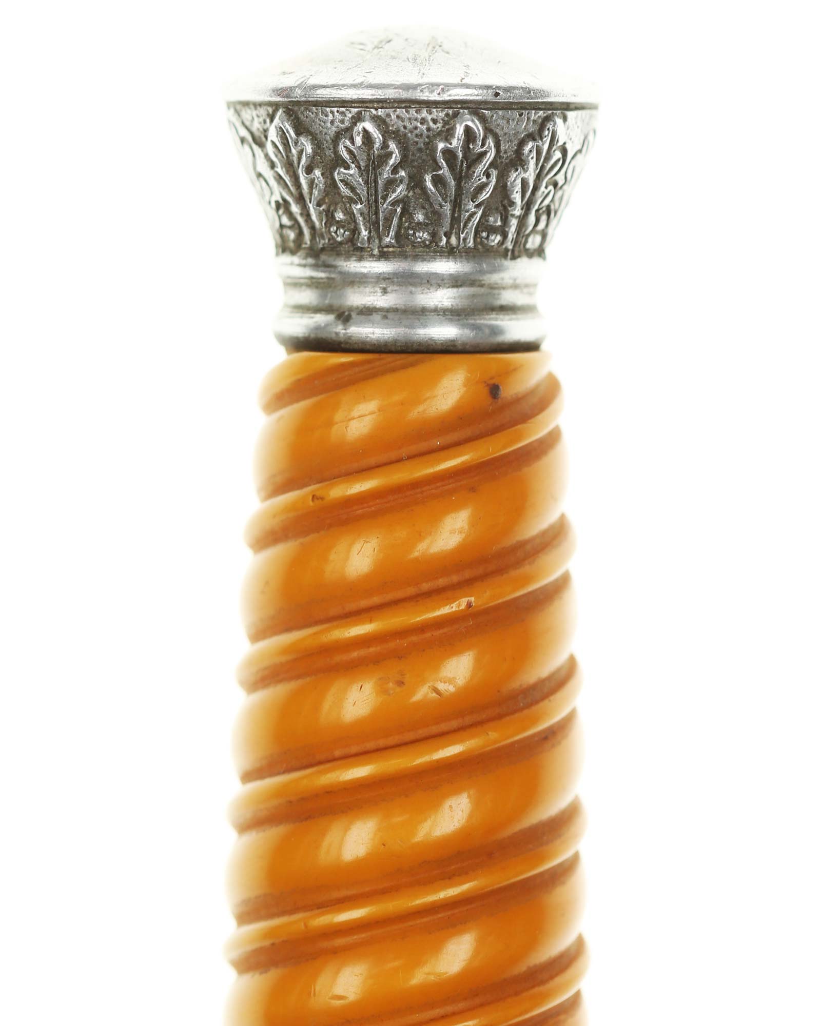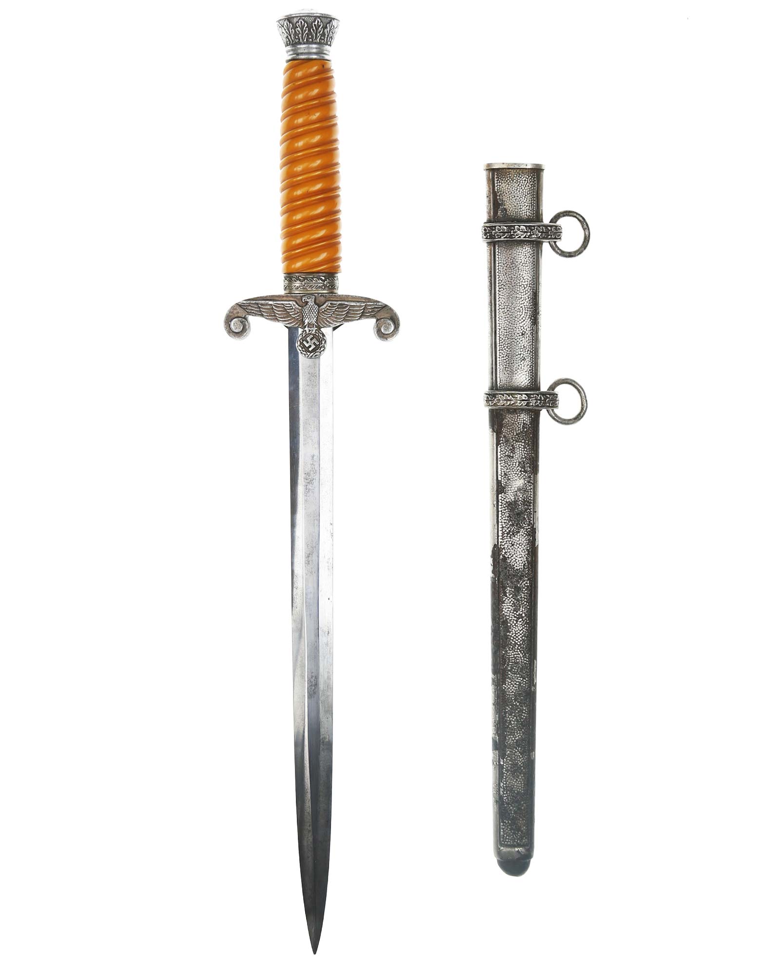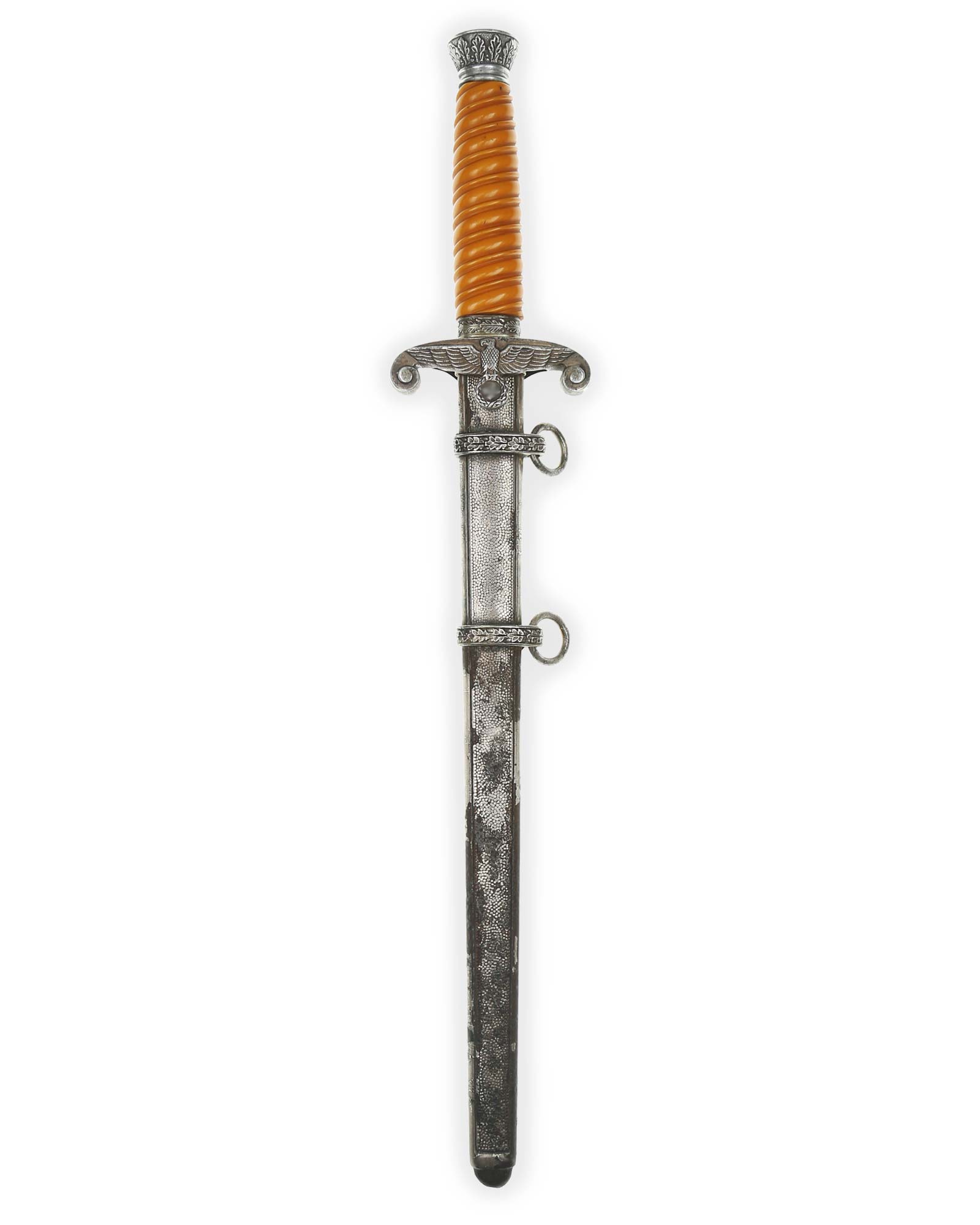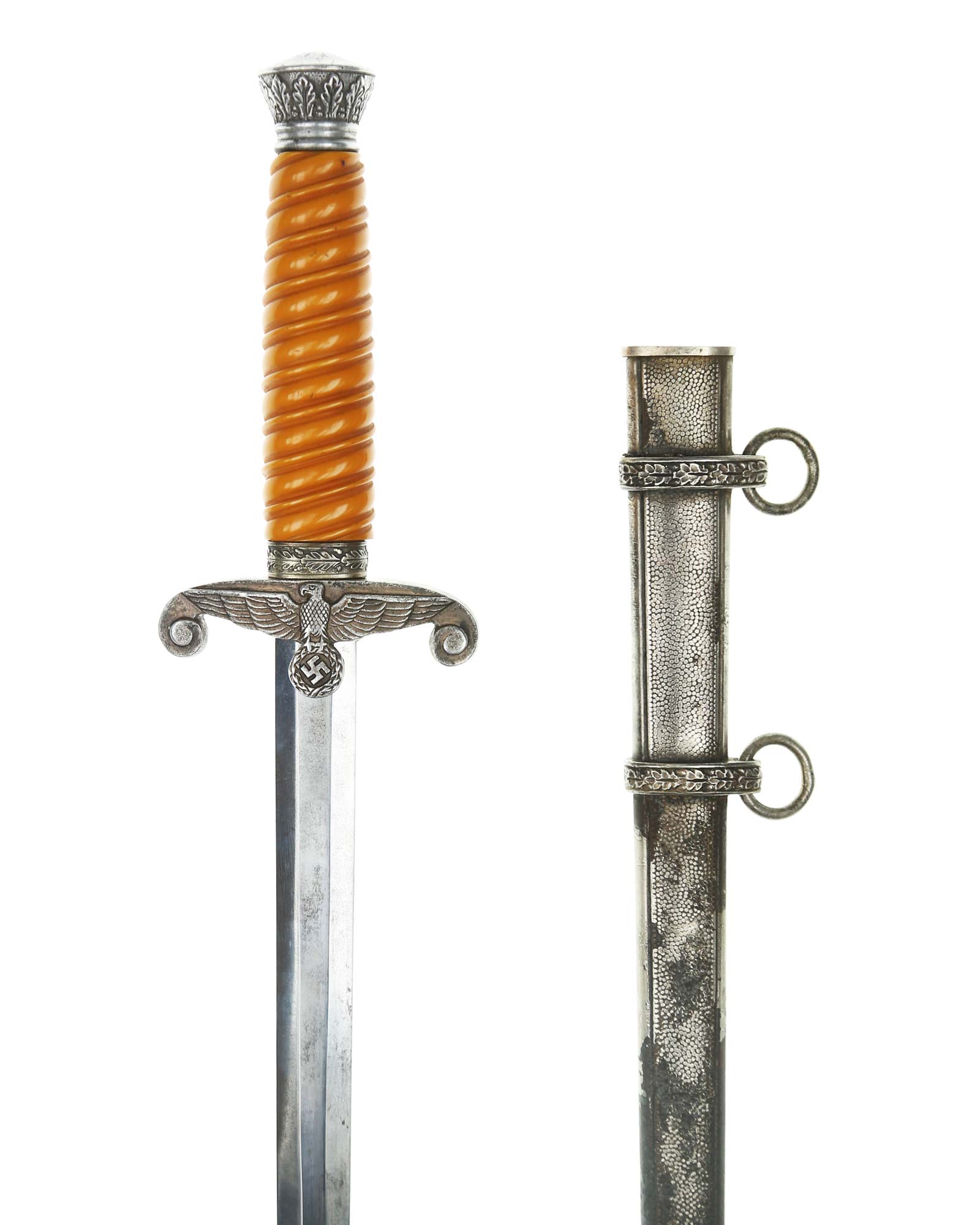 Griff: Der Griff ist rund mit zweifach verdrehten Kanneluren. Der Griff ist aus gelben Trolen. Die Form der Kanneluren ist konvex bzw. nach außen gewölbt. Der Knauf ist konisch und ist auf die Klingenangel festgeschraubt, dieser ist mit 12 Eichenlaubblätter verziert. Am unteren Ende des Griffes befindet sich der Griffring. Die Parierstange ist in Form eines Reichsadlers, der nach links schaut. Zu den beiden Enden hin wirbeln die Flügel nach unten. In der Mitte befindet sich der Adler, der in seinen Krallen einen Kranz mit dem Hakenkreuz festhält.