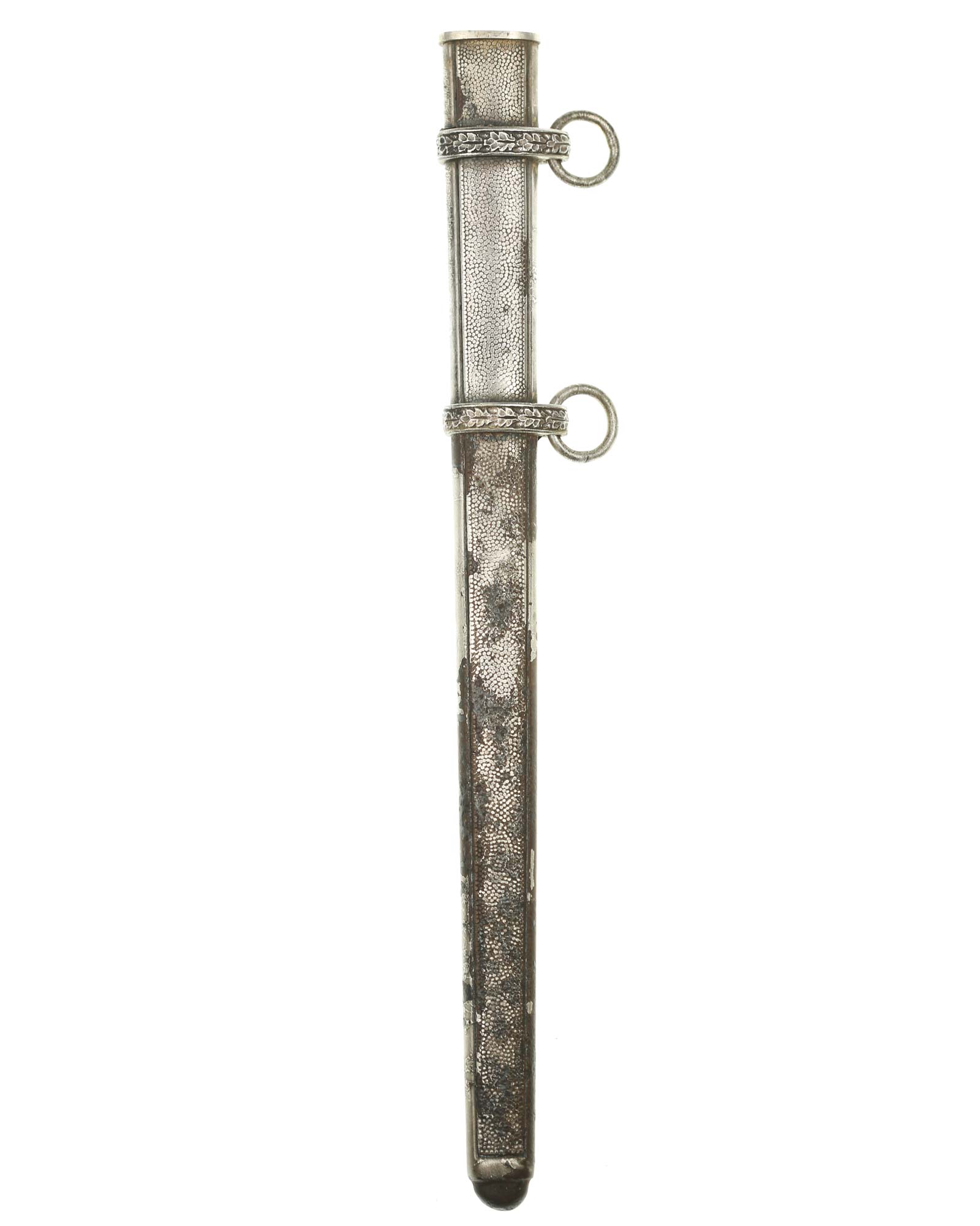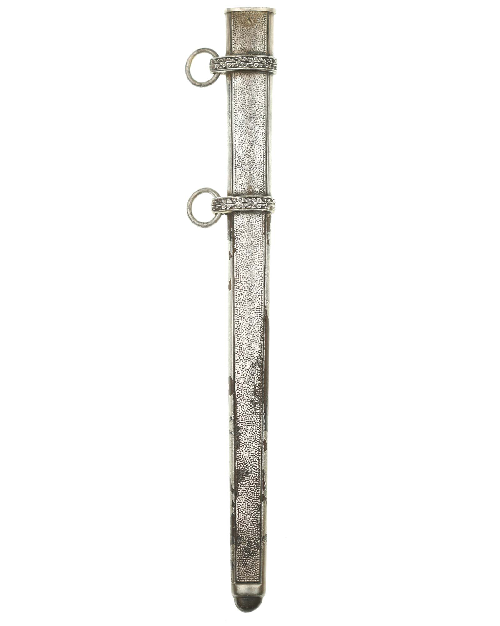 Scheide: Die Scheide besteht aus Mundblech und aus zwei Eichenlaub verzierten Scheidenbändern mit zwei losen Trageringen, diese sind komplett geschlossen. Die Scheide ist aus einem Stück Stahlblech gezogen und auf der Vorder- und Rückseite mit körniger Oberflächenstruktur versehen. Die Spitze ist abgerundet und nicht eingedrückt. Das Mundstück ist separat eingesetzt und mit einer Schraube befestigt.