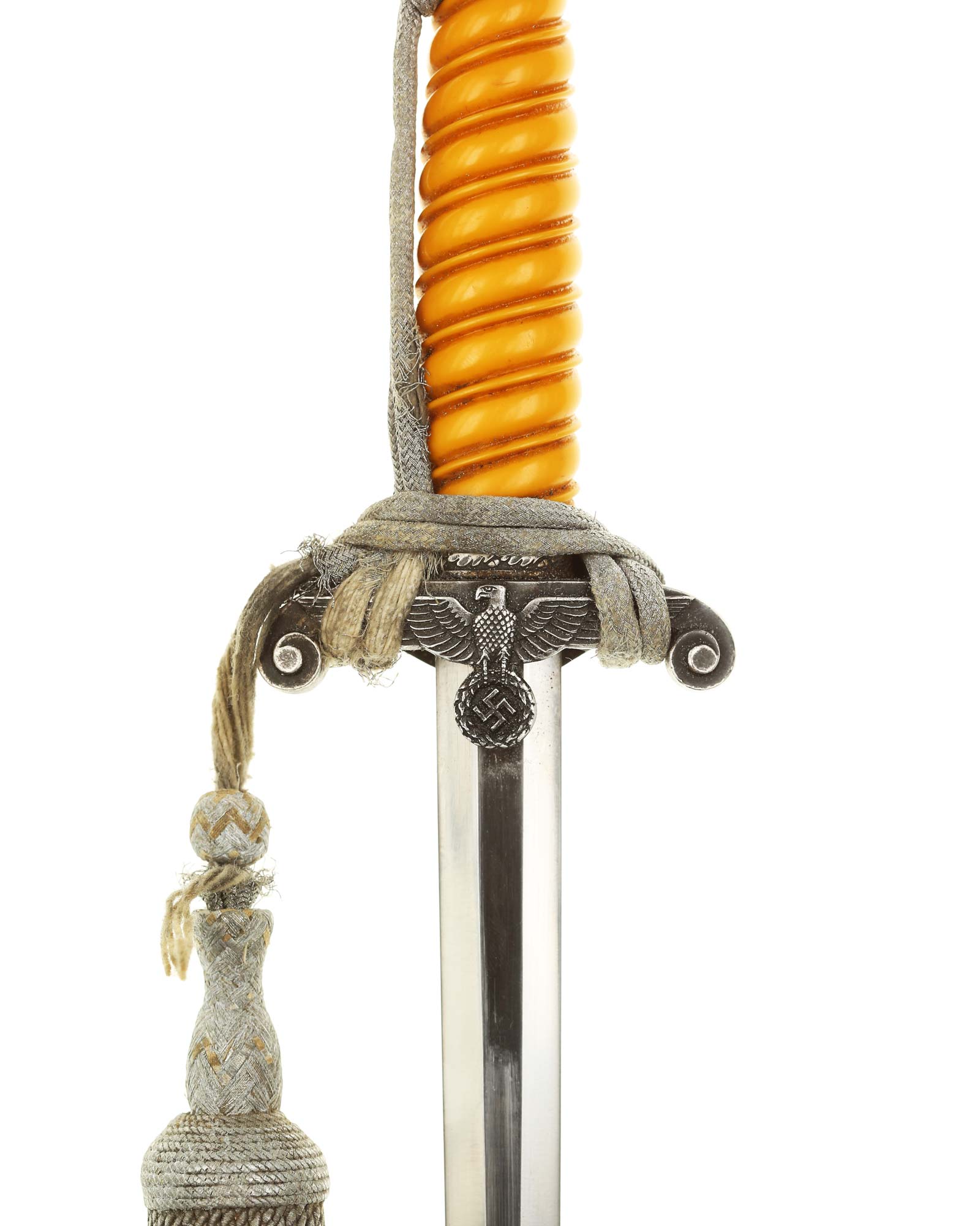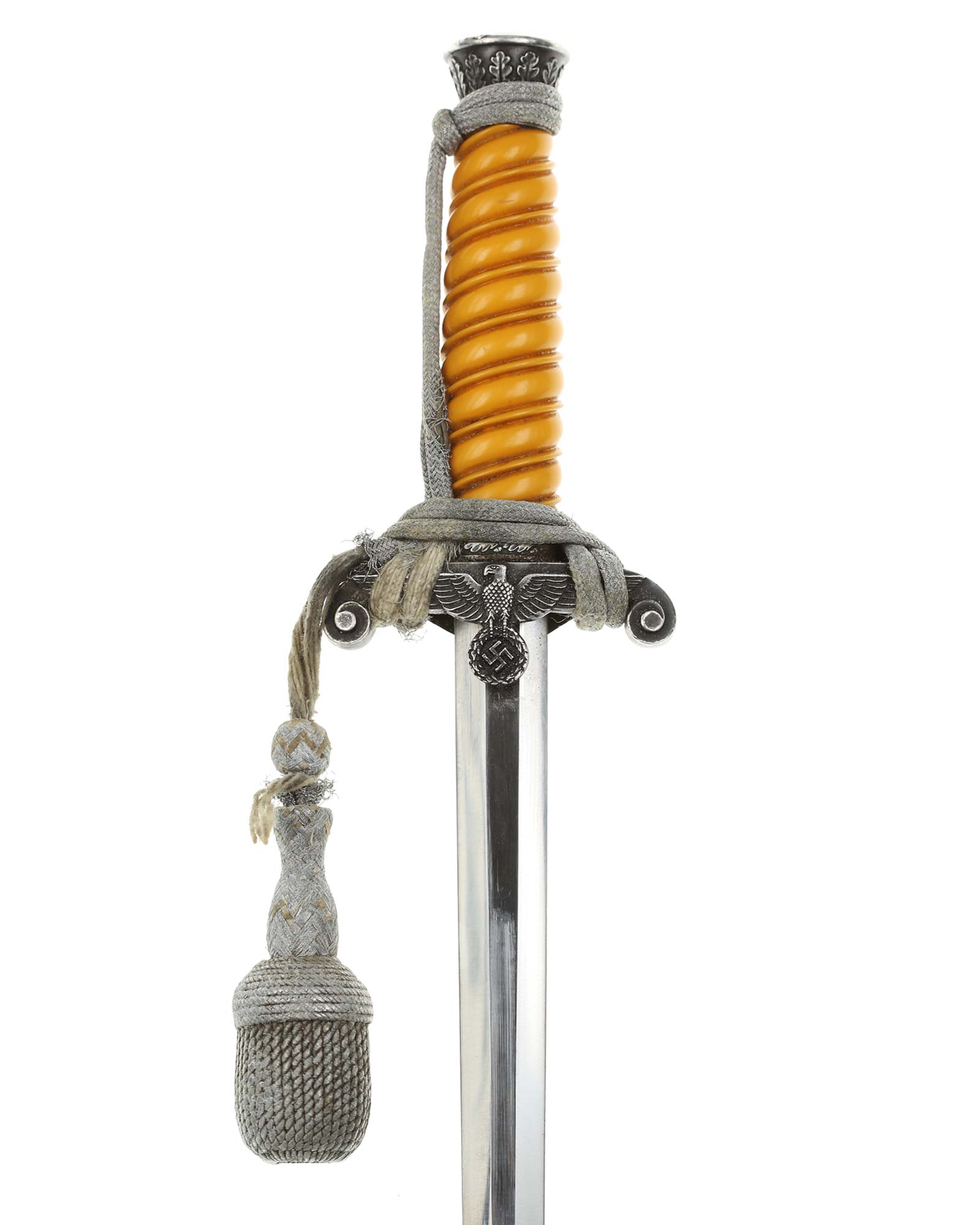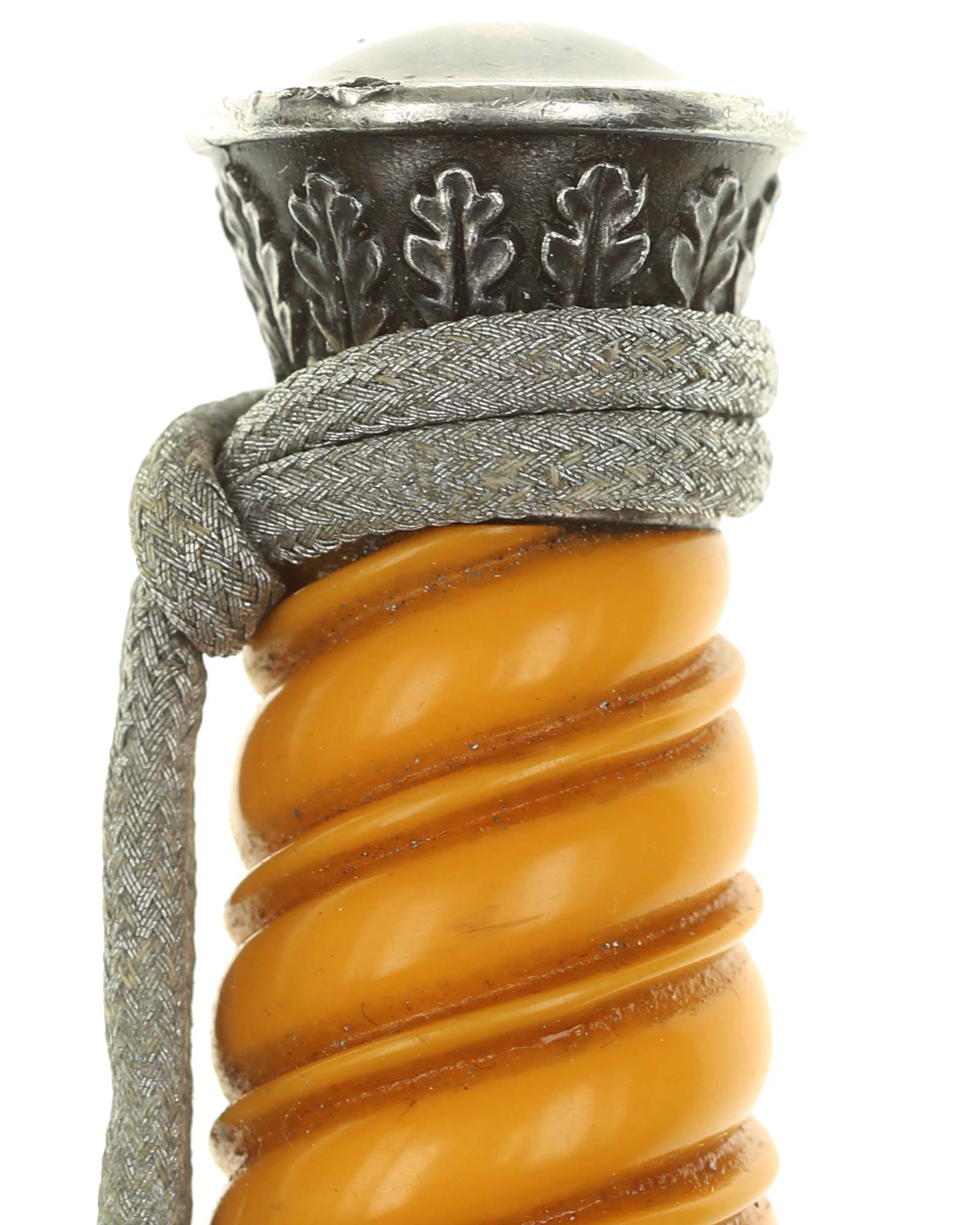 Griff: Der Griff ist rund mit zweifach verdrehten Kanneluren. Der Griff besteht aus gelben Trolon. Die Form der Kanneluren ist konvex bzw. nach außen gewölbt. Der Knauf ist konisch und ist auf die Klingenangel festgeschraubt, er ist mit 12 Eichenlaubblätter verziert. Am unteren Ende des Griffes befindet sich der Griffring, der mit 6 Eichenblätter in einer Reihe nebeneinander verziert ist. Die Parierstange ist in Form eines Reichsadlers, der nach links schaut. Zu den beiden Enden hin wirbeln die Flügel nach unten. In der Mitte befindet sich der Adler, der in seinen Krallen einen Kranz mit dem Hakenkreuz festhält.
