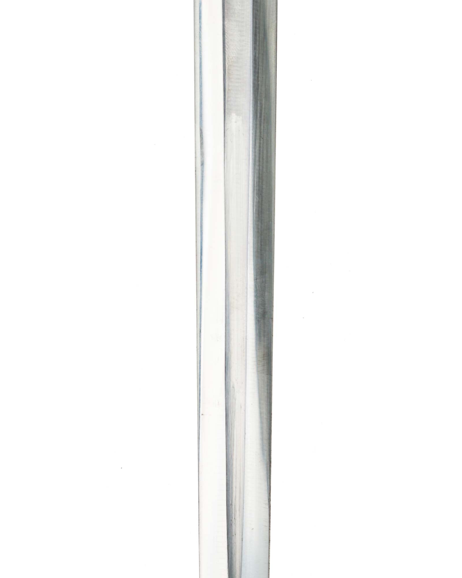 Klinge: Die Klinge ist sehr sauber im neuwertigen Zustand mit 100% vom sog. "Crossgrain". Auf der Rückseite der Klinge befindet sich das Herstellerlogo: Carl Eickhorn Solingen. Die Klingenspitze ist zu 100% noch erhalten und ungekürzt. Zwischen den Schultern der Klinge und der unteren Parierstange ist befindet sich das originale Stoßleder.
