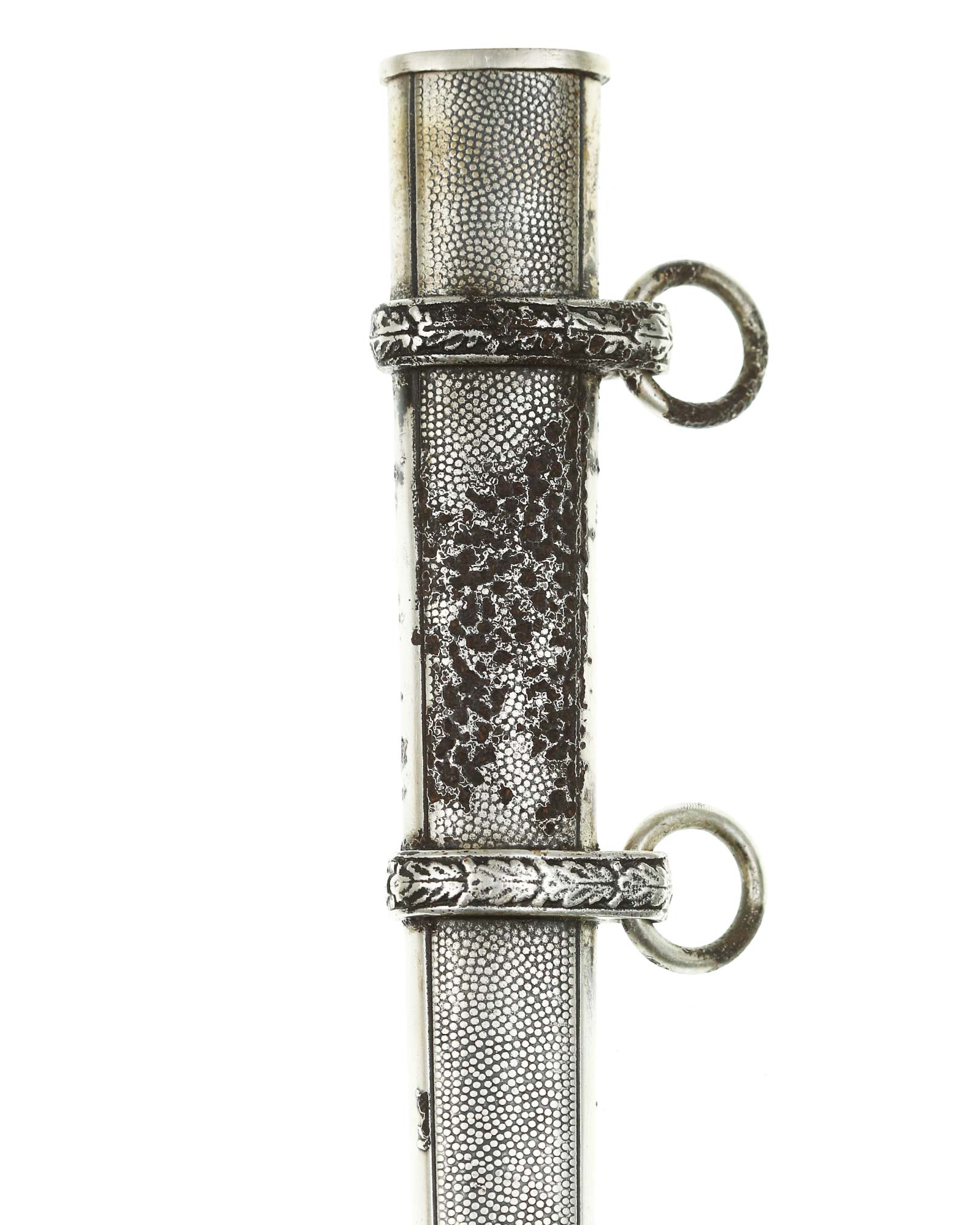 Scheide: Die Scheide besteht aus Mundblech und aus zwei Eichenlaub verzierten Scheidenbändern mit zwei losen Trageringen, diese sind komplett geschlossen. Die Scheide ist aus einem Stahlblech gezogen und auf der Vorder- und Rückseite mit körniger Oberflächenstruktur versehen. Die Spitze ist abgerundet und nicht eingedrückt. Das Mundstück ist separat eingesetzt und auf der Rückseite mit einer Schraube befestigt.