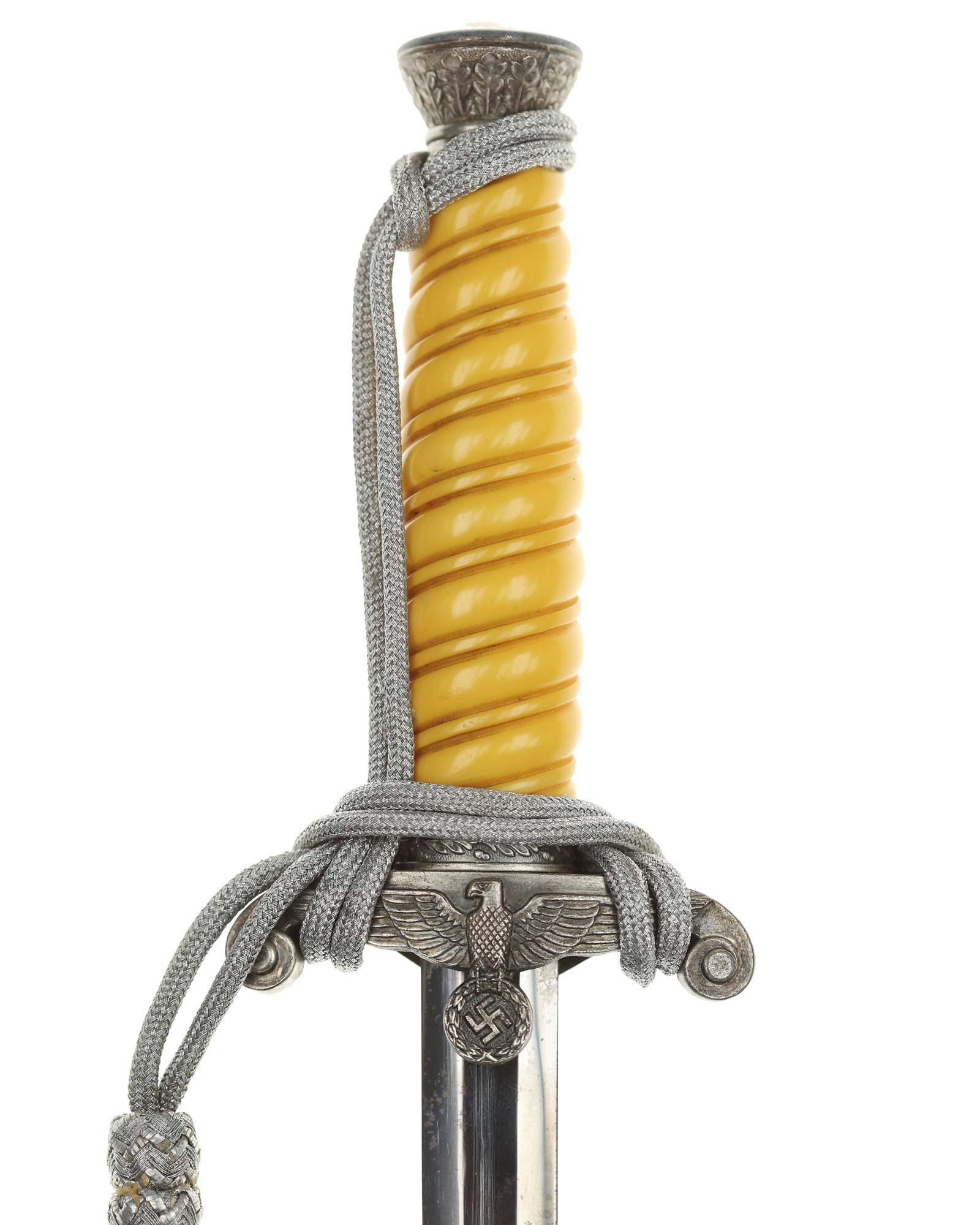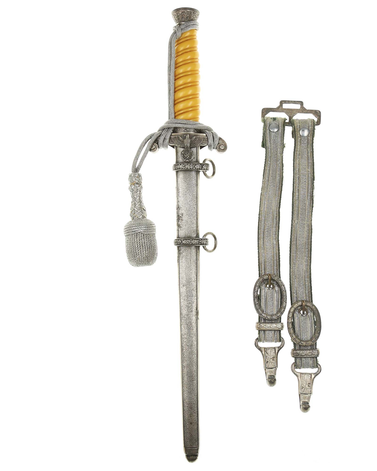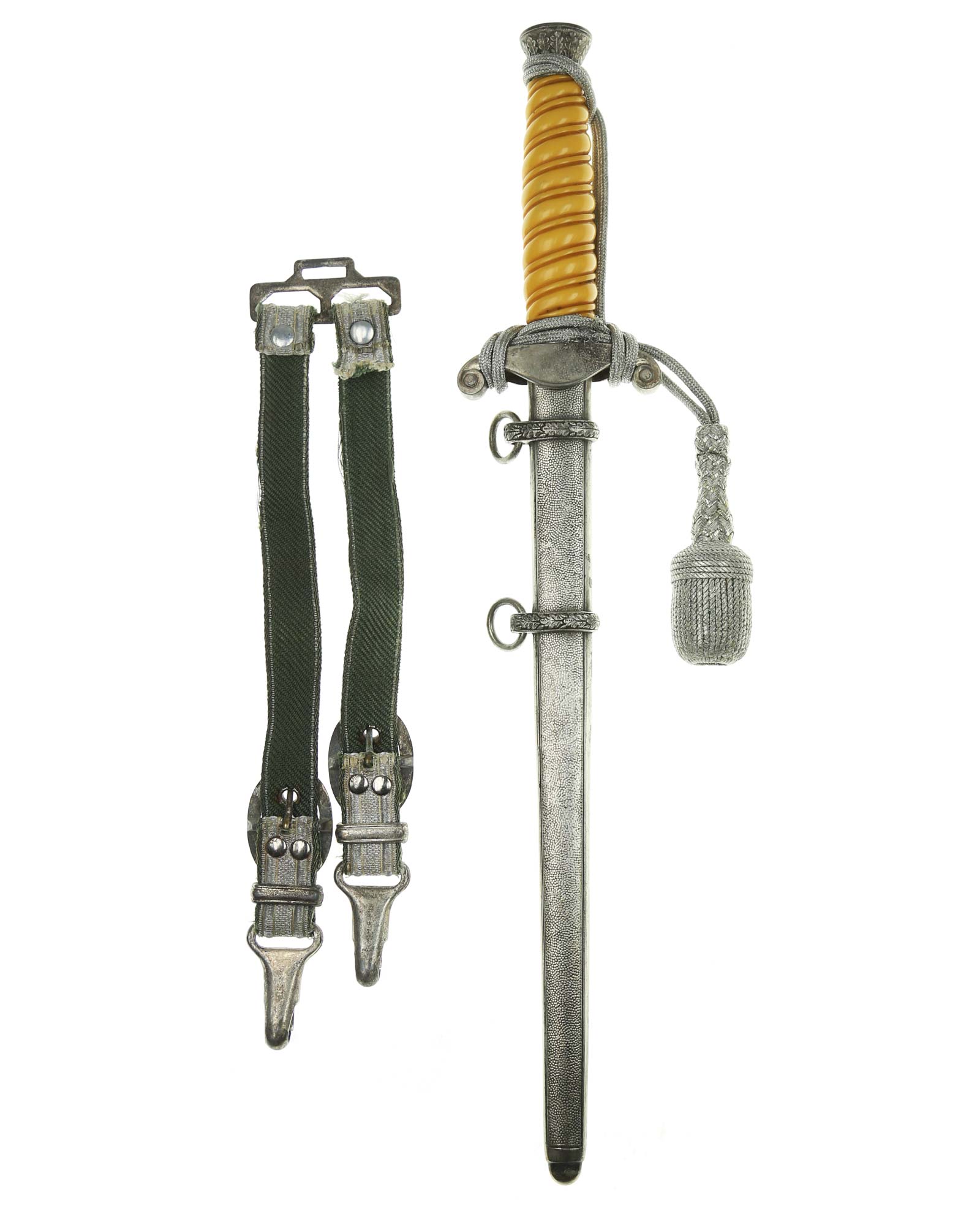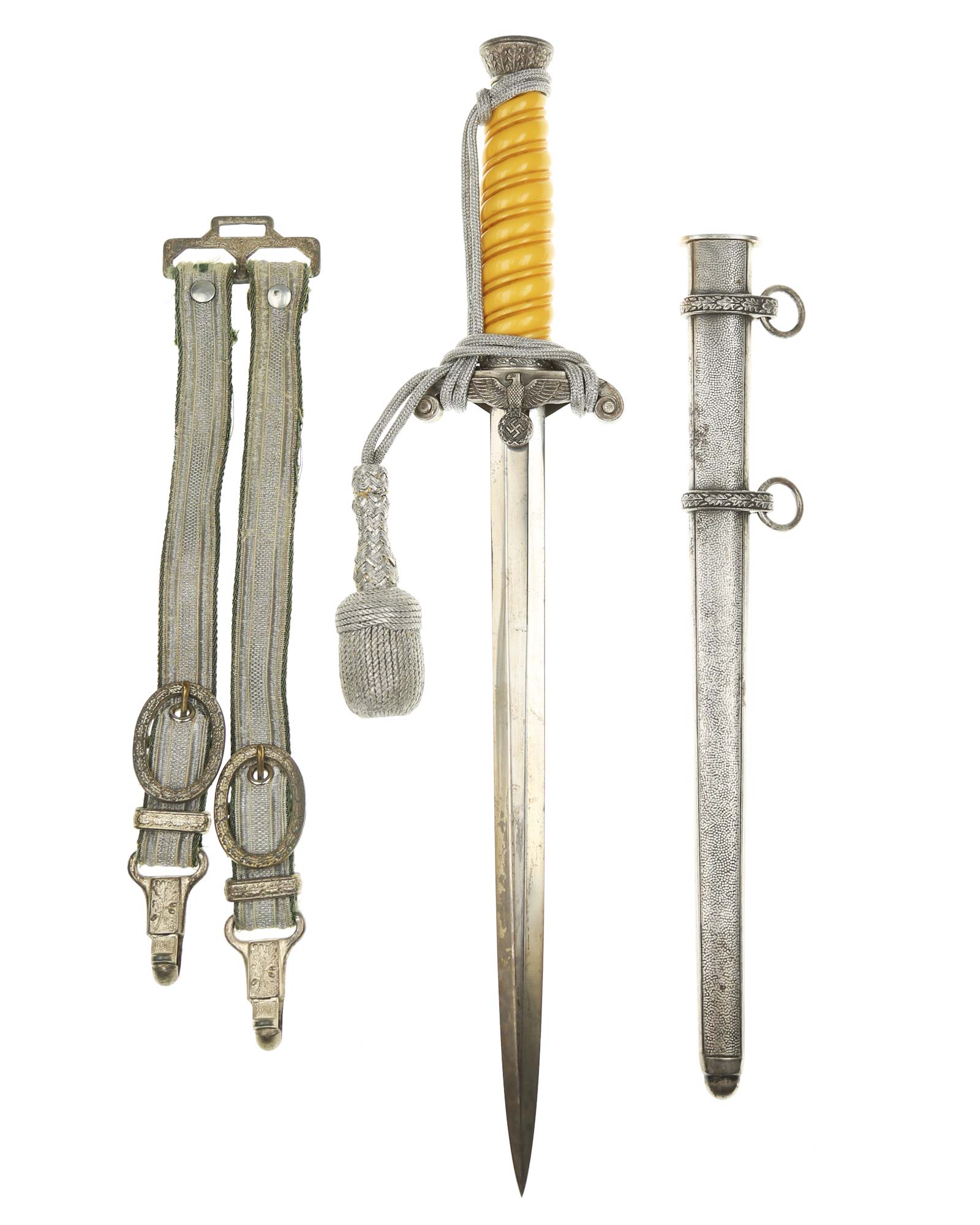 Dolch für Offiziere des Heeres. Modell 1935. Die Gesamtlänge beträgt 40,3 cm. Der Heeresdolch hat das Herstellerlogo: E.&F. Hörster Solingen. Der Heeresdolch ist zusammen mit einem Portepee und Gehänge.