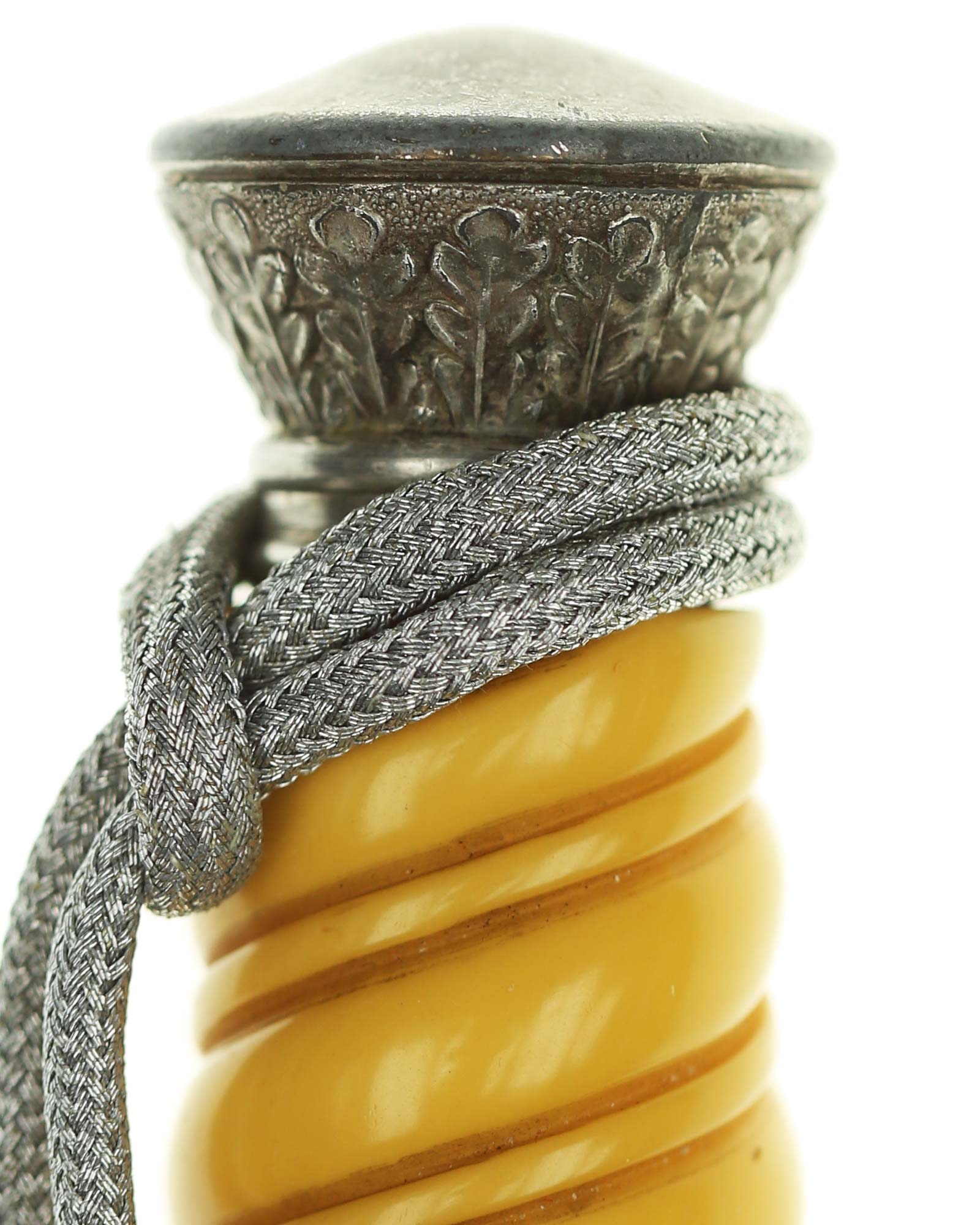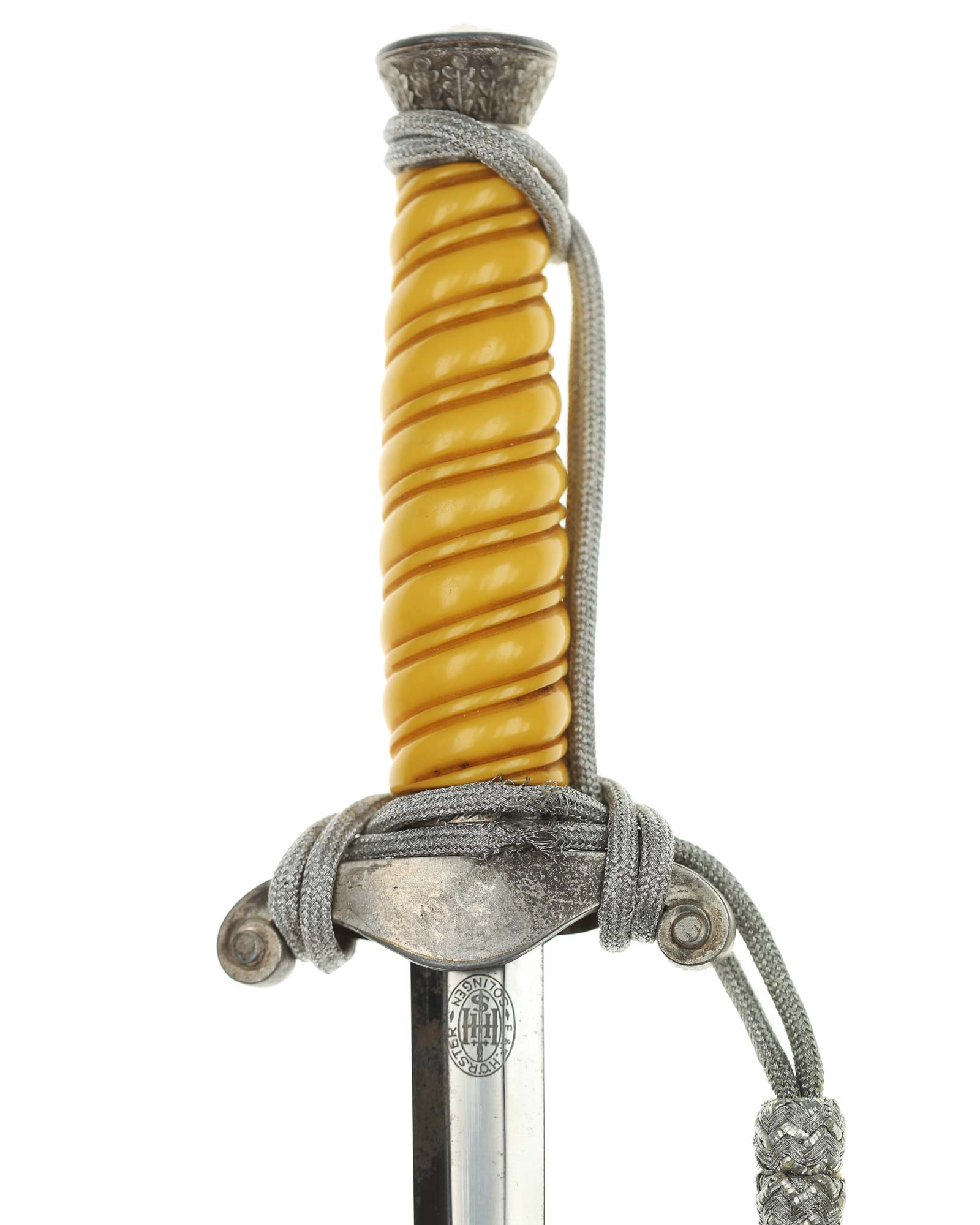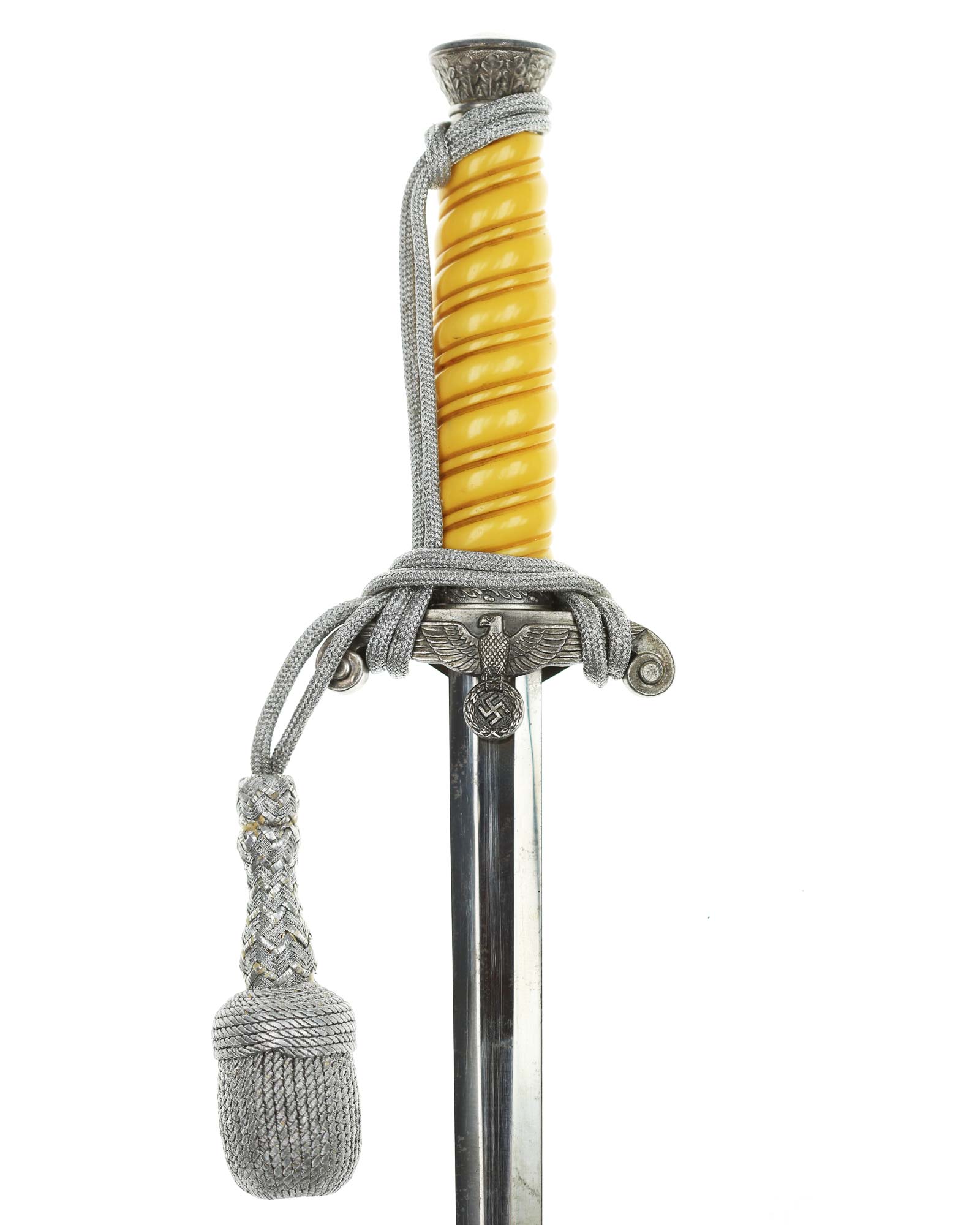 Griff: Der Griff ist rund mit zweifach verdrehten Kanneluren. Der Griff ist aus gelben Trolen. Die Form der Kanneluren ist konvex bzw. nach außen gewölbt. Der Knauf ist konisch und ist auf die Klingenangel festgeschraubt, dieser ist mit 14 Eichenlaubblätter verziert. Am unteren Ende des Griffes befindet sich der Griffring. Die Parierstange ist in Form eines Reichsadlers, der nach links schaut. Zu den beiden Enden hin wirbeln die Flügel nach unten. In der Mitte befindet sich der Adler, der in seinen Krallen einen Kranz mit dem Hakenkreuz festhält.