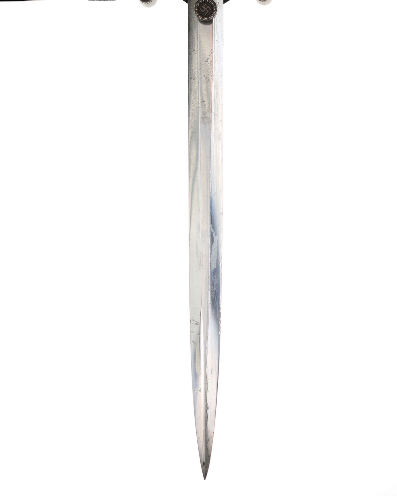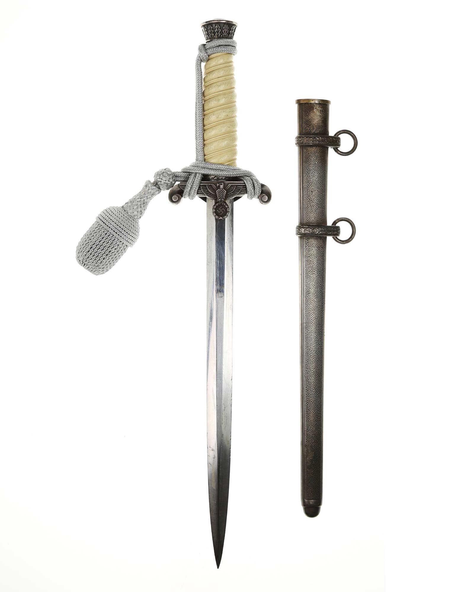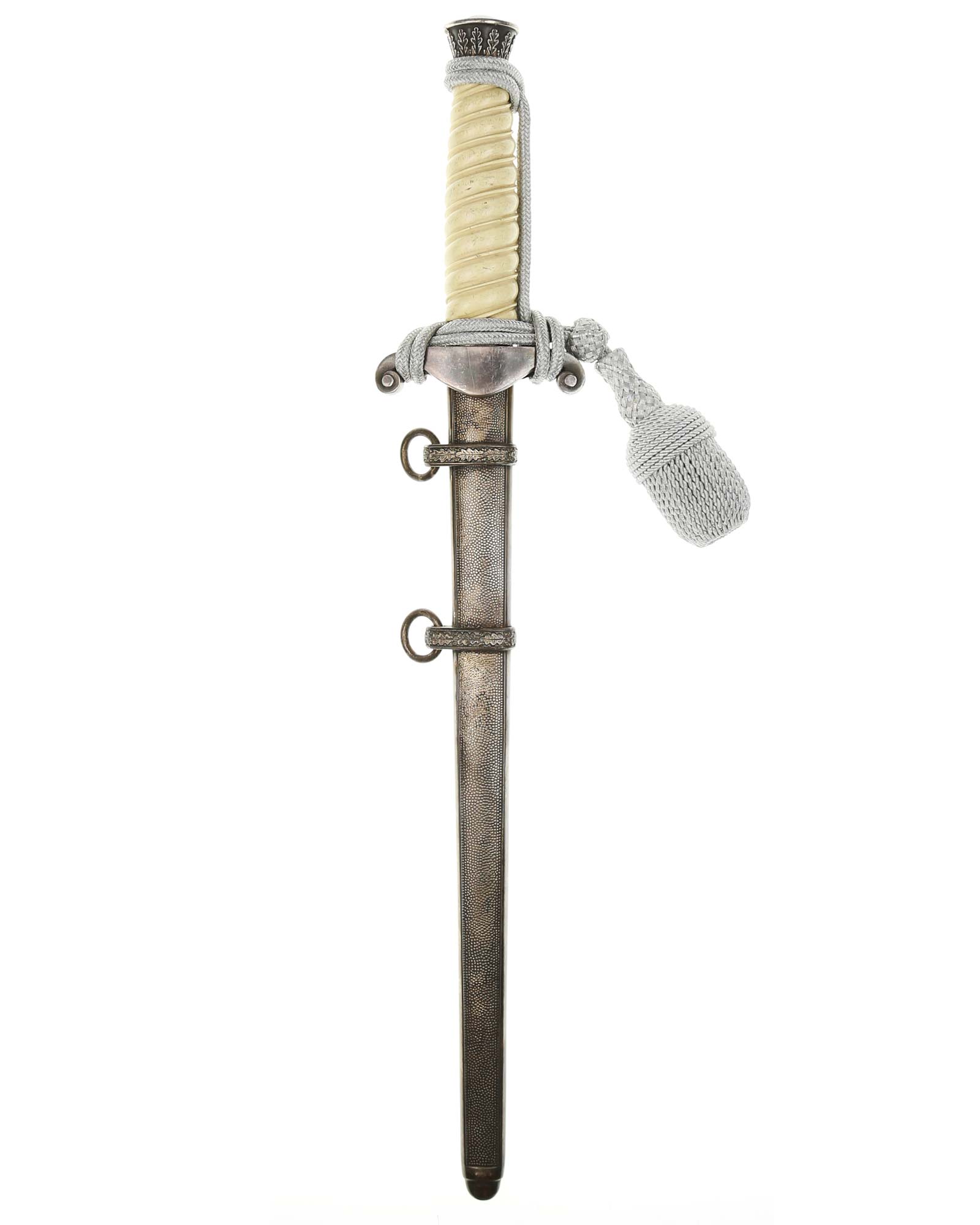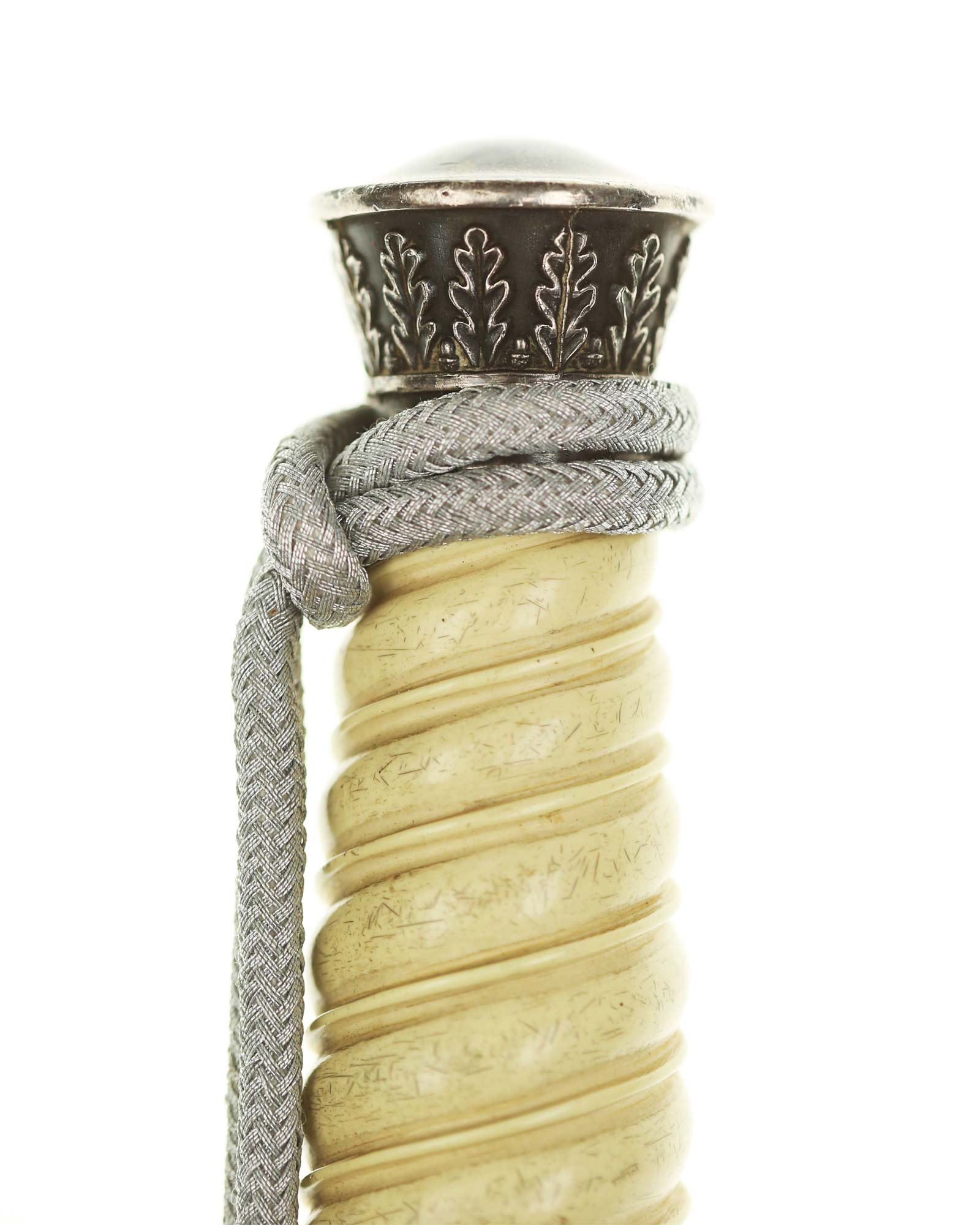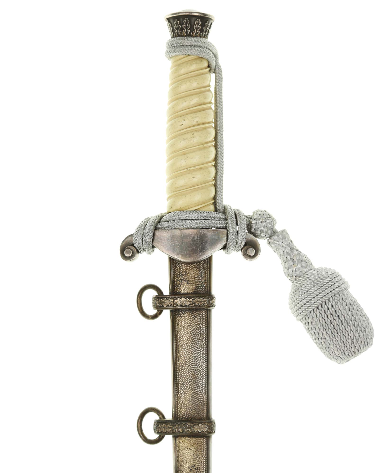 Griff: Der Griff ist rund mit zweifach verdrehten Kanneluren. Der Griff ist aus weißem Zelluloid. Die Form der Kanneluren ist konvex bzw. nach außen gewölbt. Der Knauf ist konisch und ist auf die Klingenangel festgeschraubt, er ist mit 12 Eichenlaubblätter verziert. Am unteren Ende des Griffes befindet sich der Griffring, der mit 6 Eichenblätter in einer Reihe nebeneinander verziert ist. Die Parierstange ist in Form eines Reichsadlers, der nach links schaut. Zu den beiden Enden hin wirbeln die Flügel nach unten. In der Mitte befindet sich der Adler, der in seinen Krallen einen Kranz mit dem Hakenkreuz festhält.