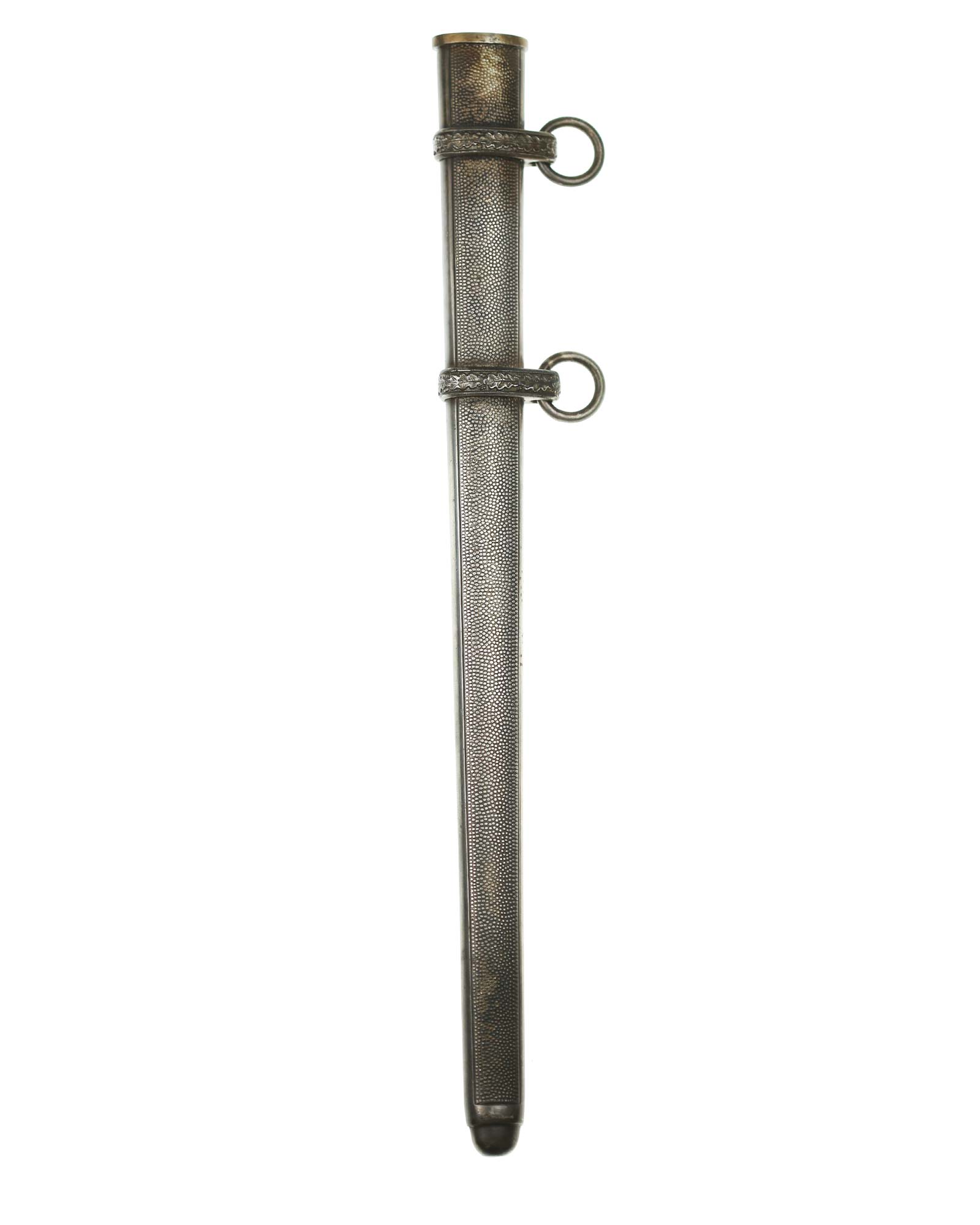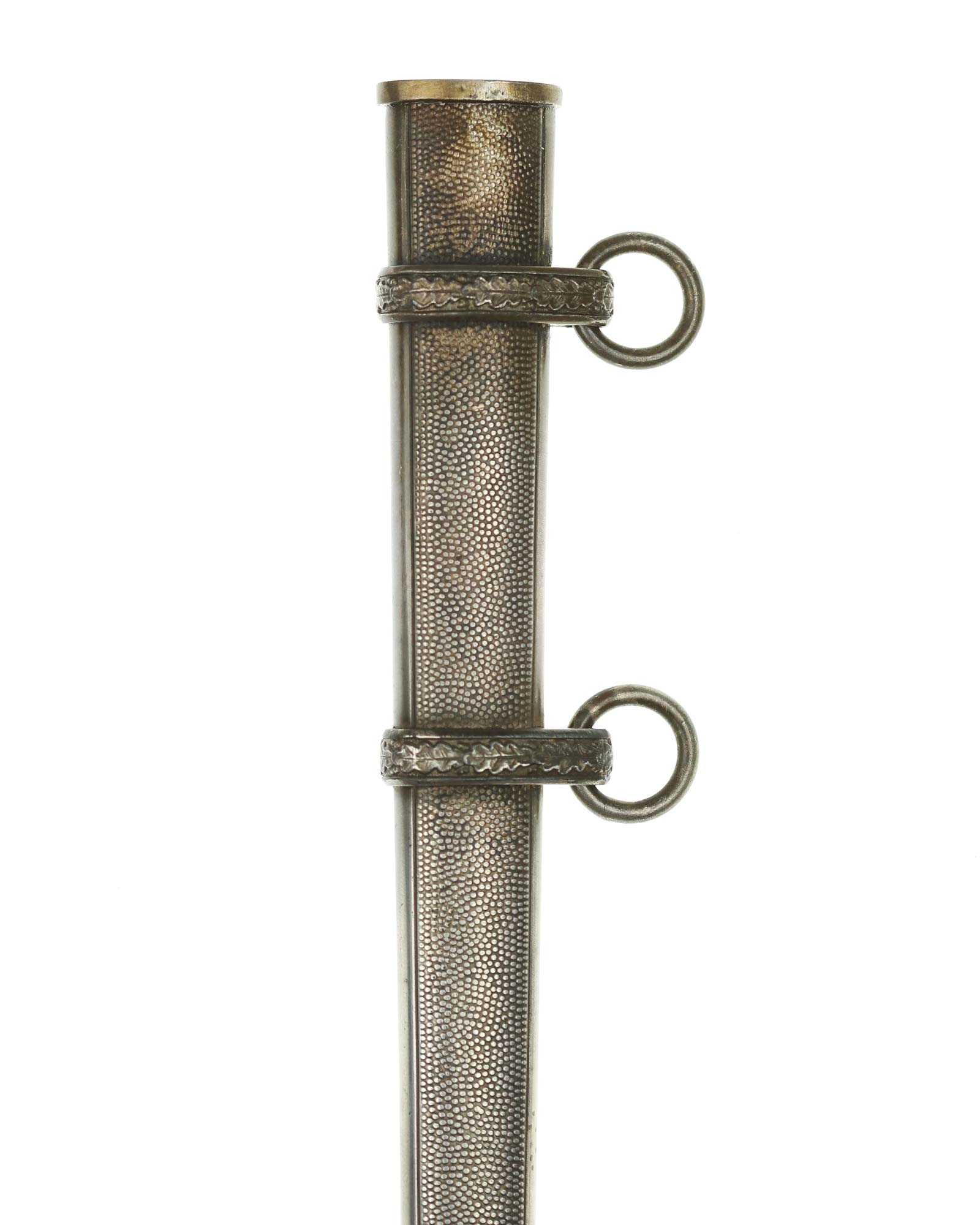 Scheide: Die Scheide besteht aus Mundblech und aus zwei Eichenlaub verzierten Scheidenbändern mit zwei losen Trageringen, diese sind komplett geschlossen. Die Scheide ist aus einem Stück Stahlblech gezogen und auf der Vorder- und Rückseite mit körniger Oberflächenstruktur versehen. Die Spitze ist abgerundet und nicht eingedrückt. Das Mundstück ist separat eingesetzt und mit einer Schraube befestigt.