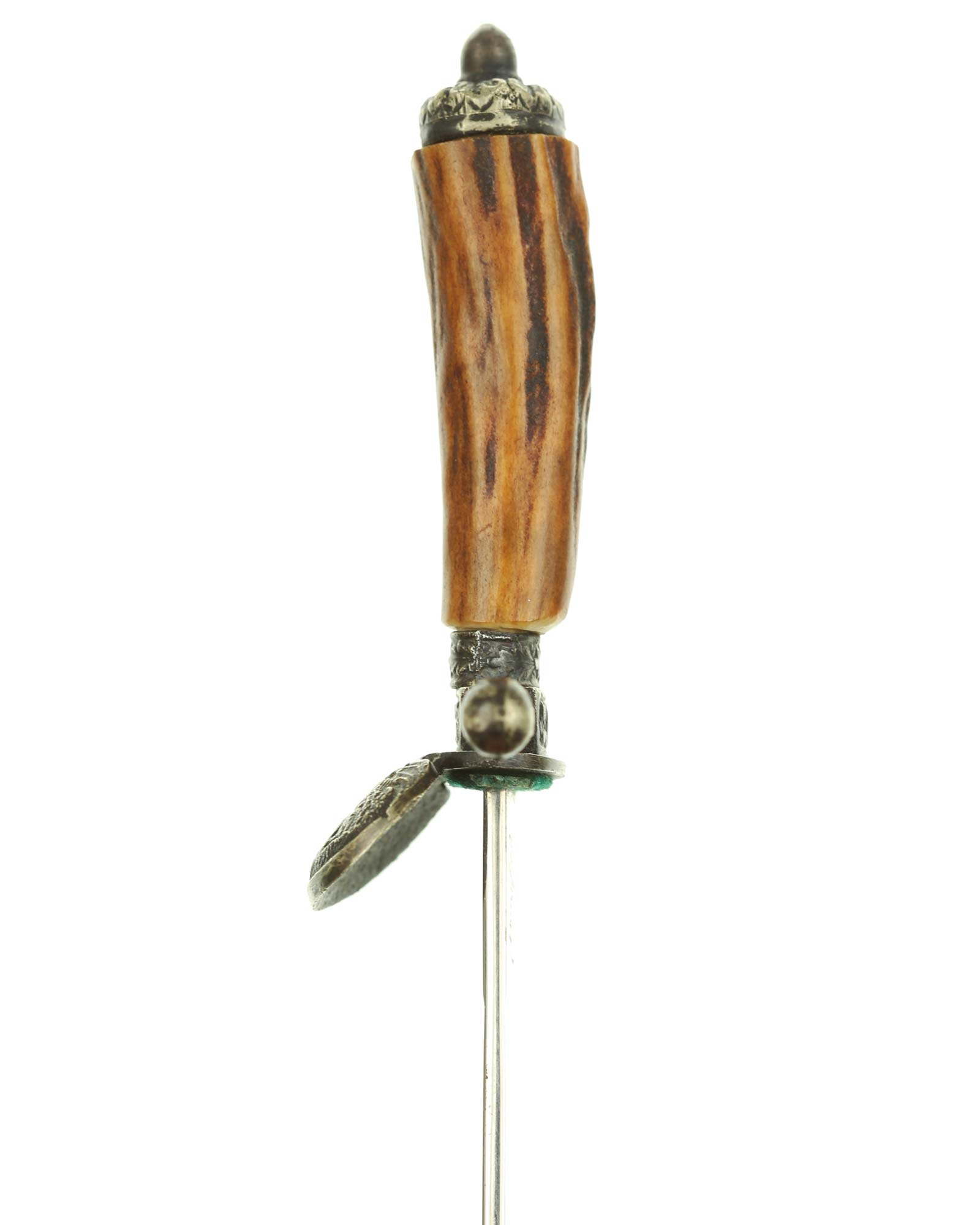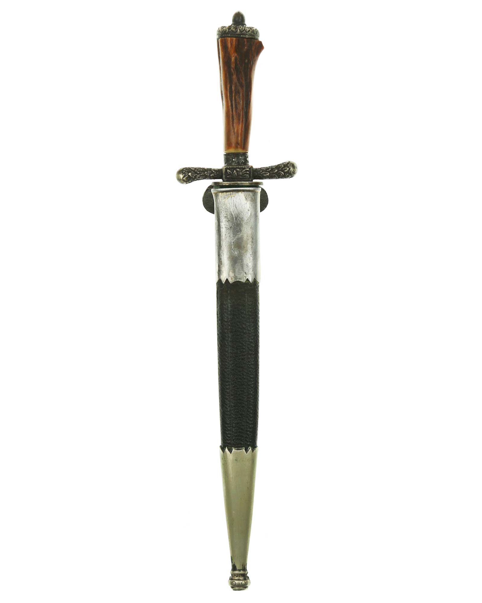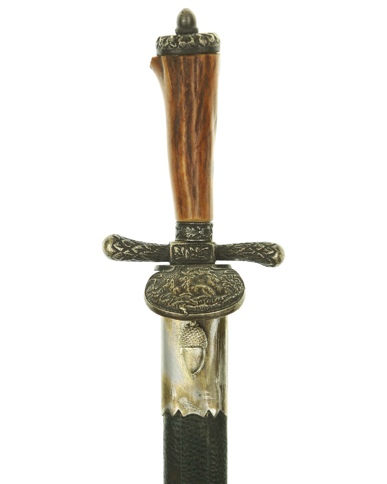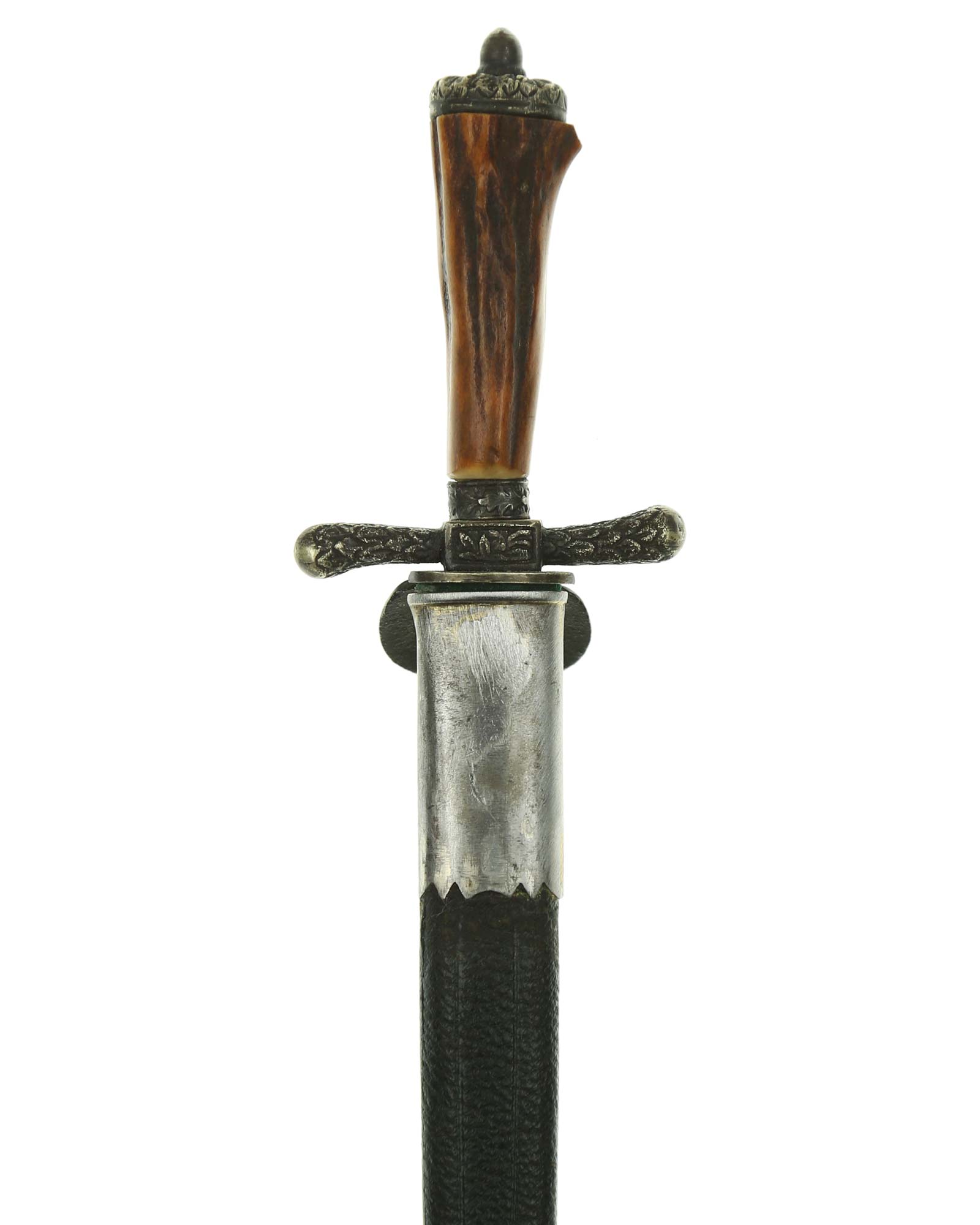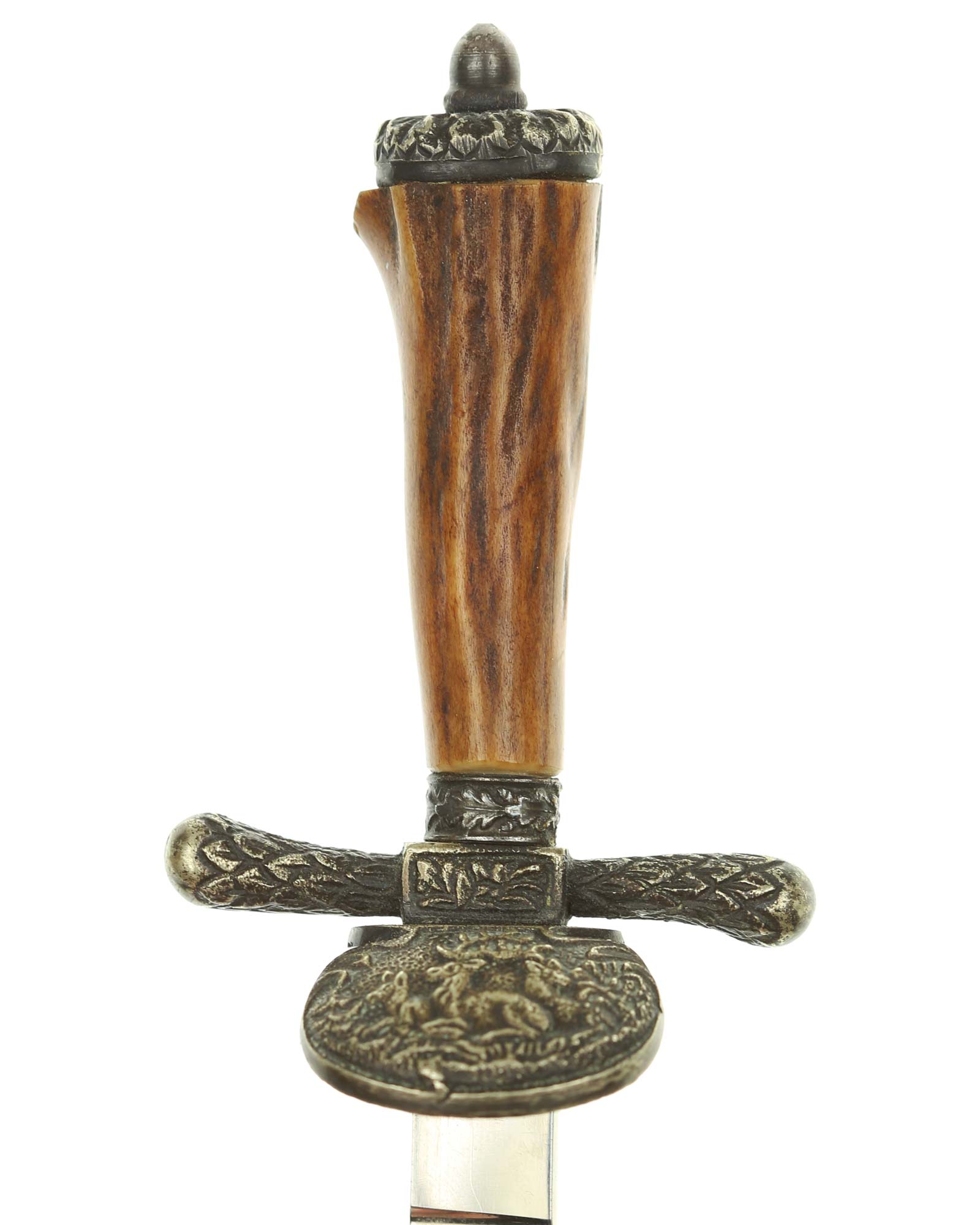 Griff: Hirschhorngriff mit versilberten Beschlägen. Parierstange in Form eines Rehhufs. Muschelförmiges Stichblatt.