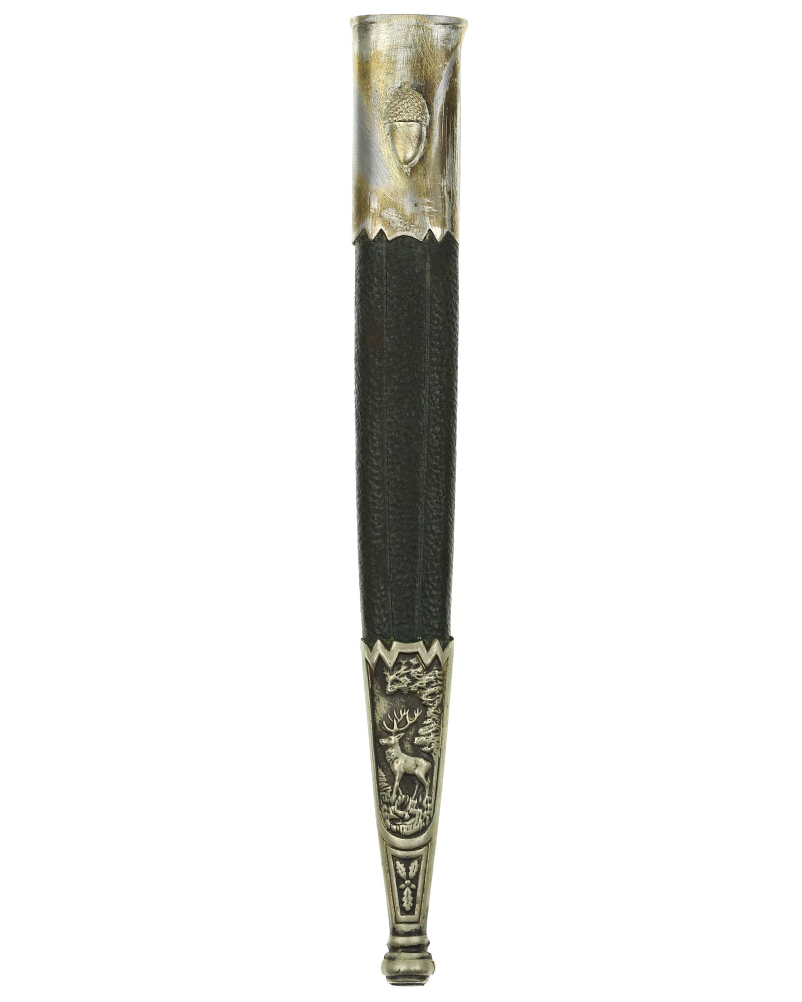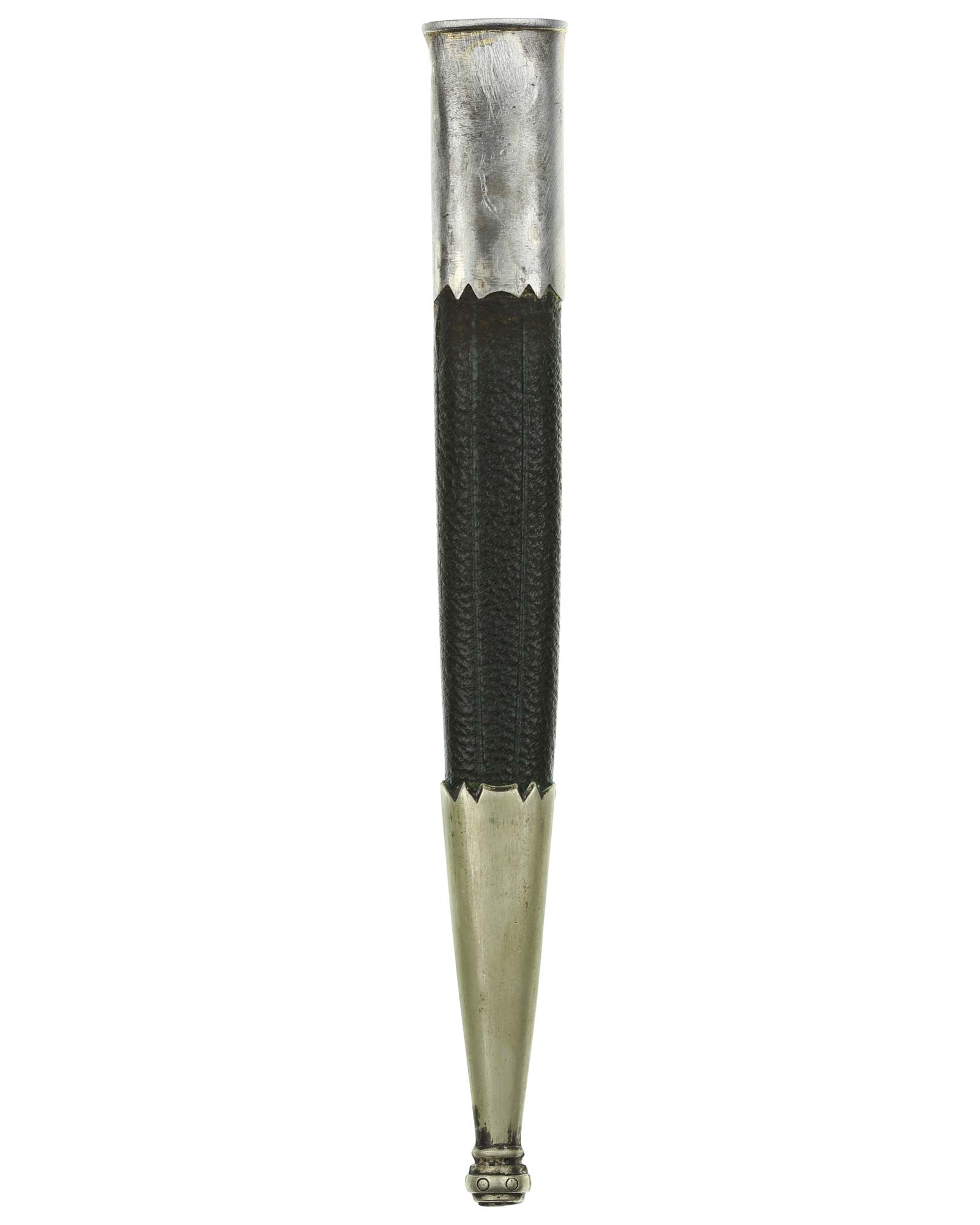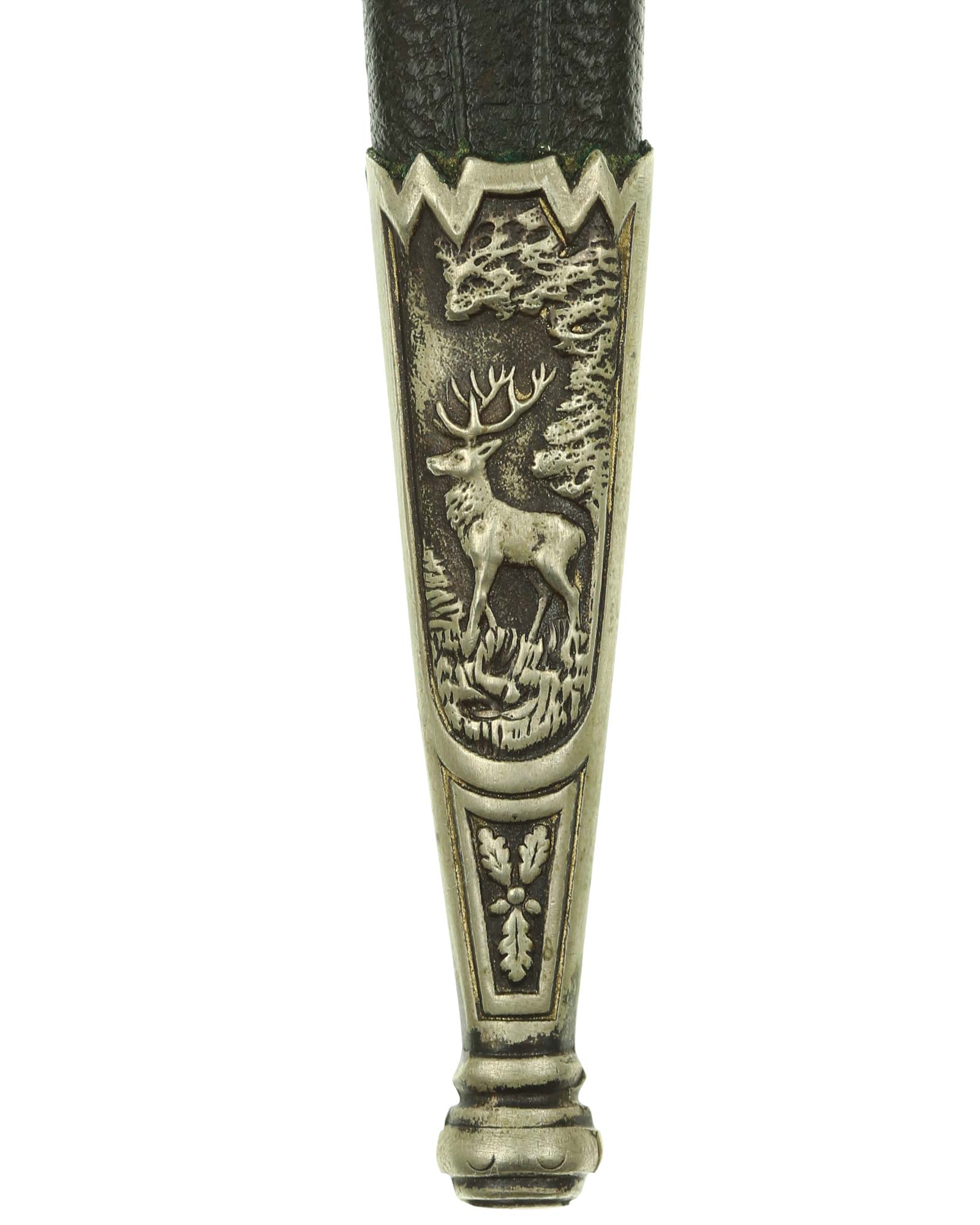 Scheide: Grüne Lederscheide mit versilberten Metallbeschlägen, diese ist gerade.