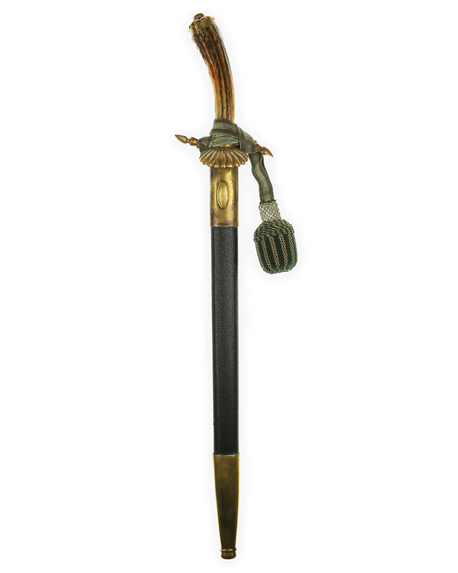 Hirschfänger für Förster mit beidseitiger Ätzung. Hirschhorngriff zur Seite gebogen. Schmaler Griffring und ovale Griffkappe mit Hutmutter verschraubt an der Klingenangel. Parierstange in Form von zwei Hirschbeinen, nach oben und unten zeigend. Stichblatt in Form einer Muschel. Die vernickelte Keilklinge ist mit geätzten Jagdszenen. Auf der Fehlschärfe befindet sich die frühe Herstellermarke E.&F. Hörster Solingen.