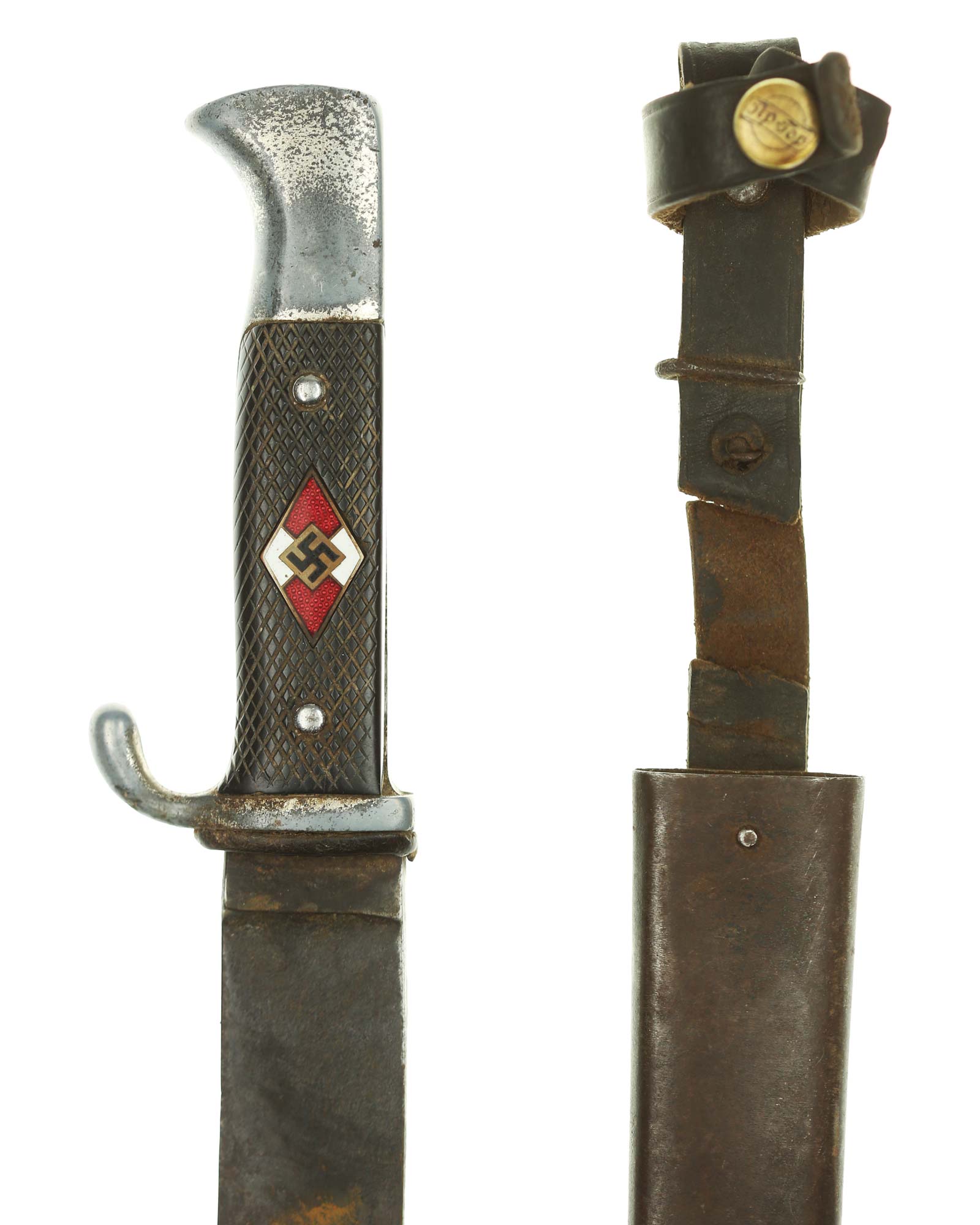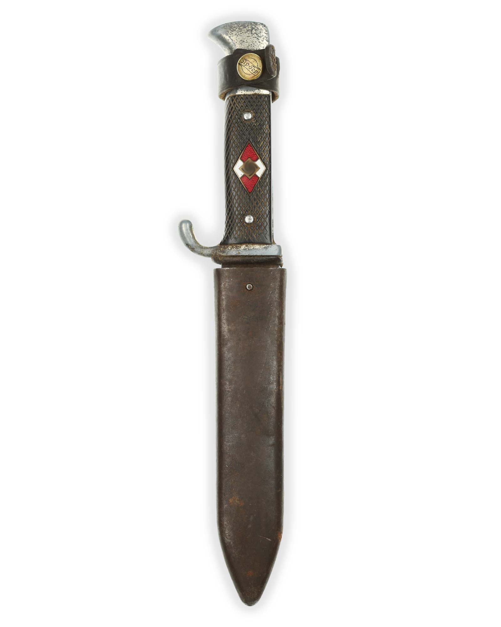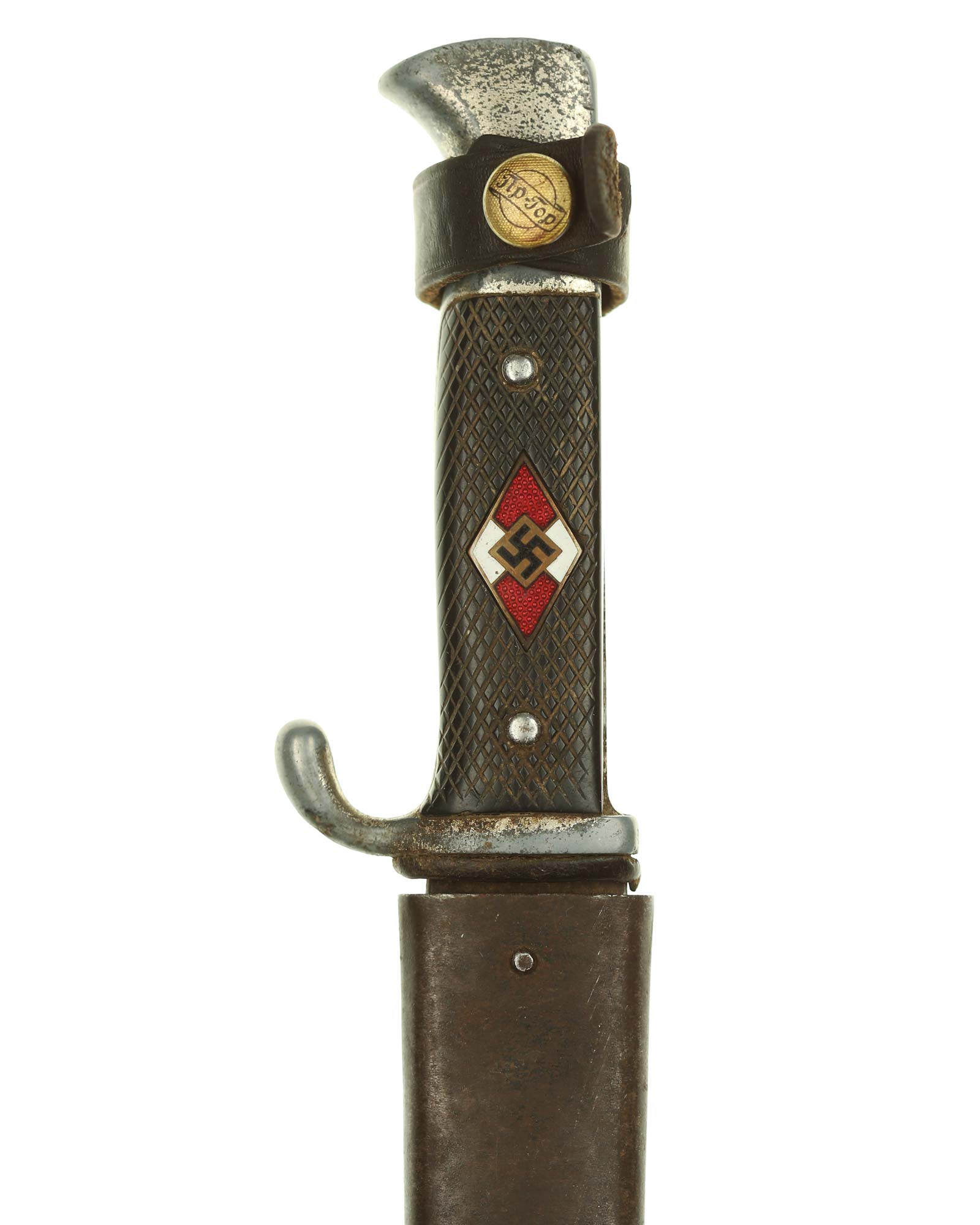 Griff: Vernietete Griffschalen, aus Bakelit mit Fischgrätenmuster in Tiefschwarz. Auf der vorderen Seite befindet sich, in der Mitte der Griffschale, das Hitler-Jugend-Abzeichen. Einseitig gebogene Parierstange bzw. Knebel.