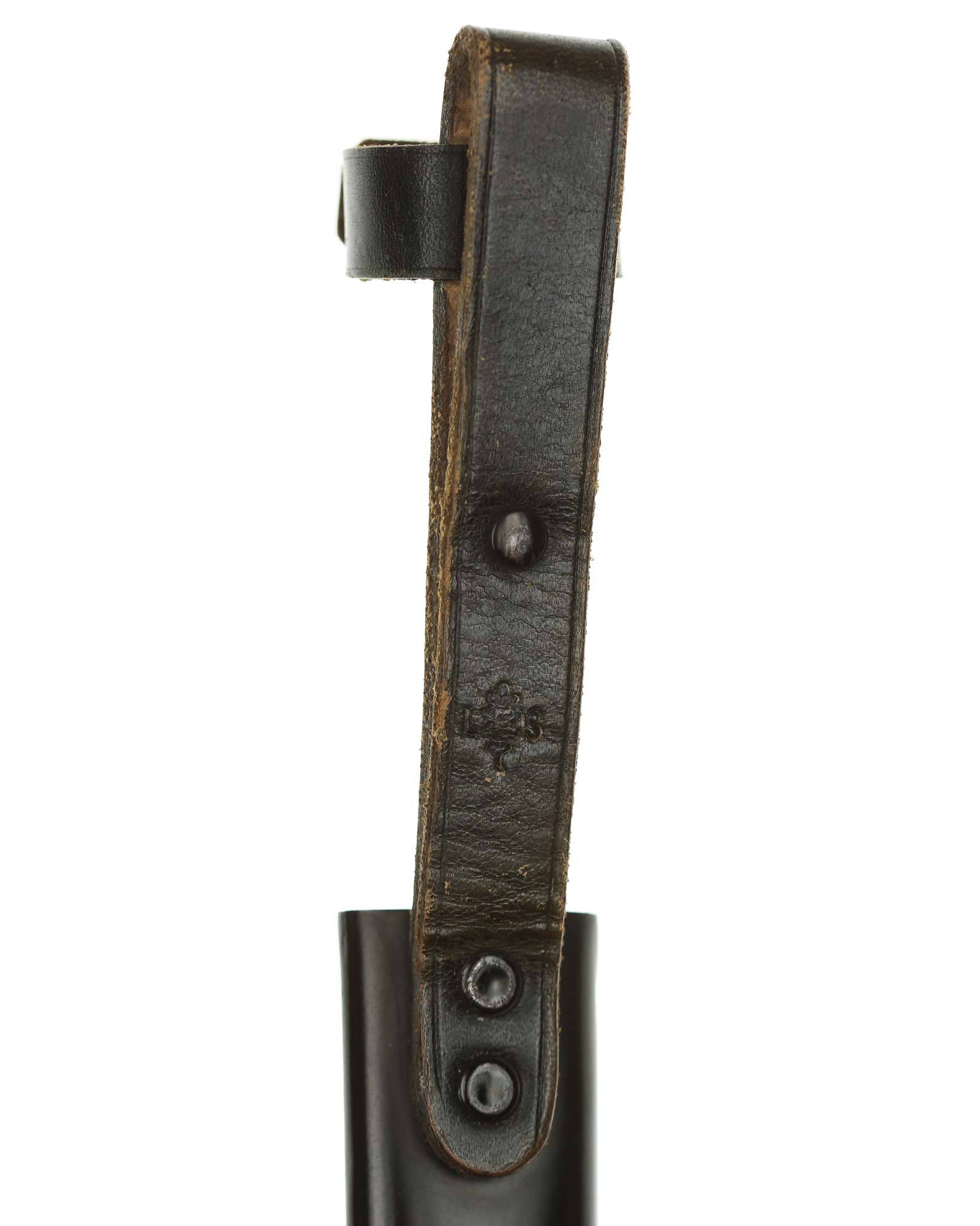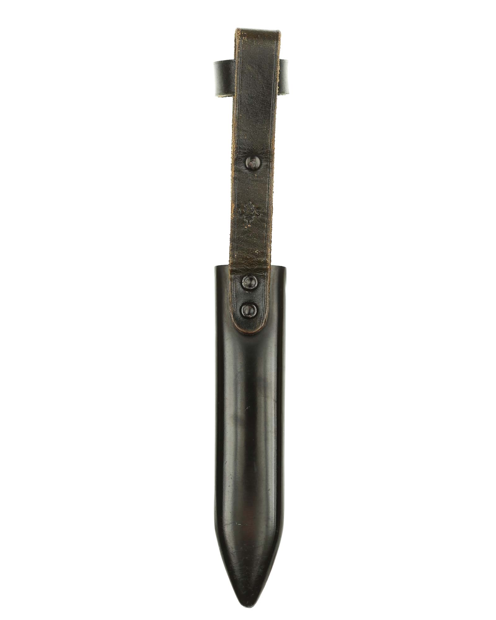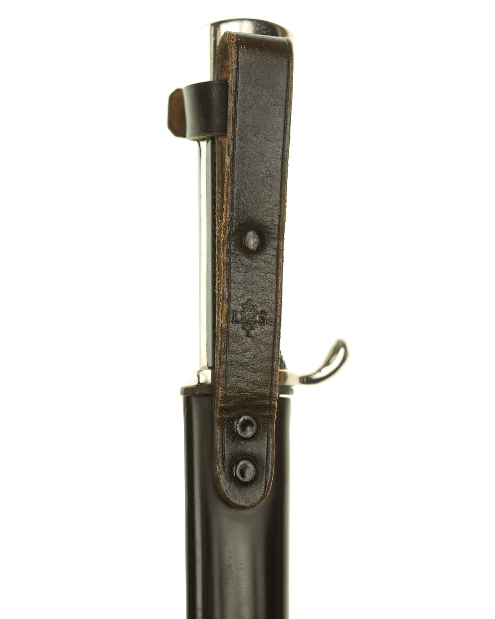 Scheide: Die Scheide ist aus Eisen und schwarzlackiert. Die Tragevorrichtung besteht aus einer Lederschlaufe, die aus einem doppelt gelegten Riemen besteht.