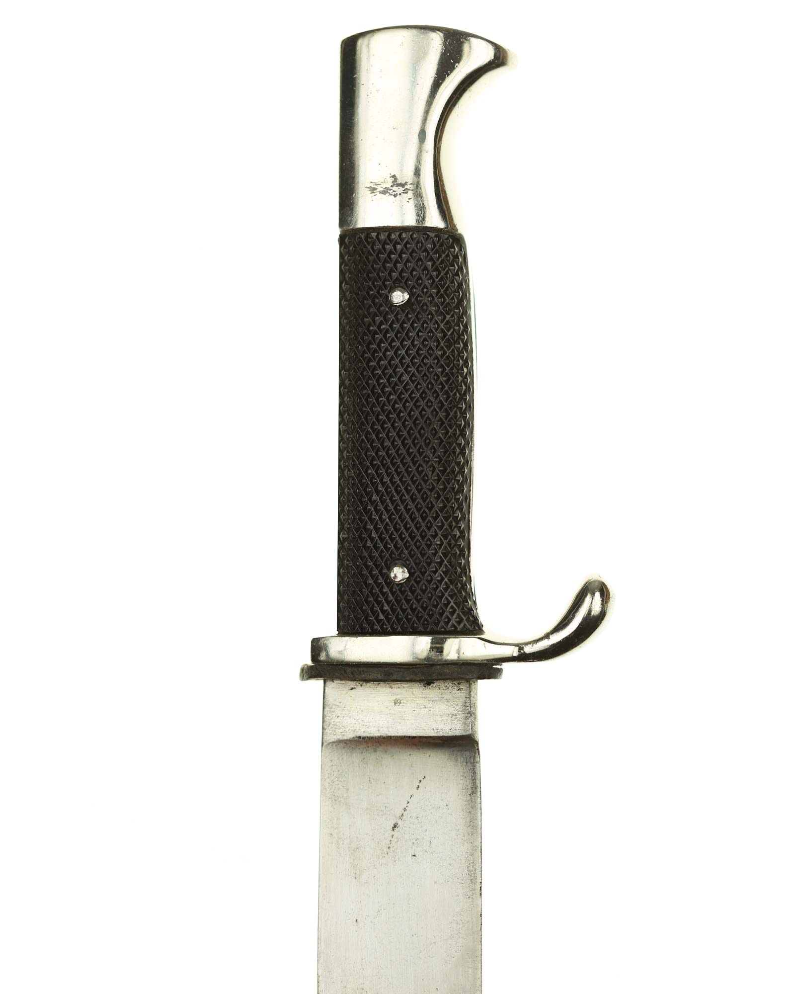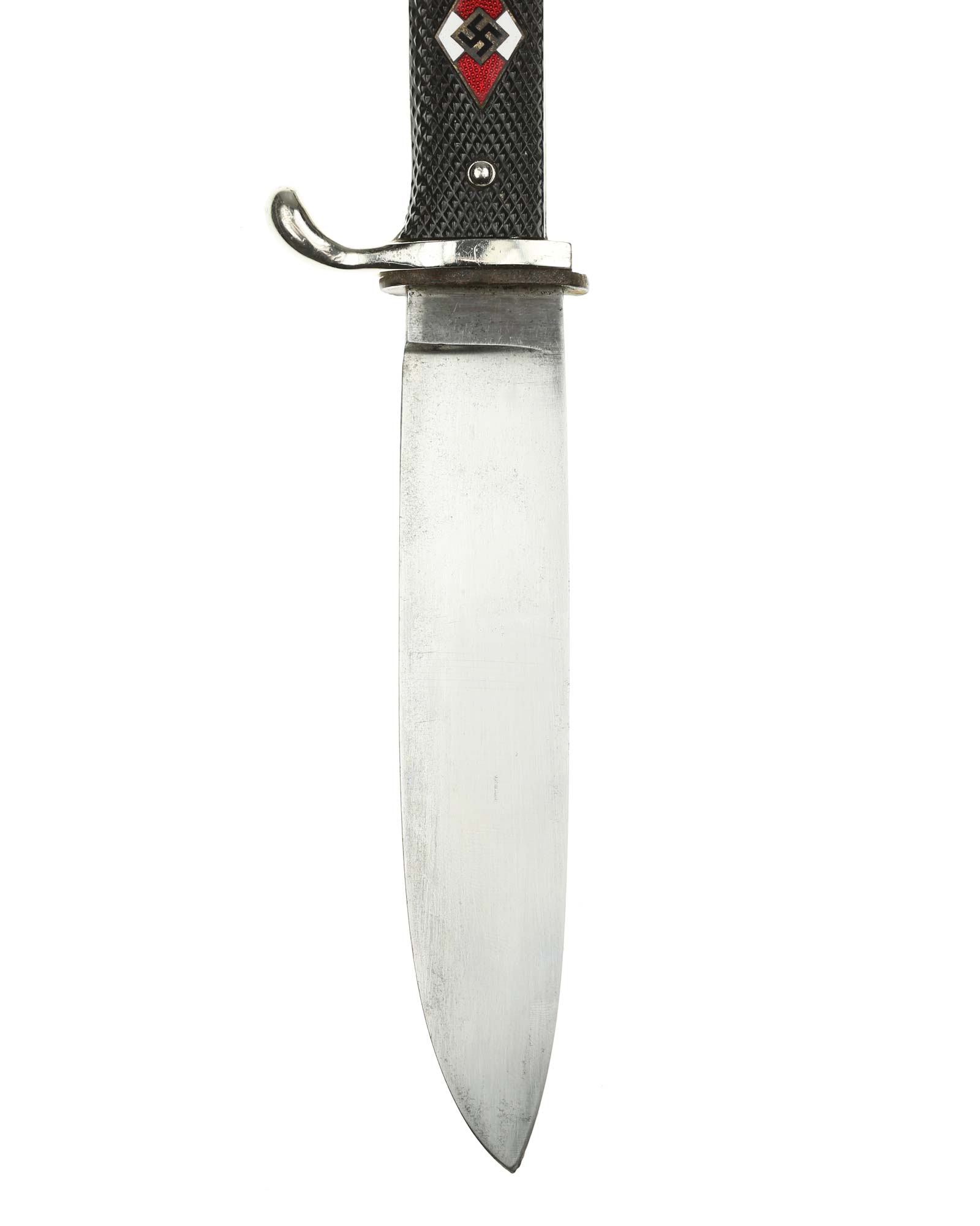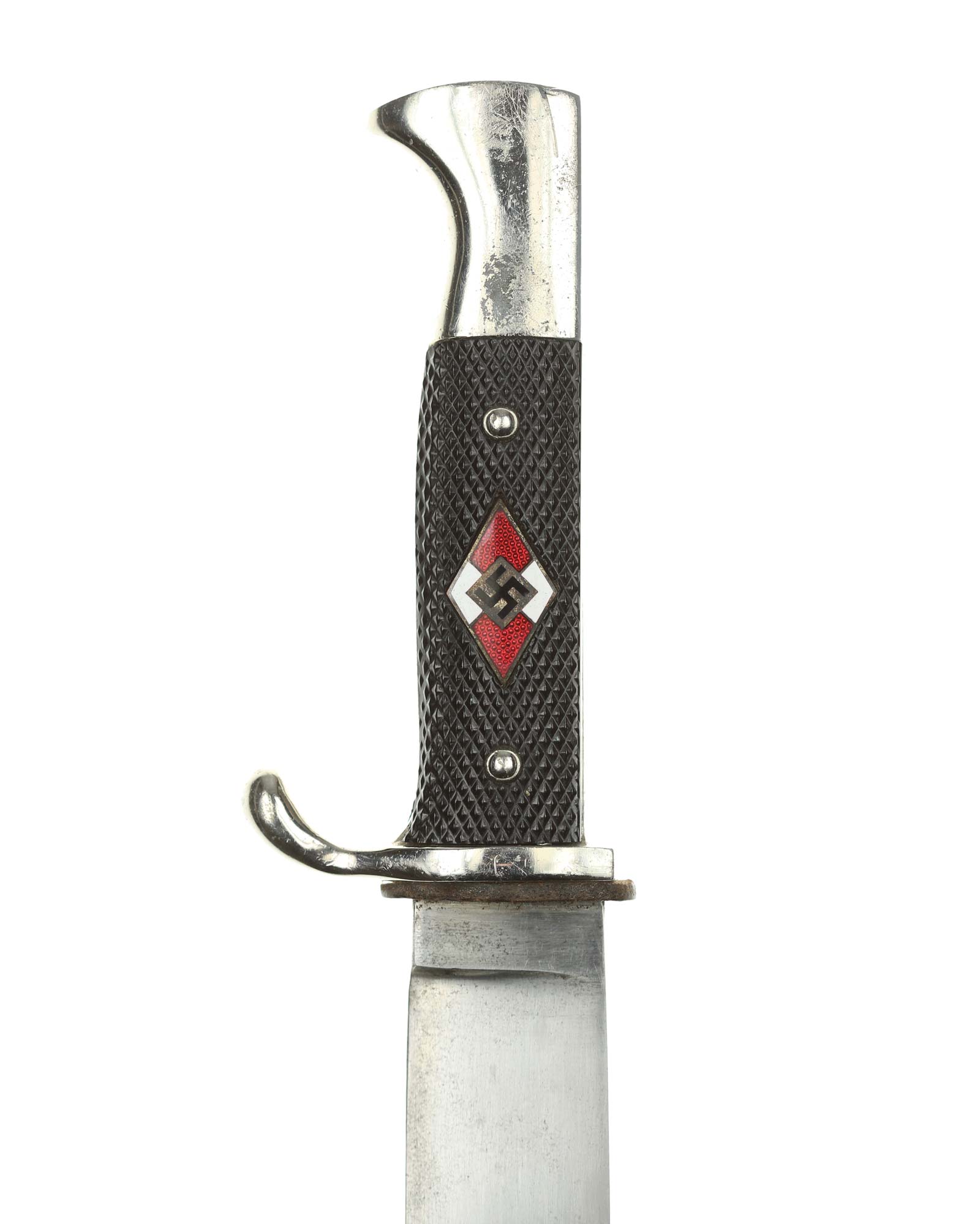 Griff: Vernietete Griffschalen, aus Bakelit mit Fischgrätenmuster in Tiefschwarz. Auf der vorderen Seite befindet sich, in der Mitte der Griffschale, das Hitler-Jugend-Abzeichen. Einseitig gebogene Parierstange bzw. Knebel.