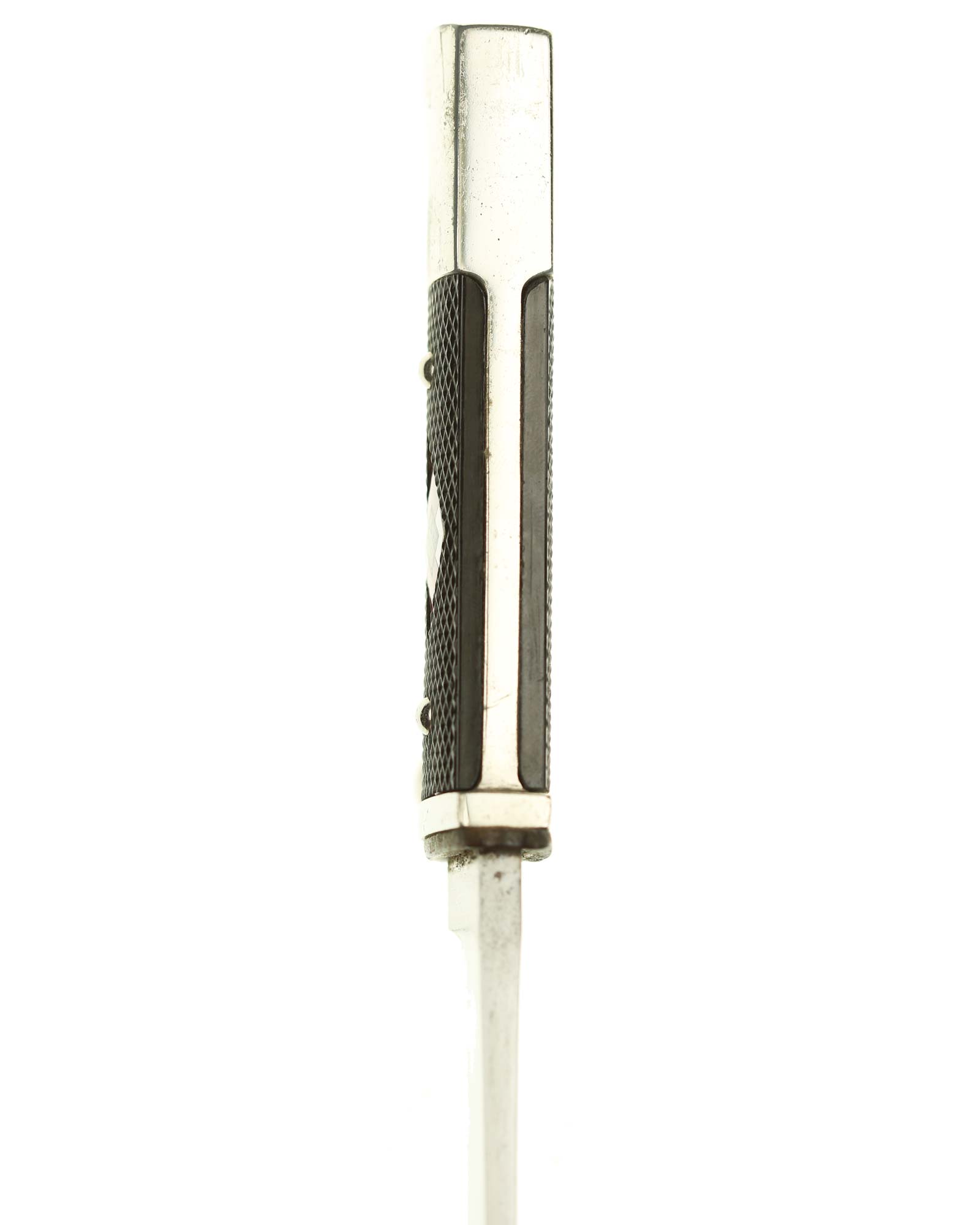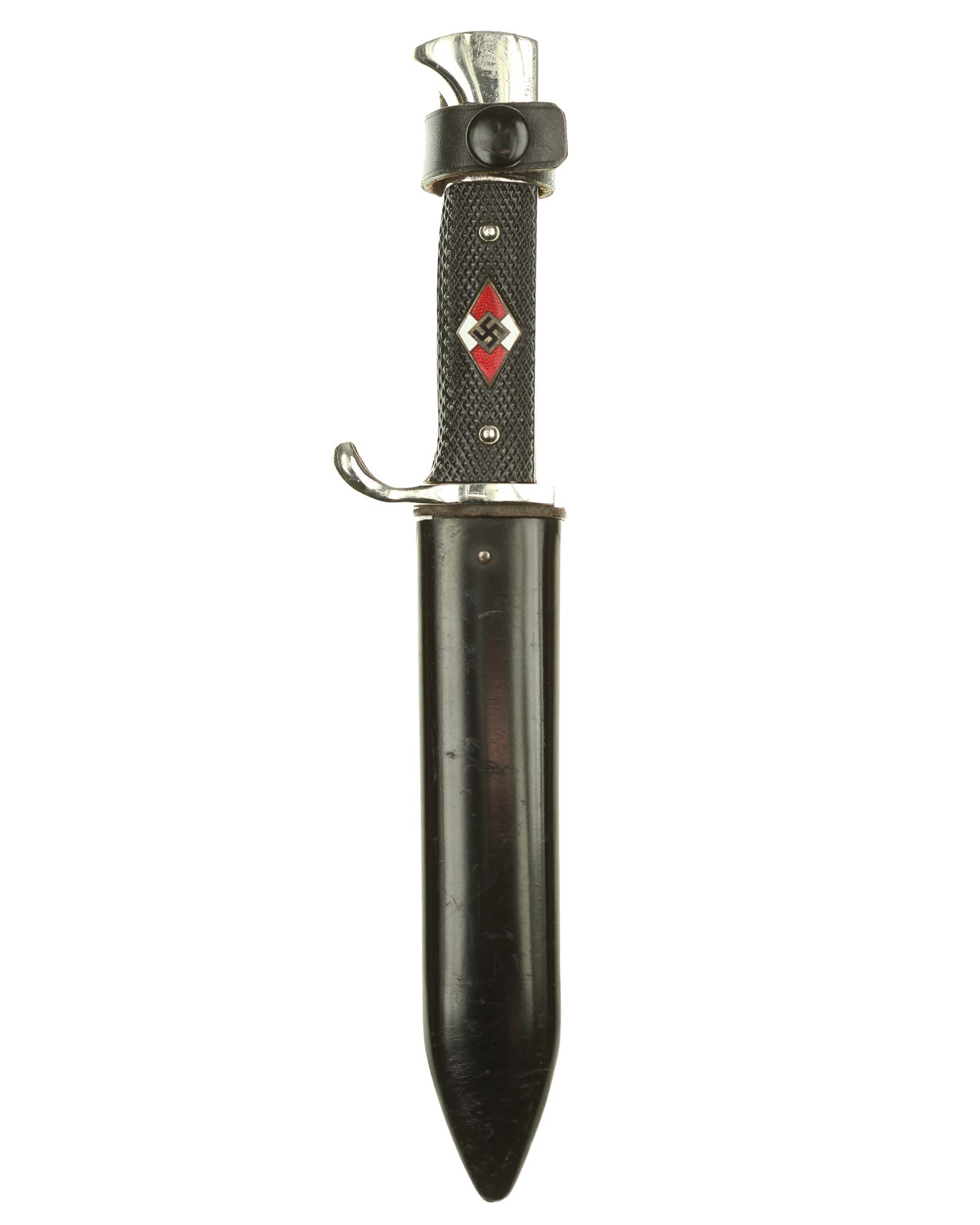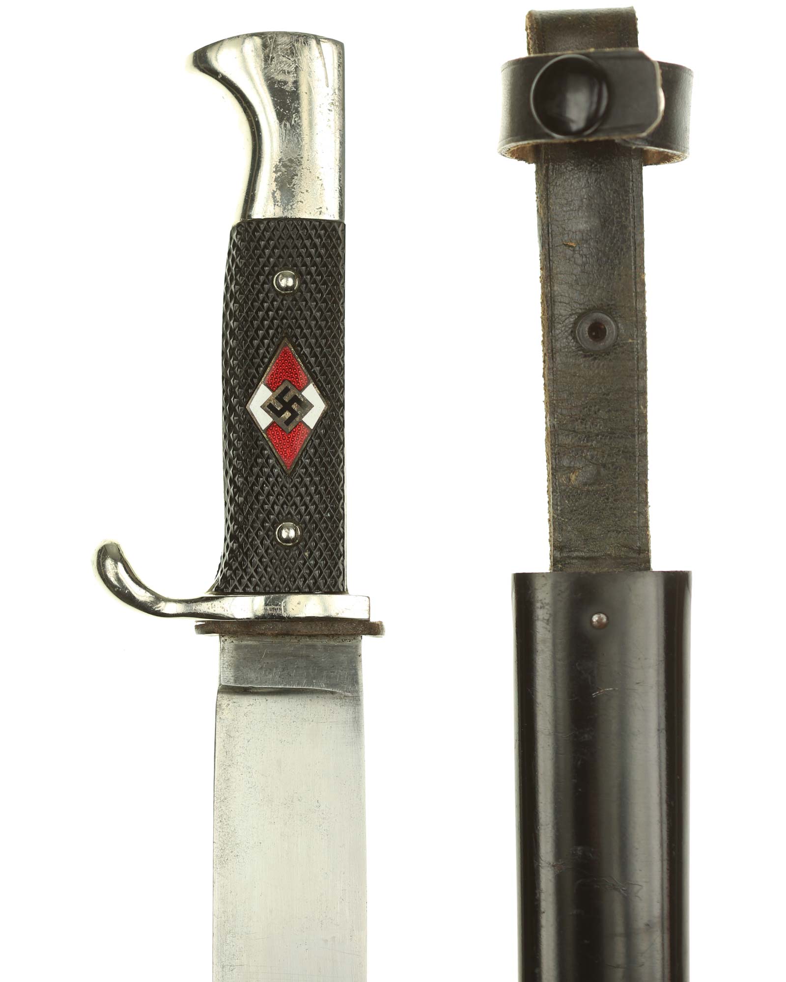 Griff: Vernietete Griffschalen, aus Bakelit mit Fischgrätenmuster in Tiefschwarz. Auf der vorderen Seite befindet sich, in der Mitte der Griffschale, das Hitler-Jugend-Abzeichen. Einseitig gebogene Parierstange bzw. Knebel.