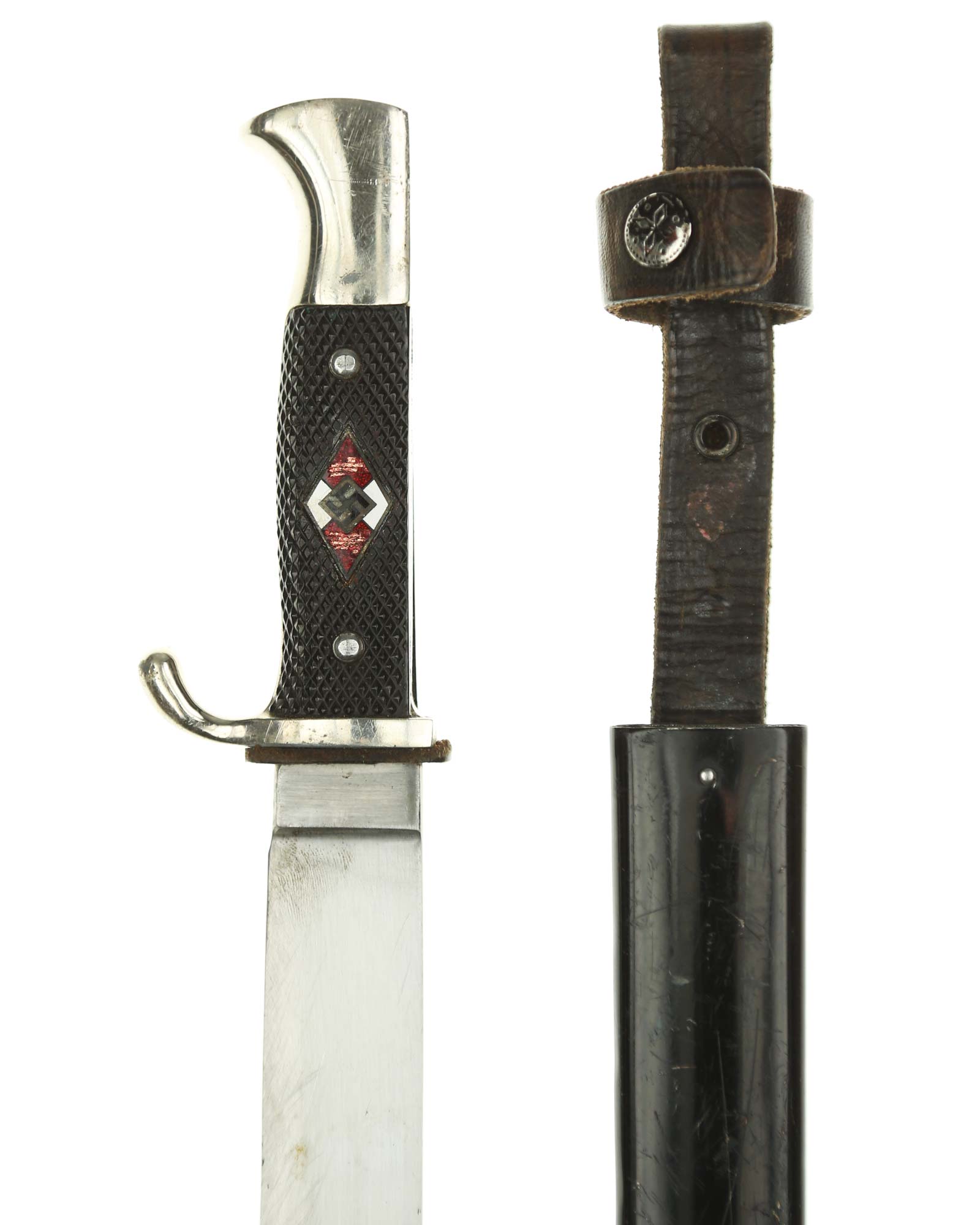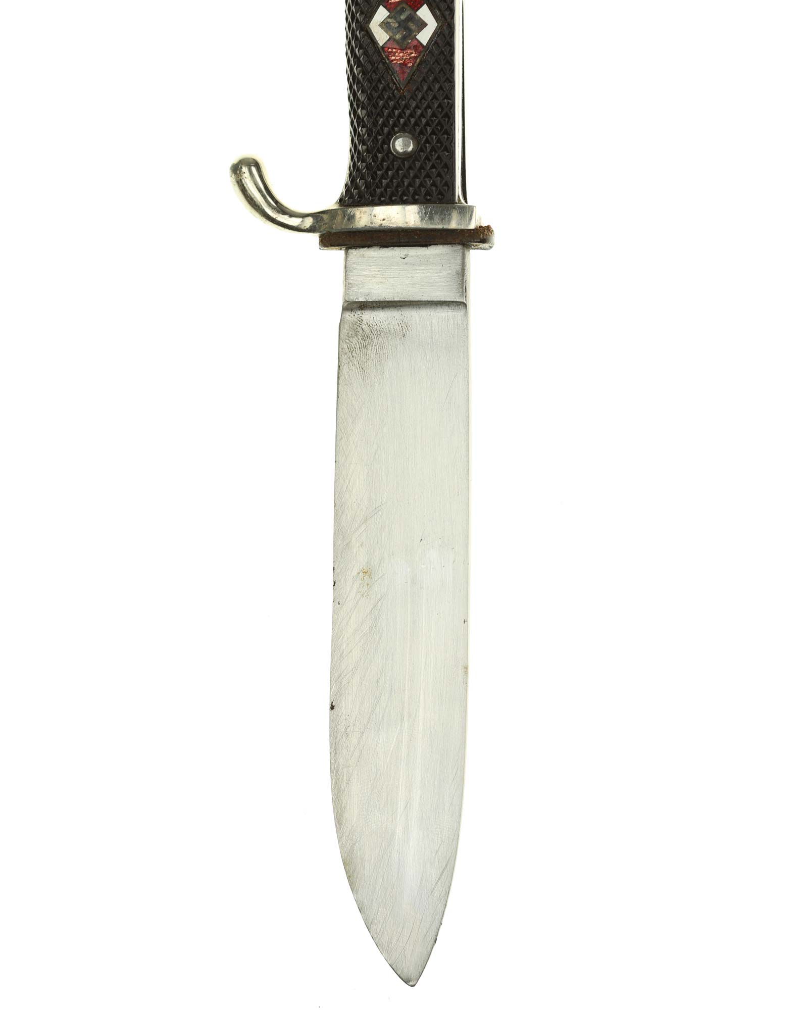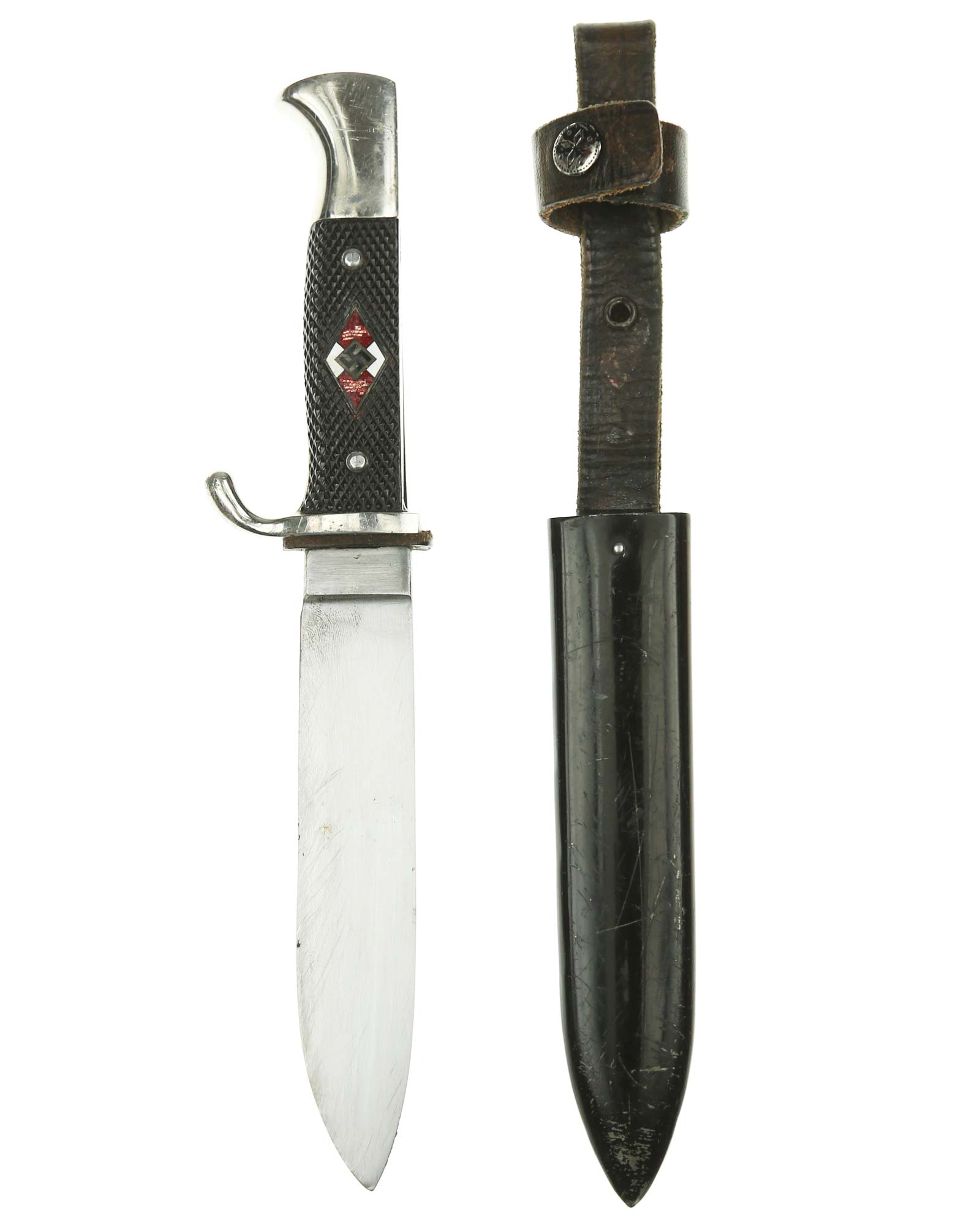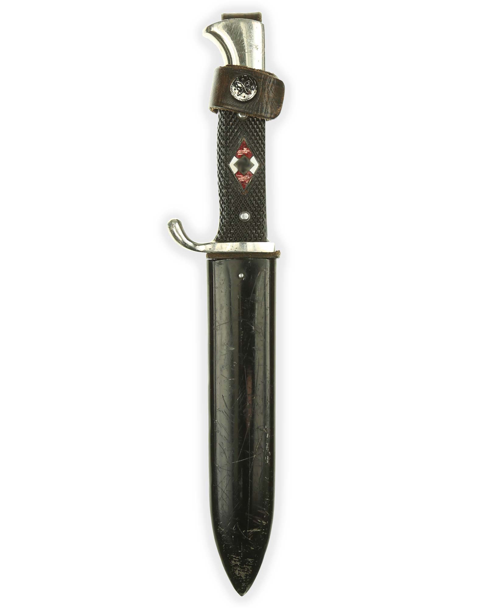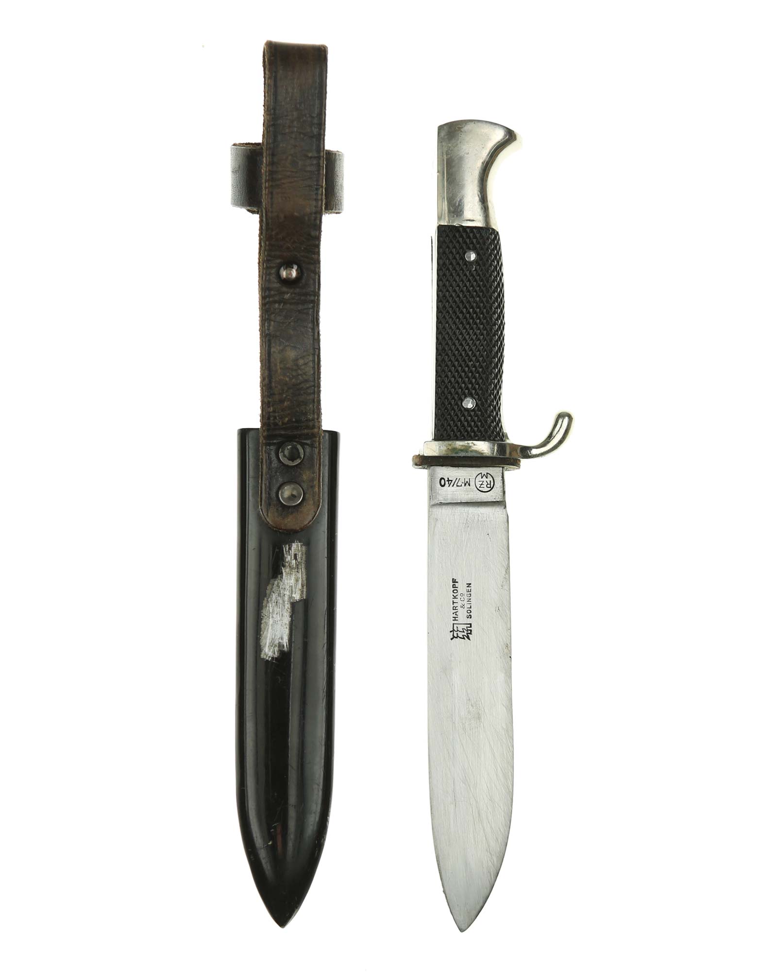 HJ Fahrtenmesser [Hitlerjugend] in mittlerer Fertigung 1936-1938. HJ Messer ist auf der Rückseite mit Hersteller: Hartkopf & Co. Solingen und RZM Code: M7/40 gekennzeichnet.