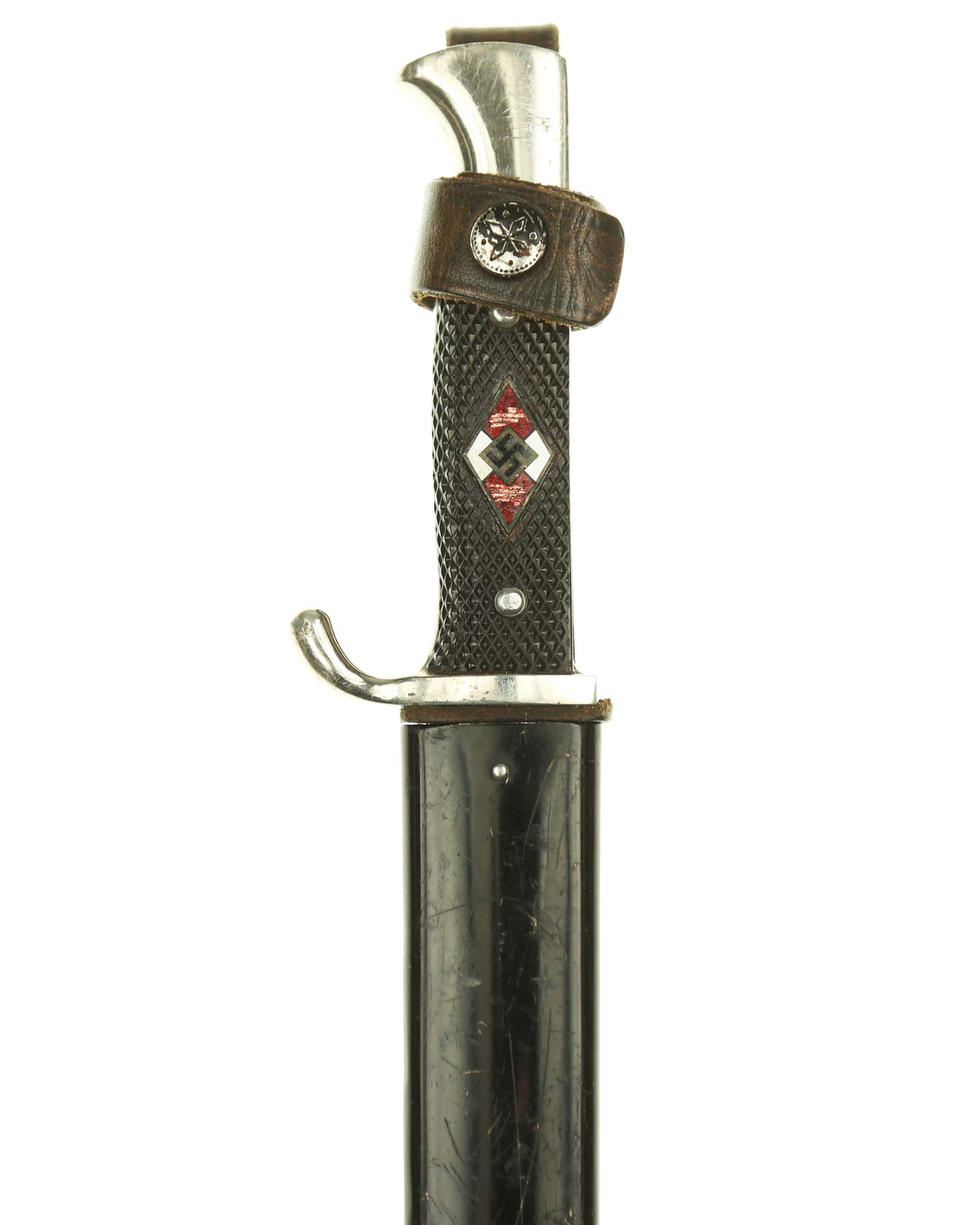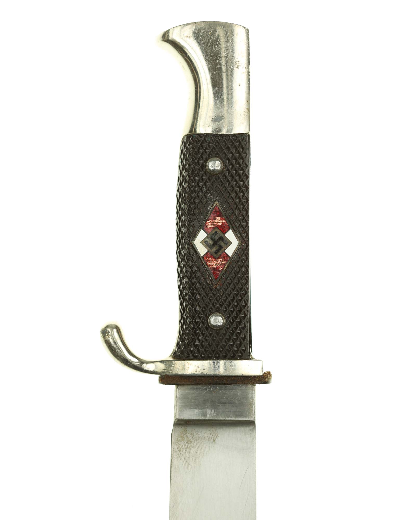 Griff: Vernietete Griffschalen, aus Bakelit mit Fischgrätenmuster in Tiefschwarz. Auf der vorderen Seite befindet sich, in der Mitte der Griffschale, das Hitler-Jugend-Abzeichen. Einseitig gebogene Parierstange bzw. Knebel.