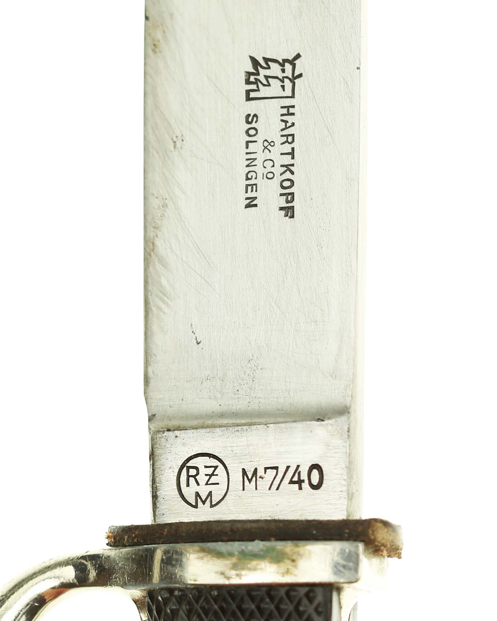 Klinge: Die Klinge ist einschneidig und aus Gussstahl. Diese ist in den Griff eingelassen und vernietet. Die Rückseite der Klinge ist mit dem Hersteller: Hartkopf & Co. Solingen und RZM Markierung: RZM M7/40.
