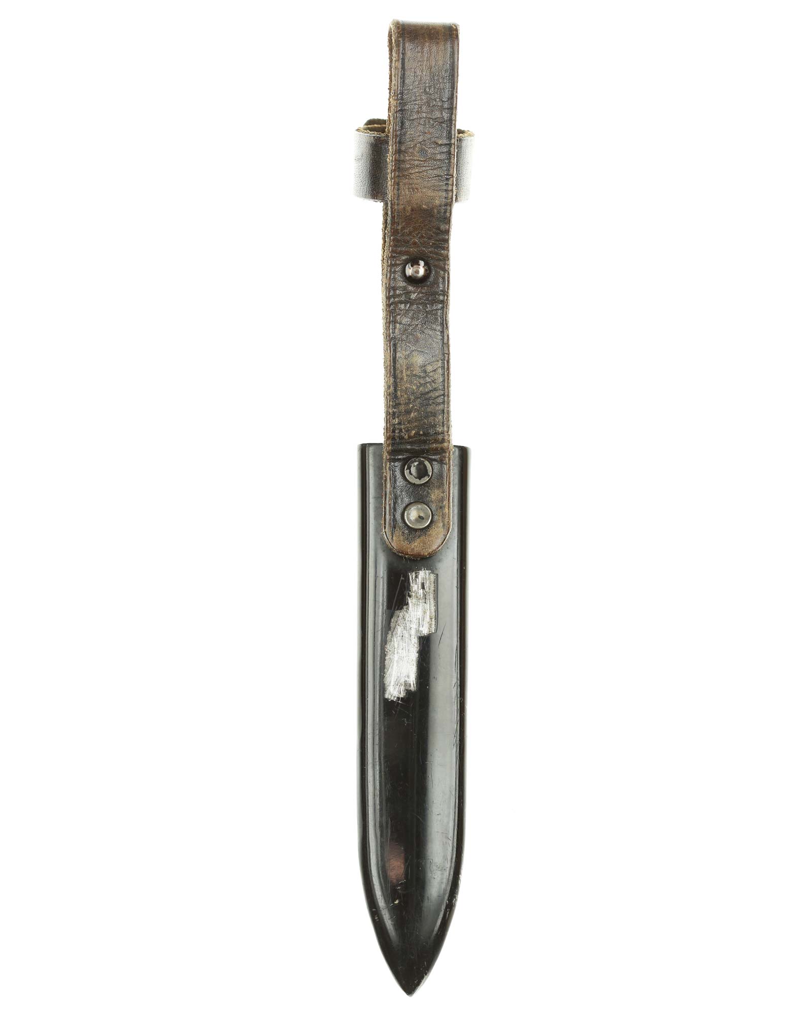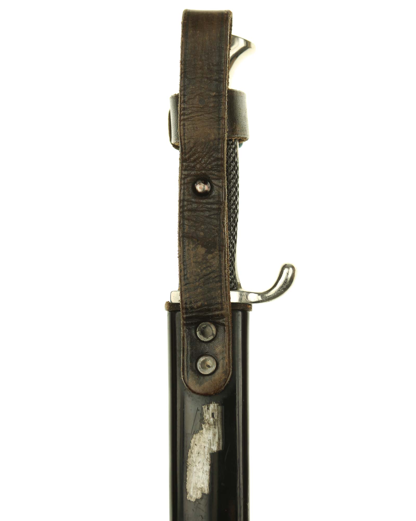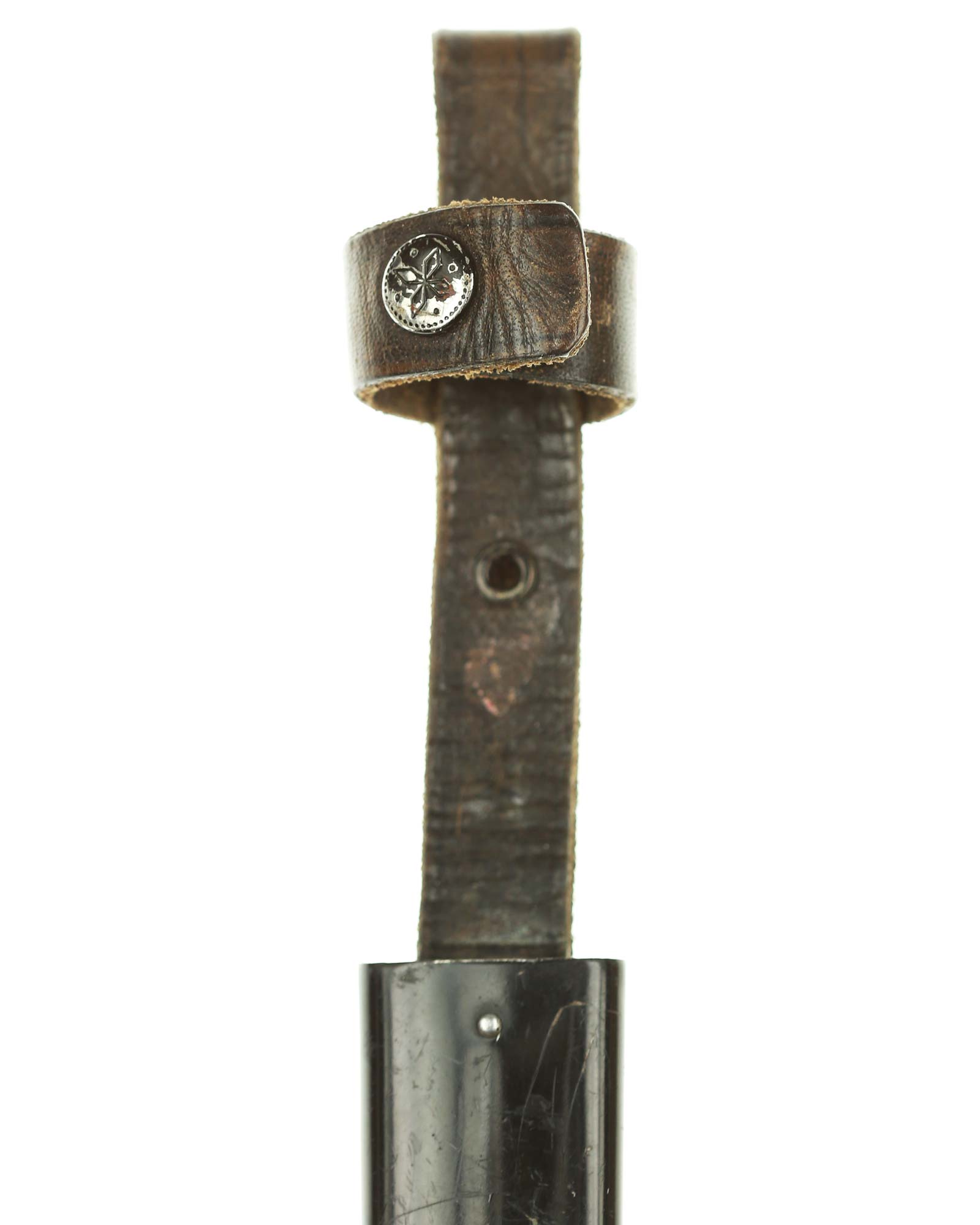 Scheide: Die Scheide ist aus Eisen und schwarzlackiert. Die Tragevorrichtung besteht aus einer Lederschlaufe, die aus einem doppelt gelegten Riemen besteht.
