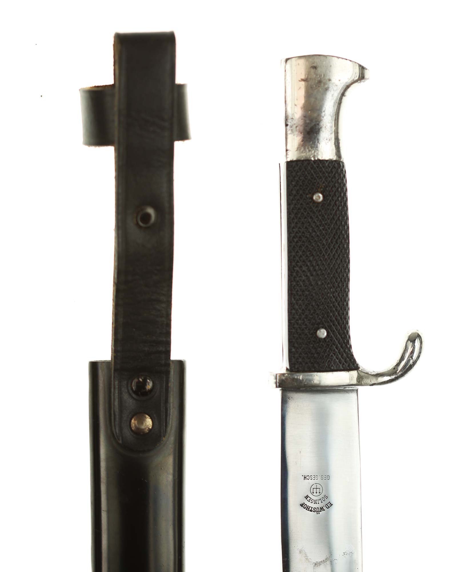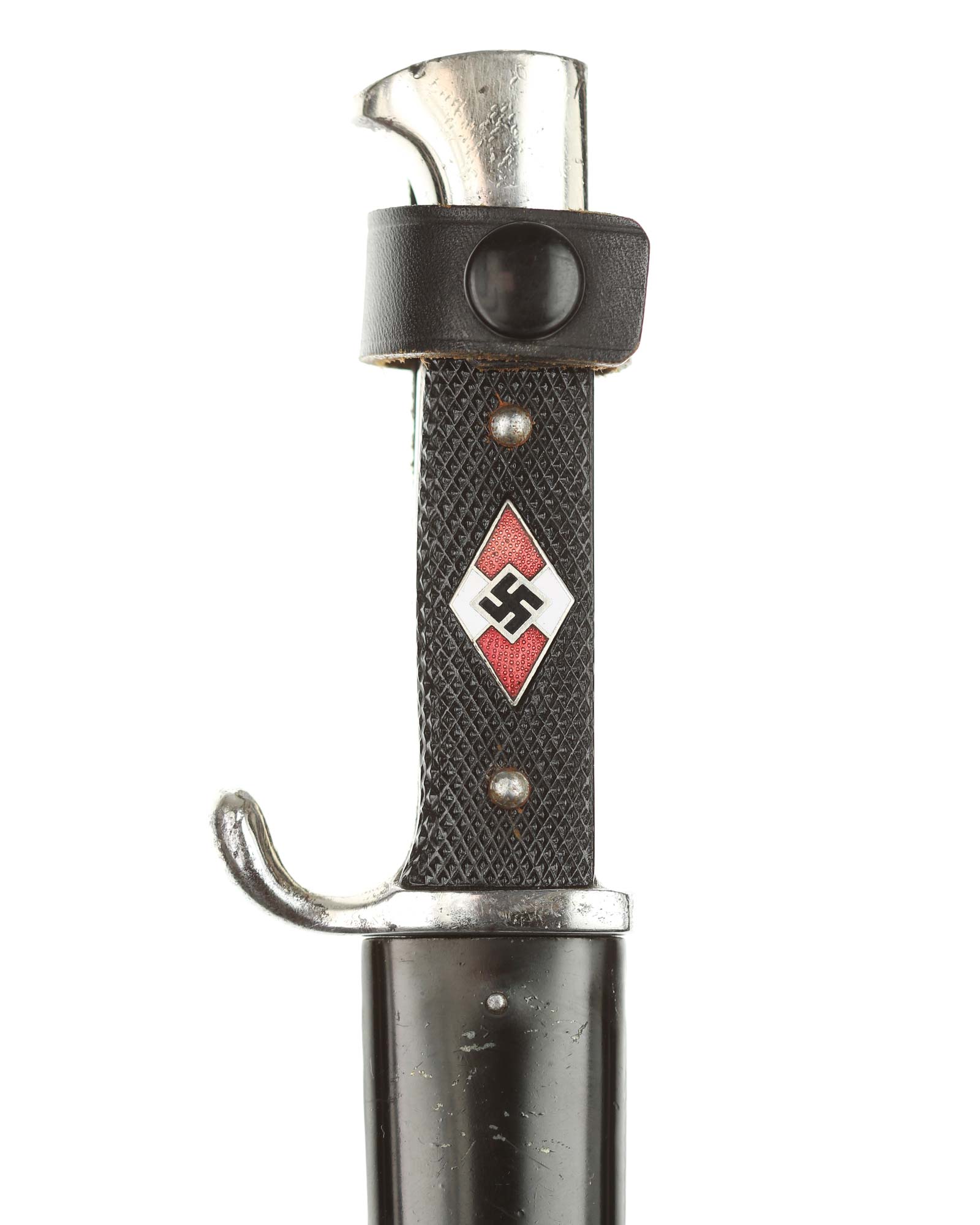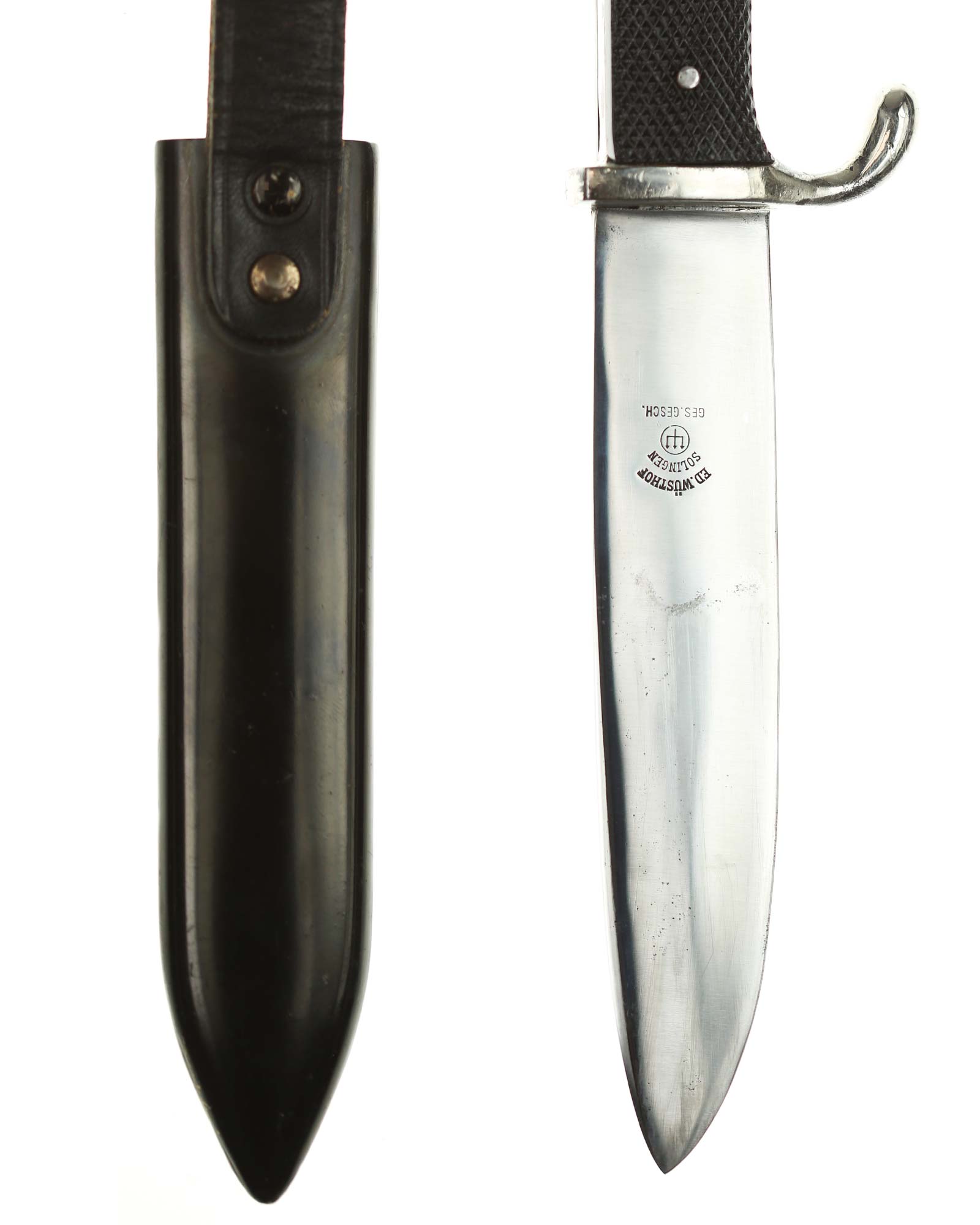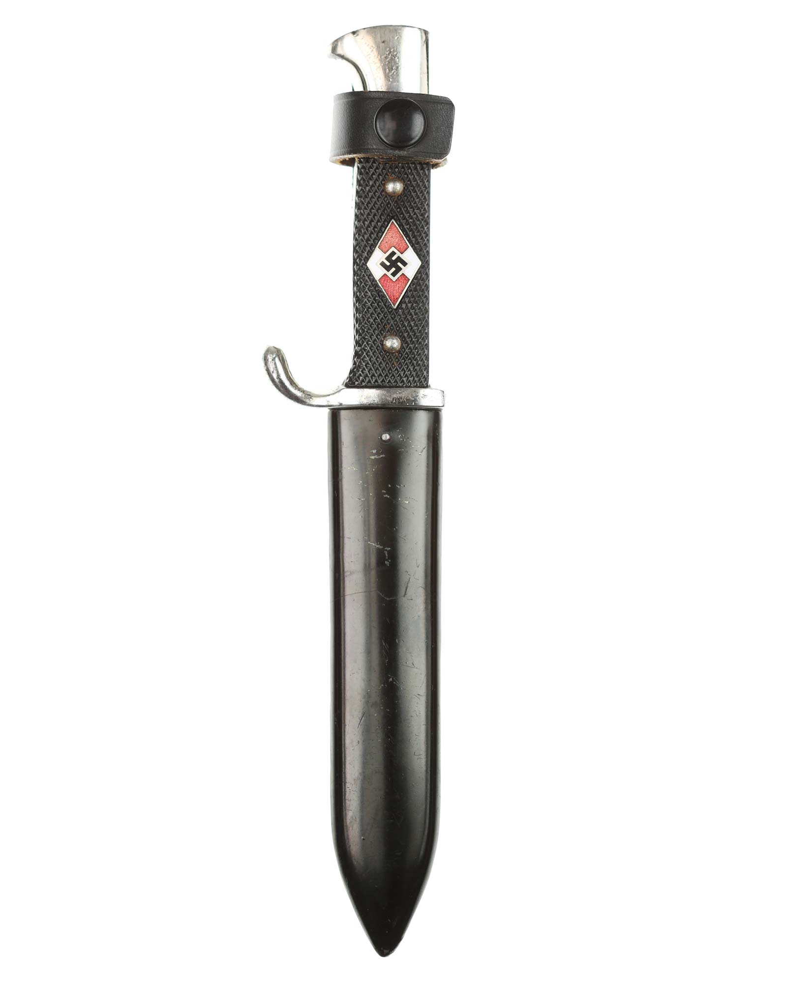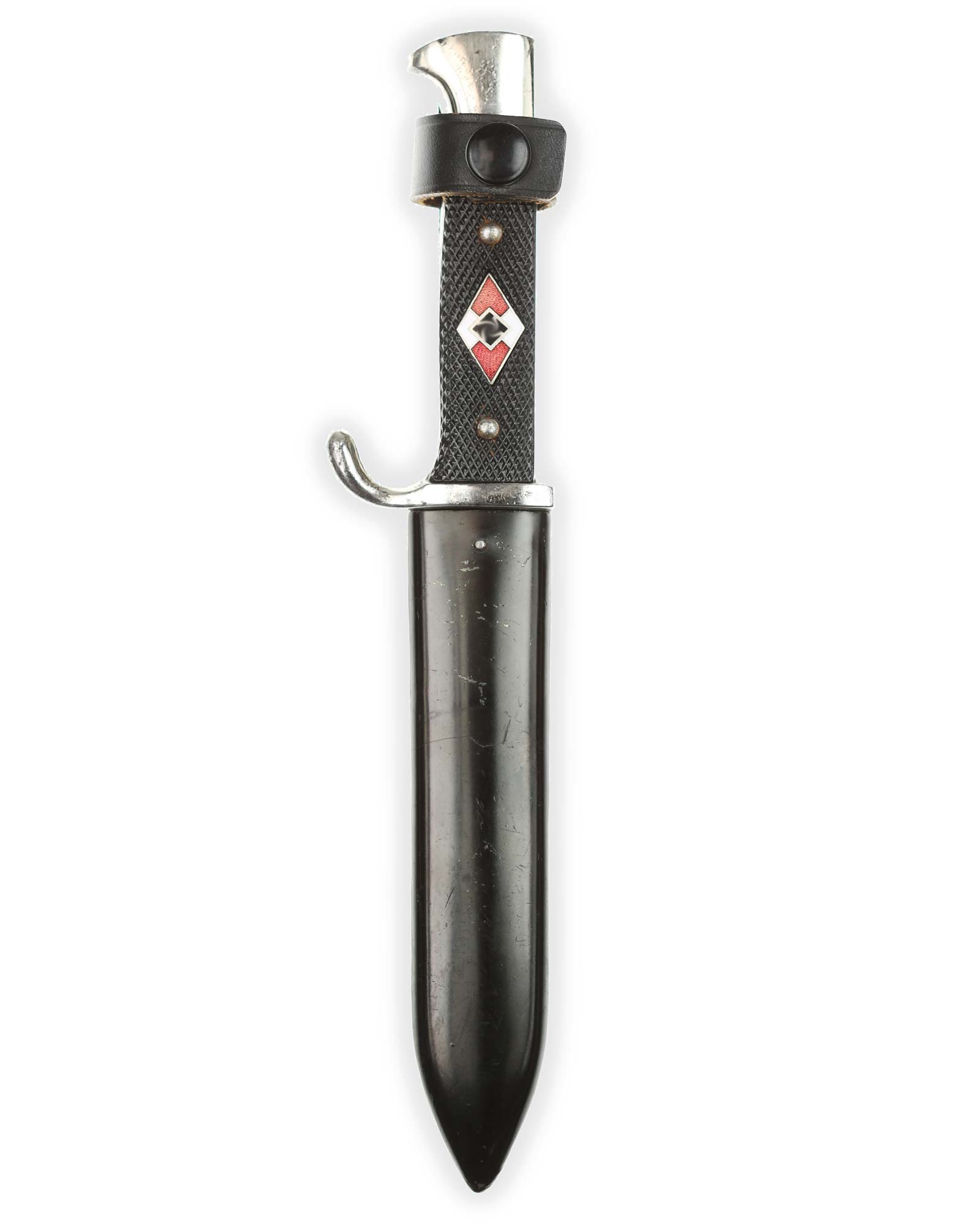 Griff: Vernietete Griffschalen, aus Bakelit mit Fischgrätenmuster in Tiefschwarz. Auf der vorderen Seite befindet sich, in der Mitte der Griffschale, das Hitler-Jugend-Abzeichen. Einseitig gebogene Parierstange bzw. Knebel.