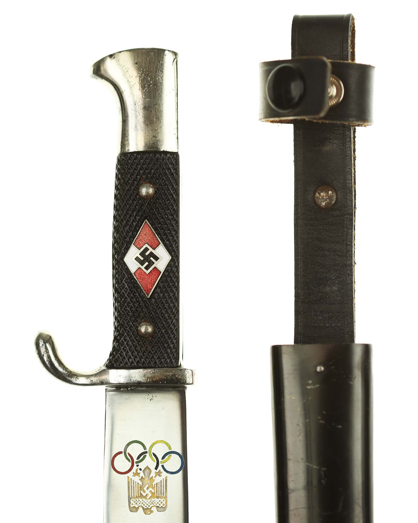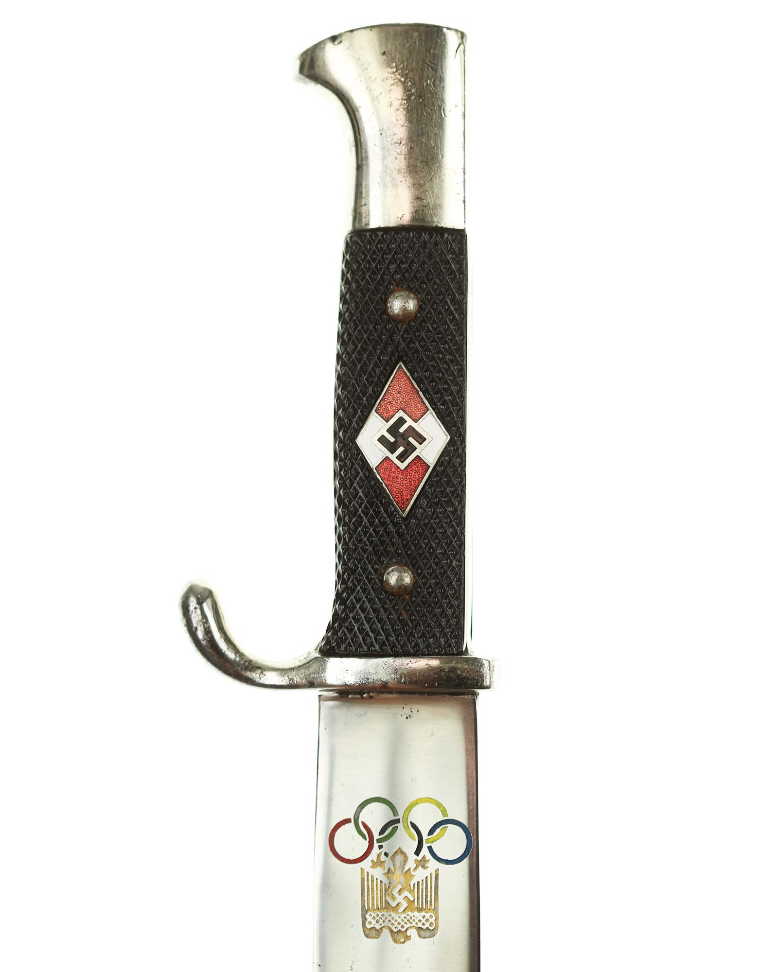 HJ Fahrtenmesser [Hitlerjugend] in früher Fertigung 1933-1935 mit Olympischen Spiele Gravur: Zum Ruhme des Sports zur Ehre des Vaterlandes. HJ Messer ist auf der Rückseite der Klinge mit dem Hersteller: Ed. Wüsthof Solingen.