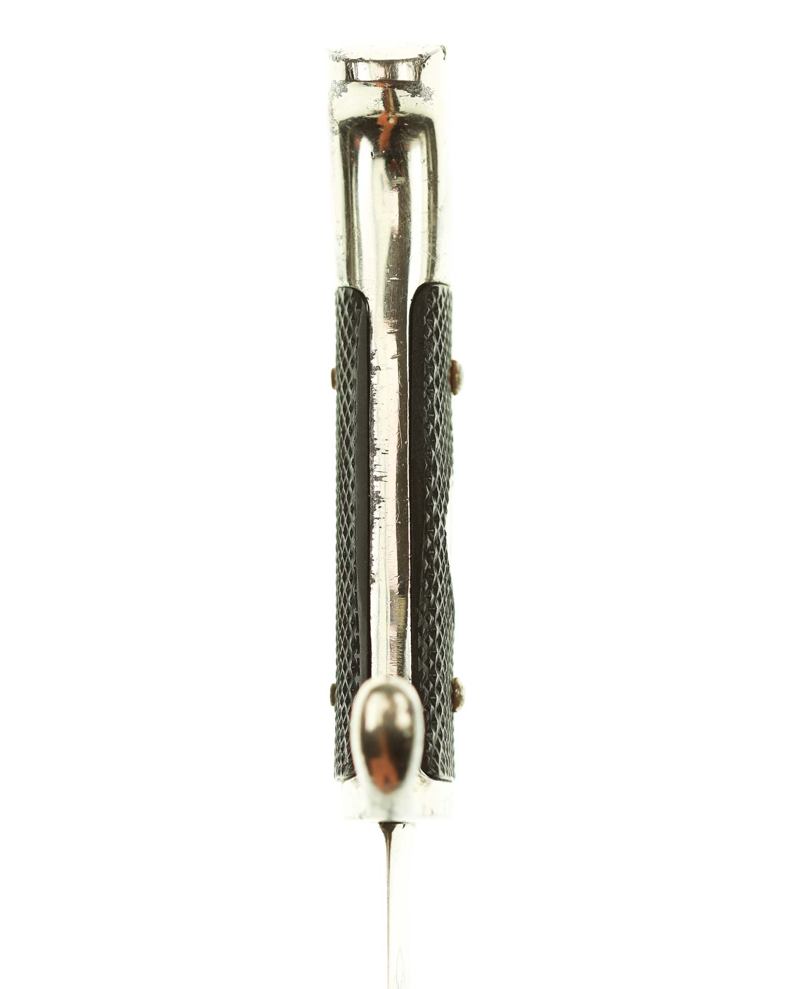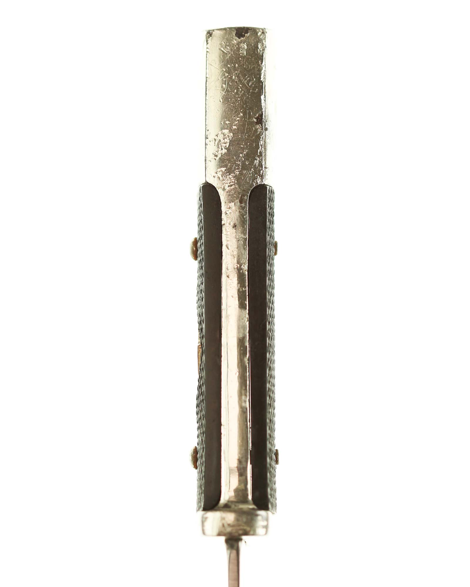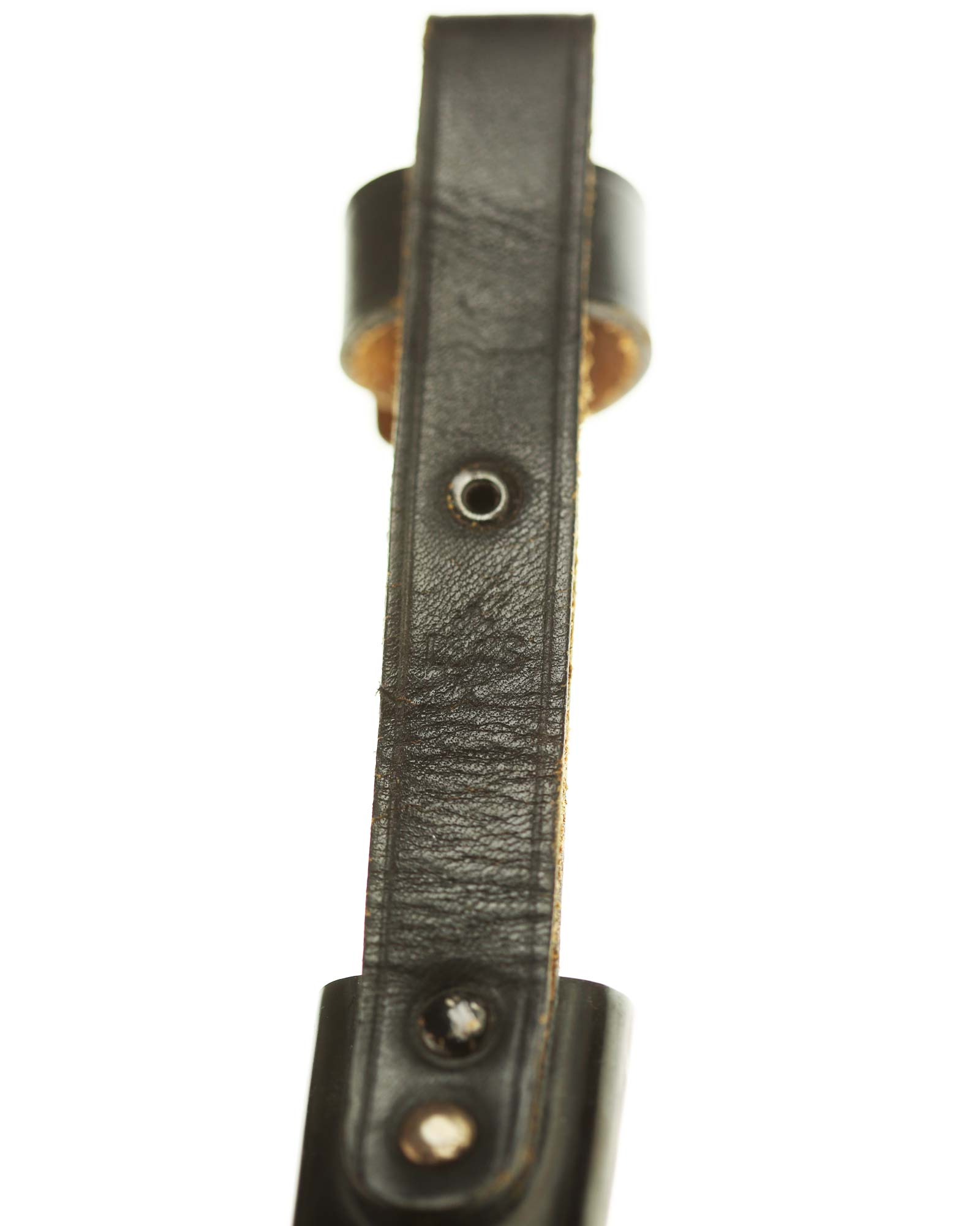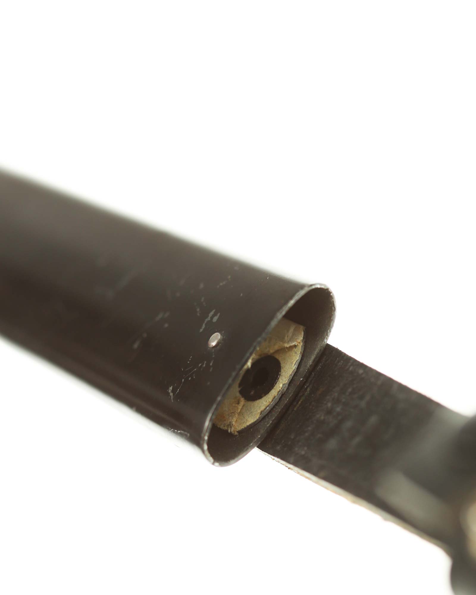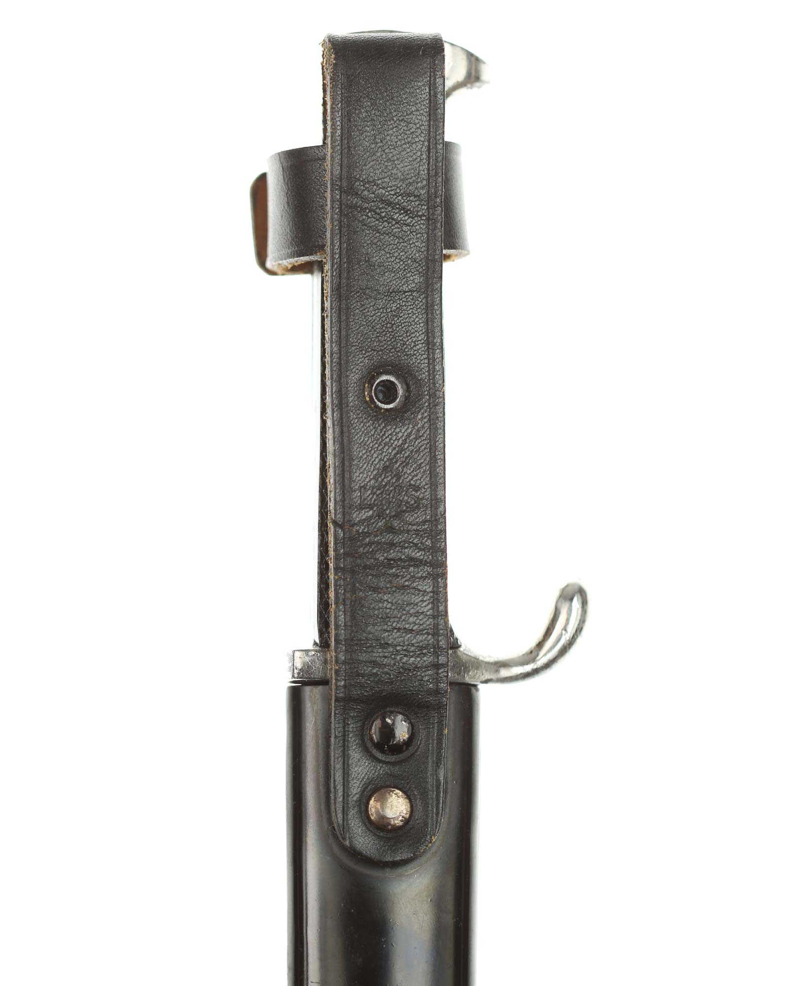 Scheide: Die Scheide ist aus schwarzlackiertem Stahl. Die Tragevorrichtung besteht aus einer Lederschlaufe, mit einem doppelt gelegten Riemen.
