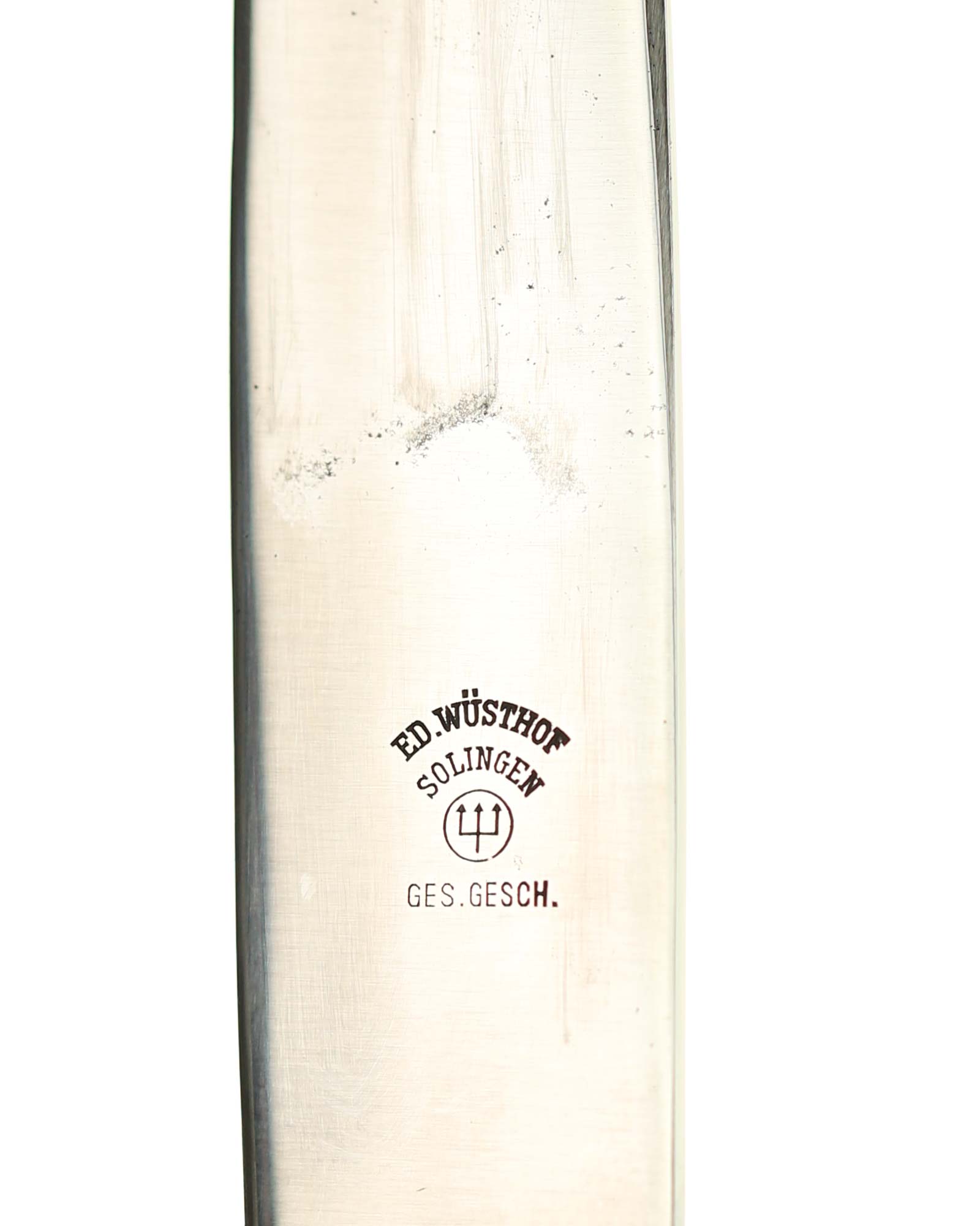 Klinge: Die Klinge ist einschneidig und aus Gussstahl. Diese ist in den Griff eingelassen und vernietet. Auf der vorderen Seite hat die Klinge die Olympischen Spiele Gravur: Zum Ruhme des Sports zur Ehre des Vaterlandes. Die Rückseite der Klinge ist mit Hersteller: Ed. Wüsthof Solingen und Ges. Gesch. geschlagen.