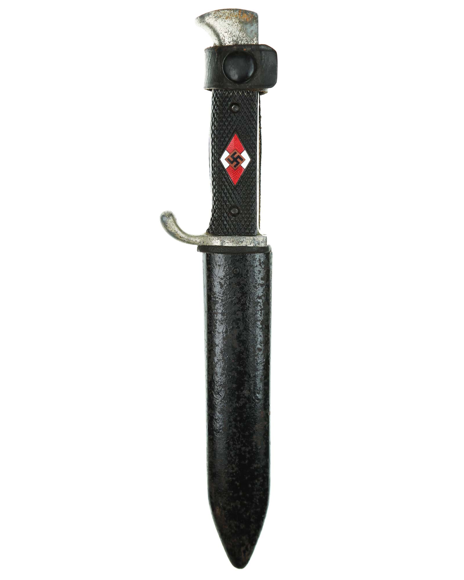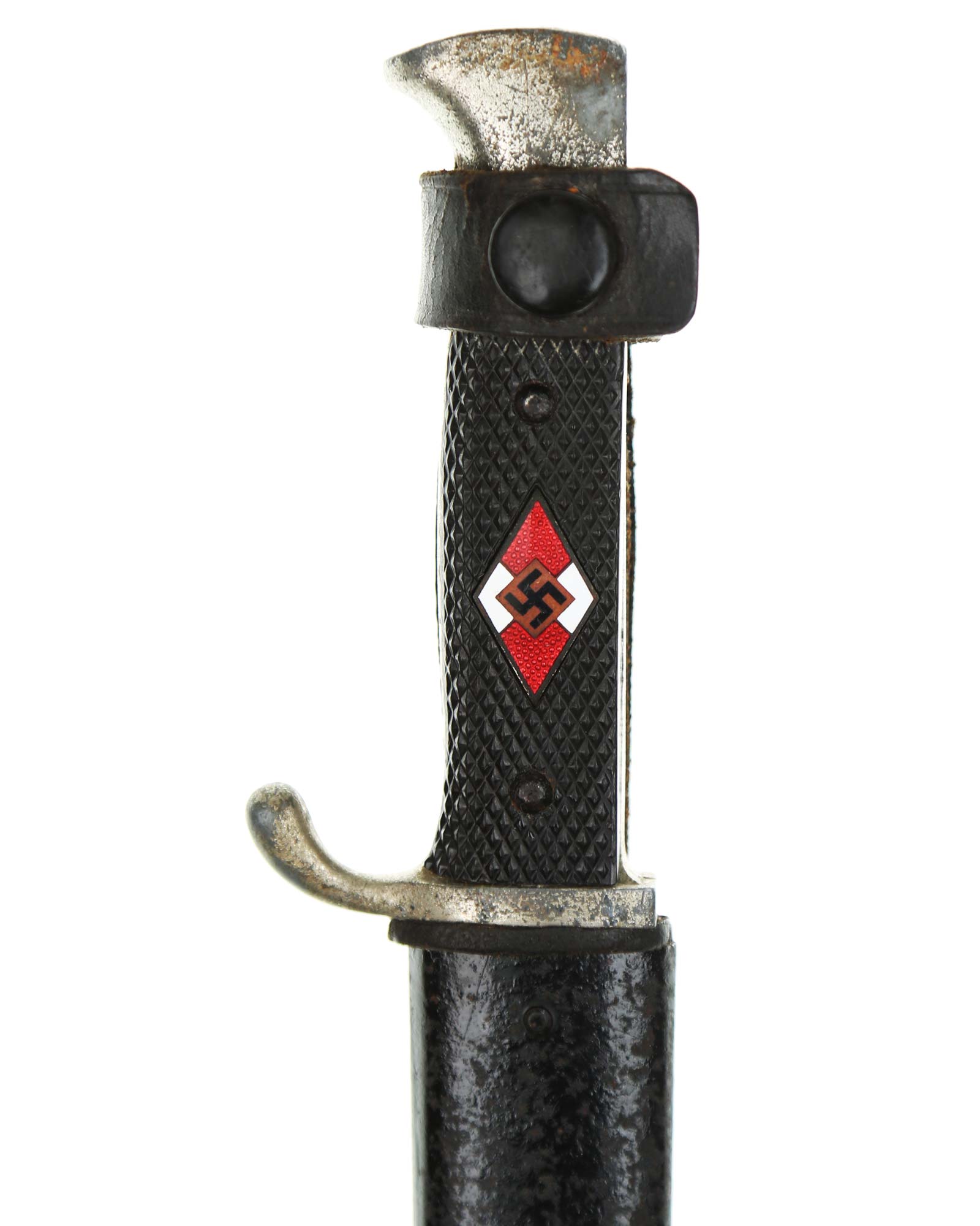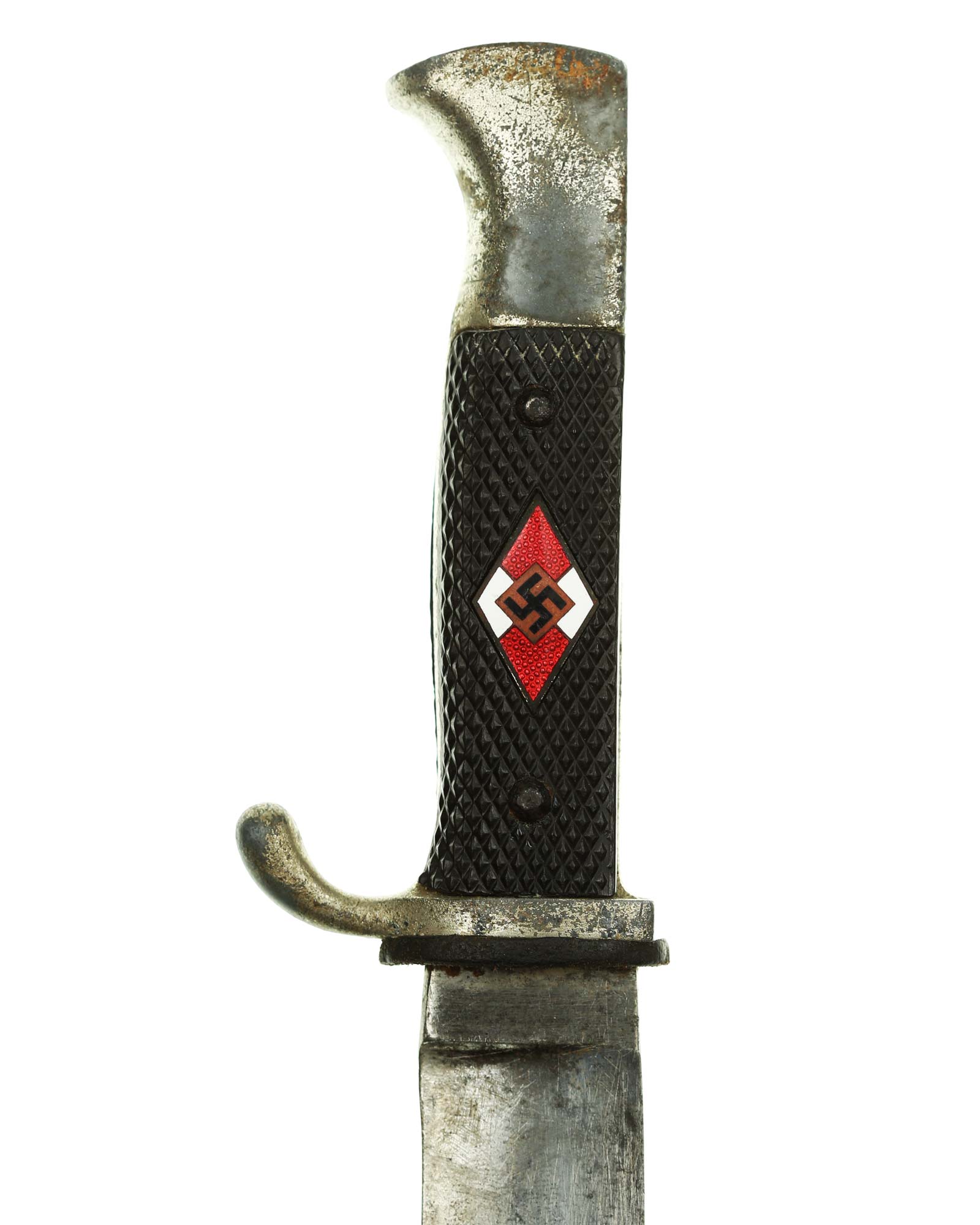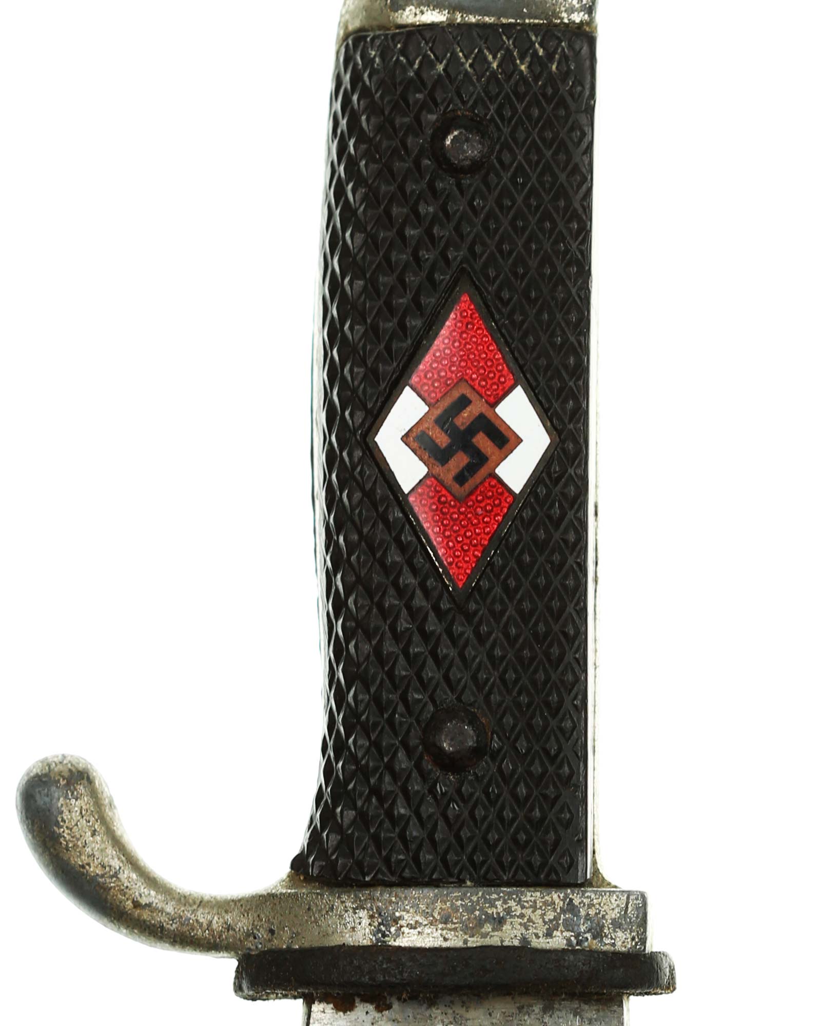 Griff: Vernietete Griffschalen, aus Bakelit mit Fischgrätenmuster in Tiefschwarz. Auf der vorderen Seite befindet sich, in der Mitte der Griffschale, das Hitler-Jugend-Abzeichen (beweglich). Einseitig gebogene Parierstange bzw. Knebel, dieser ist aus Eisen vernickelt (magnetisch).