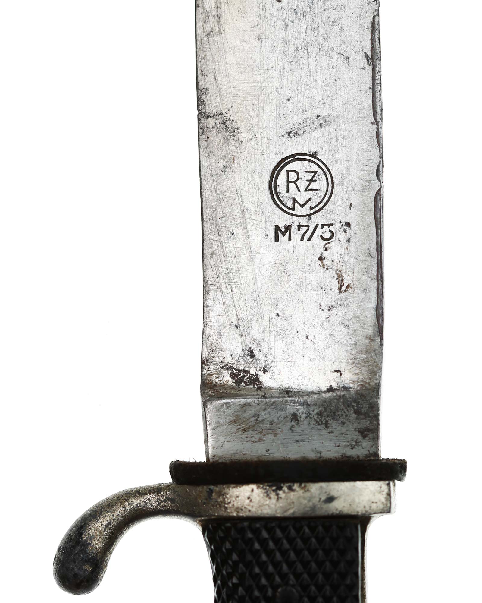 Klinge: Die Klinge ist einschneidig und aus Gussstahl. Diese ist in den Griff eingelassen und vernietet. Die Rückseite der Klinge ist mit dem RZM Markierung: RZM M7/3 (Kuno Ritter Solingen).