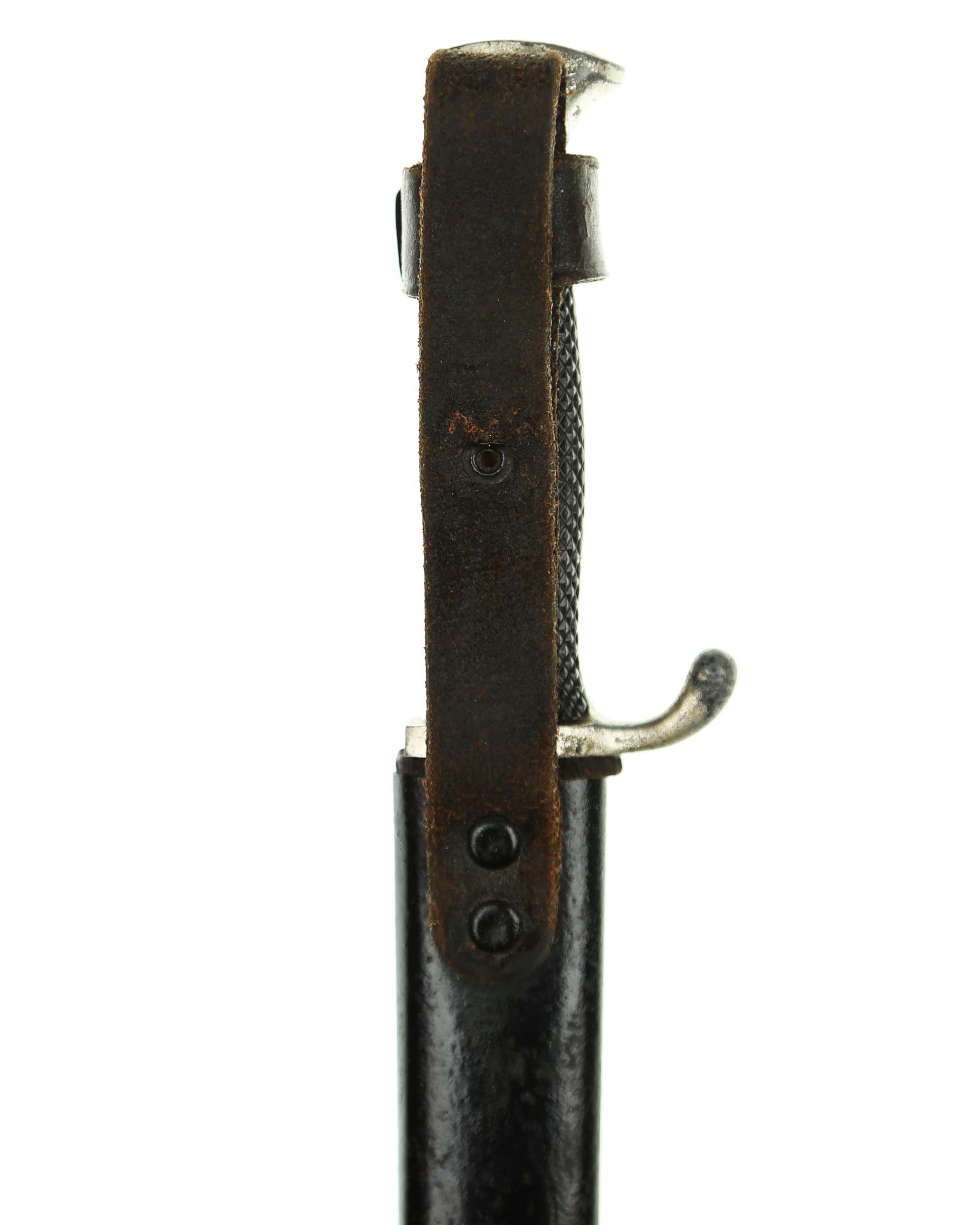 Scheide: Die Scheide ist aus Eisen und schwarzlackiert. Die Tragevorrichtung besteht aus einer Lederschlaufe, die aus einem doppelt gelegten Riemen besteht.