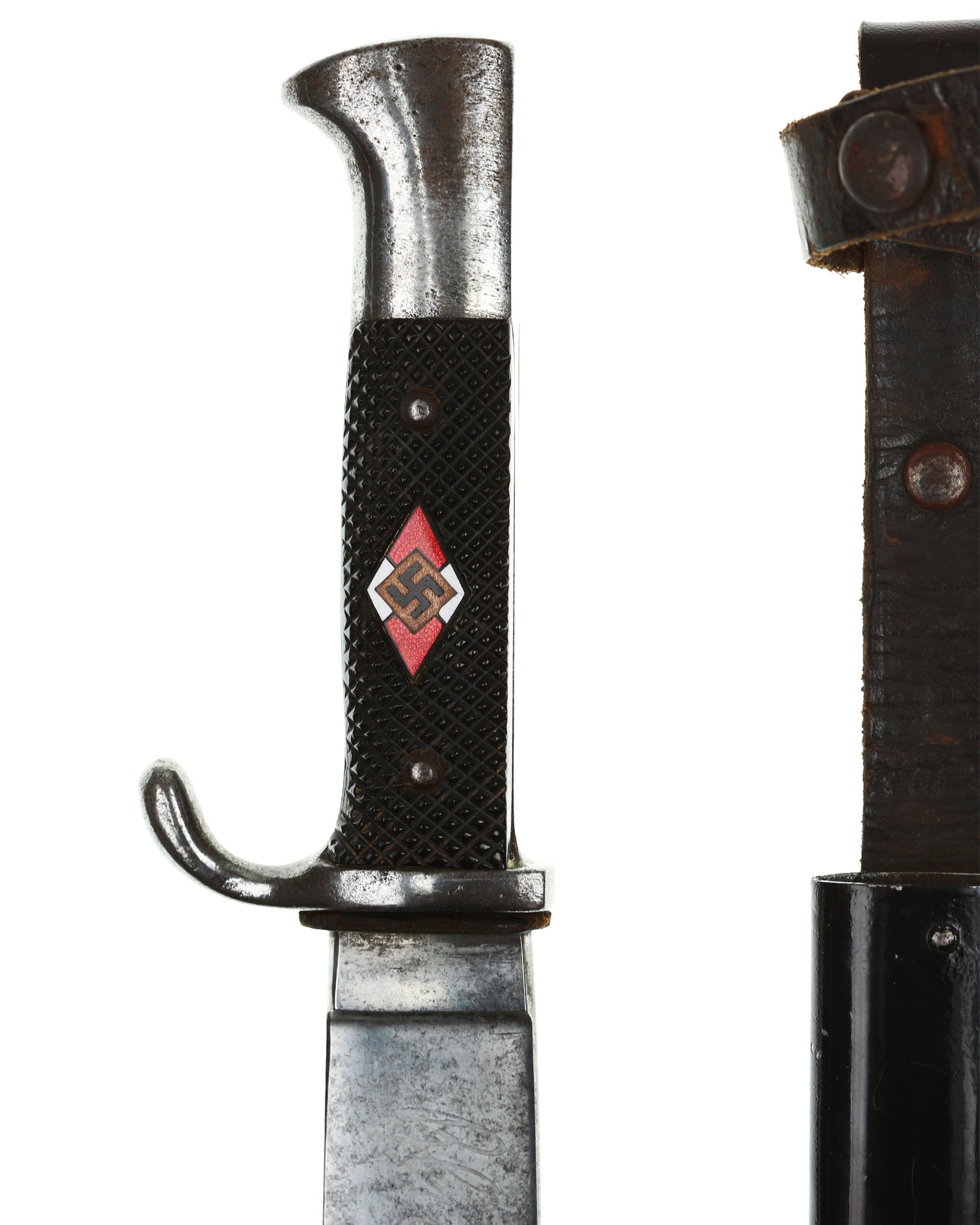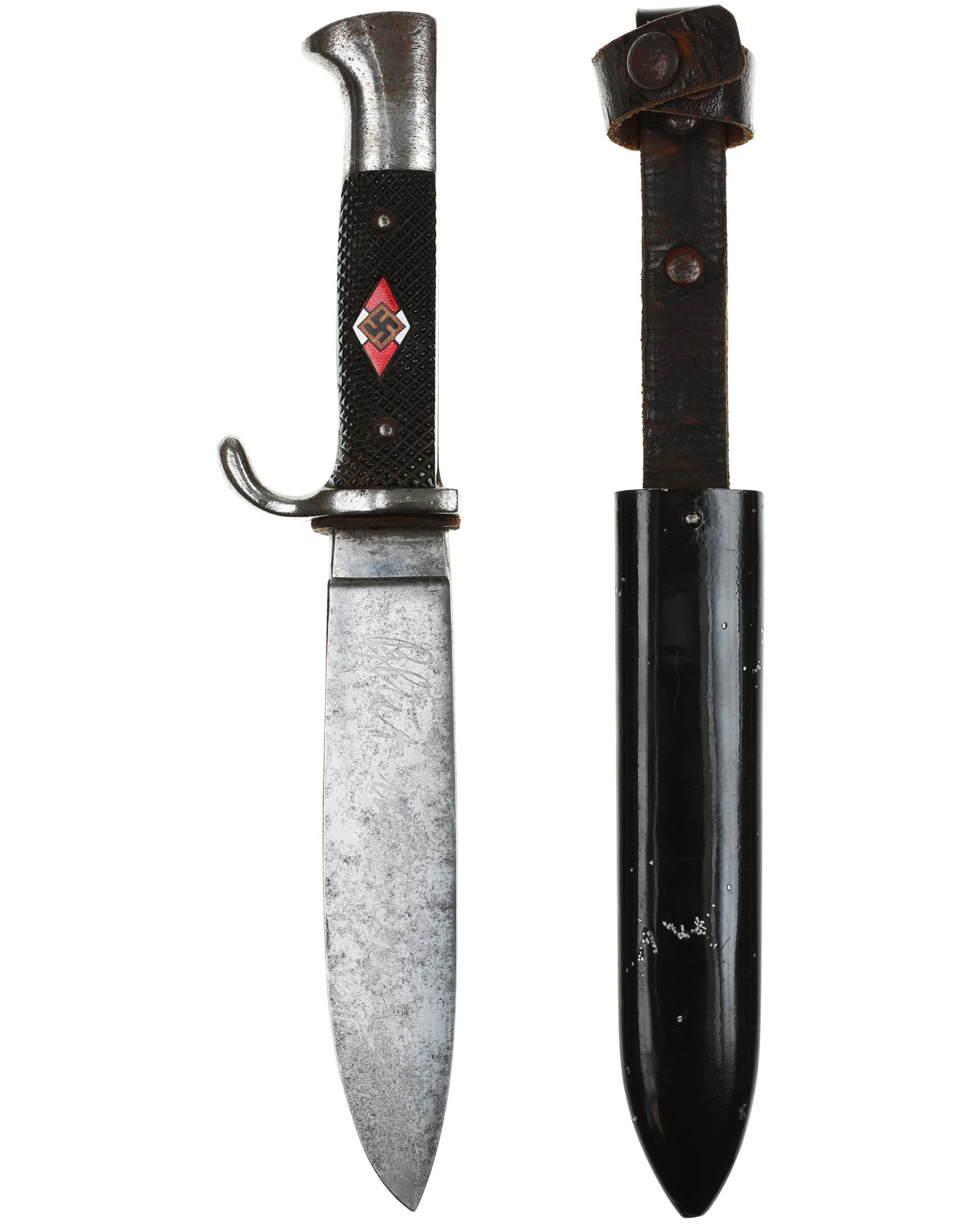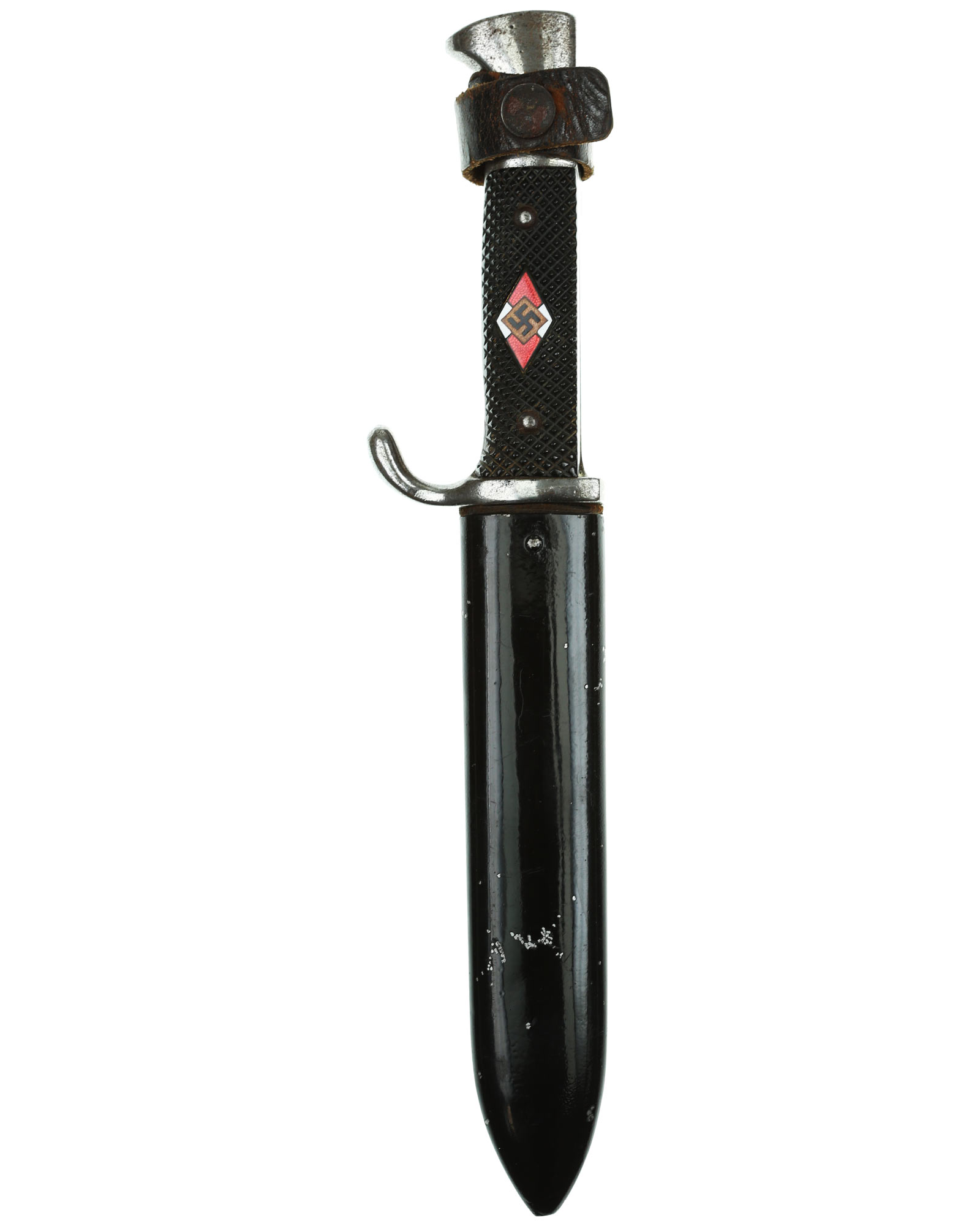 Fahrtenmesser der Hitlerjugend [HJ] mit Devise. Versilberte Nickelausführung. Vernietete schwarze Griffschalen mit eingelegter Glasemaille. Einseitig gebogene Parierstange. Schwarz lackierte Scheide mit angenieteter Koppeltragelasche aus schwarzem Leder. Stahlscheide mit 98% Lack. Die Klinge mit Devisenätzung "Blut und Ehre" und auf der Rückseite der Klinge ist der RZM Herstellercode RZM M7/51 1937 (Anton Jr. Wingen Solingen). Die Klinge ist mit Fehlschärfe. Stoßleder ist vorhanden.