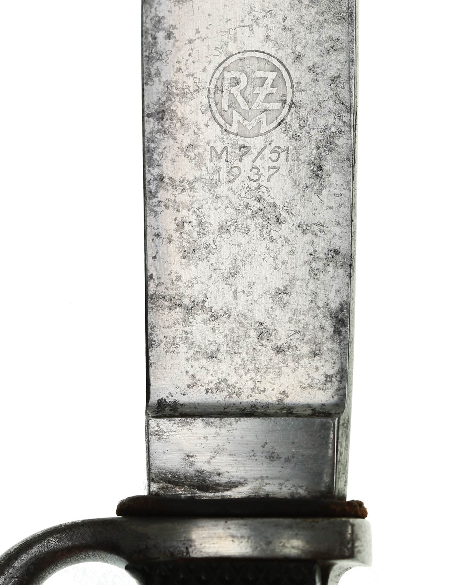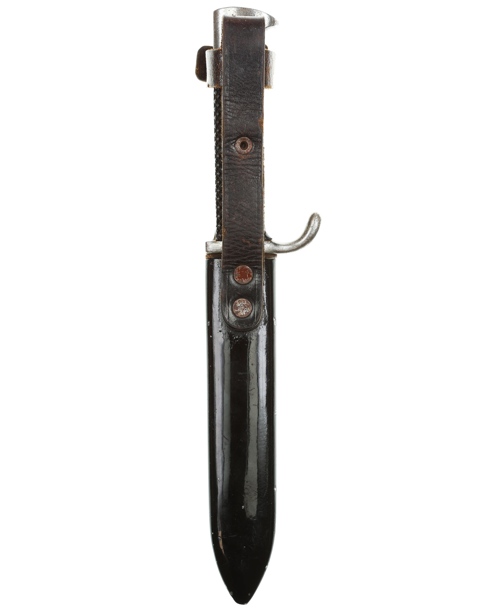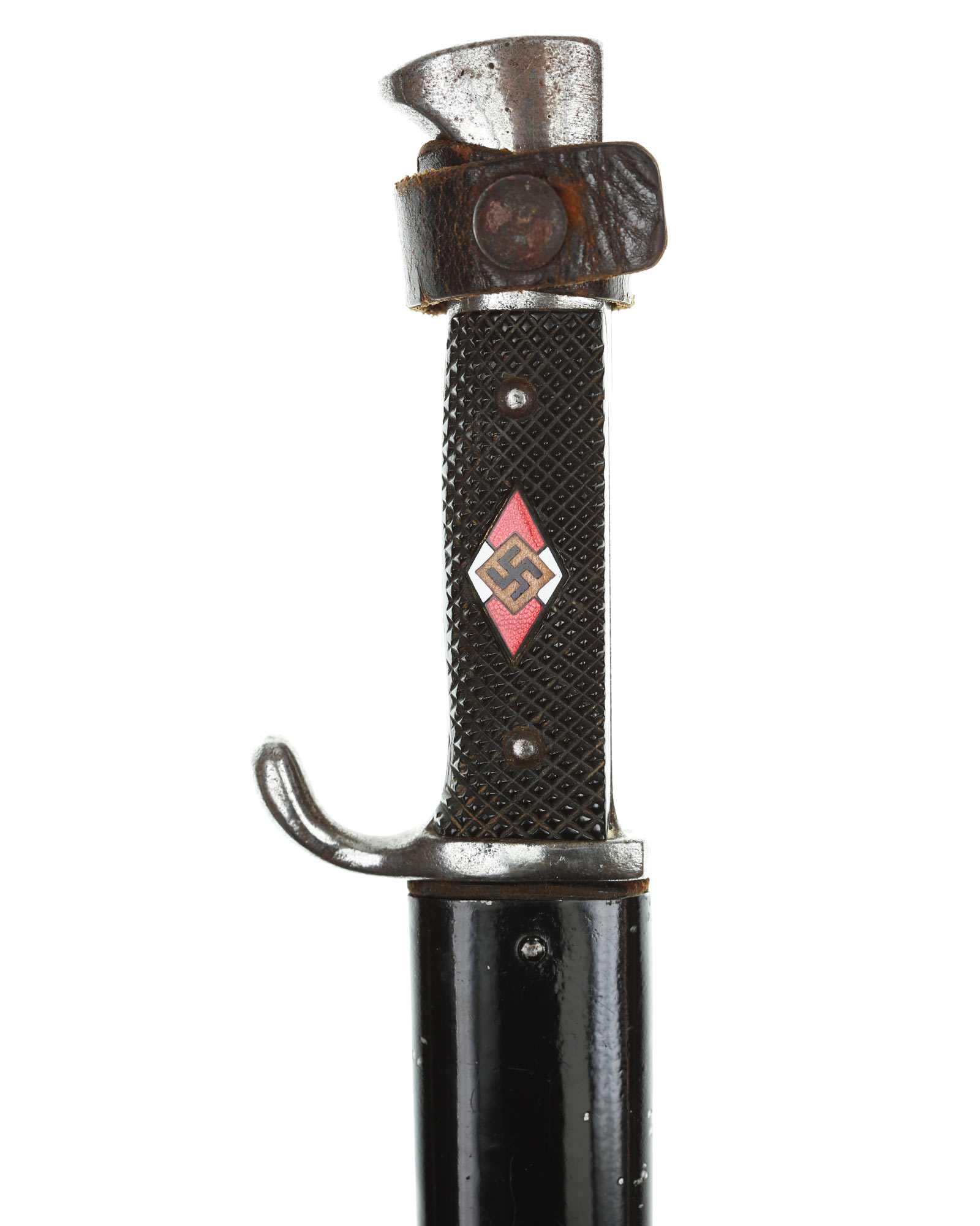 Fahrtenmesser der Hitlerjugend [HJ] mit Devise. Versilberte Nickelausführung. Vernietete schwarze Griffschalen mit eingelegter Glasemaille. Einseitig gebogene Parierstange. Schwarz lackierte Scheide mit angenieteter Koppeltragelasche aus schwarzem Leder. Stahlscheide mit 98% Lack. Die Klinge mit Devisenätzung "Blut und Ehre" und auf der Rückseite der Klinge ist der RZM Herstellercode RZM M7/51 1937 (Anton Jr. Wingen Solingen). Die Klinge ist mit Fehlschärfe. Stoßleder ist vorhanden.