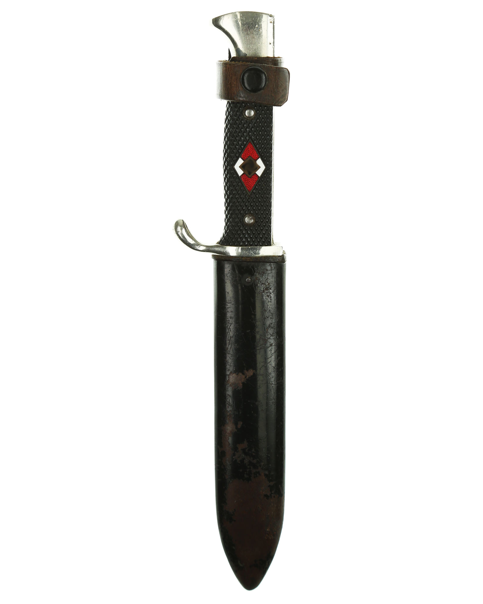 HJ Fahrtenmesser in versilberten Nickelausführung. Mittlere Fertigungsperiode 1936-1938. Vernietete schwarze Griffschalen mit eingelegter Glasemaille, diese ist beweglich. Einseitig gebogene Parierstange. Schwarz lackierte Scheide mit angenieteter Koppeltragelasche aus schwarzem Leder. Stahlscheide mit Originallack. Die Klinge ist blank, auf der Rückseite der Klinge ist der RZM Herstellercode RZM M7/66 und frühes Herstellerlogo von Eickhorn Solingen. Stoßleder ist vorhanden.