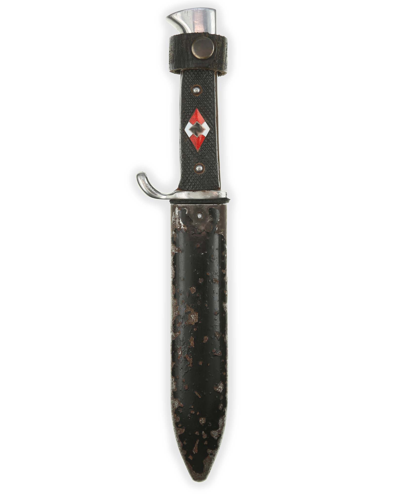 Griff: Vernietete Griffschalen, aus Bakelit mit Fischgrätenmuster in Tiefschwarz. Auf der vorderen Seite befindet sich, in der Mitte der Griffschale, das Hitler-Jugend-Abzeichen (beweglich). Einseitig gebogene Parierstange bzw. Knebel.