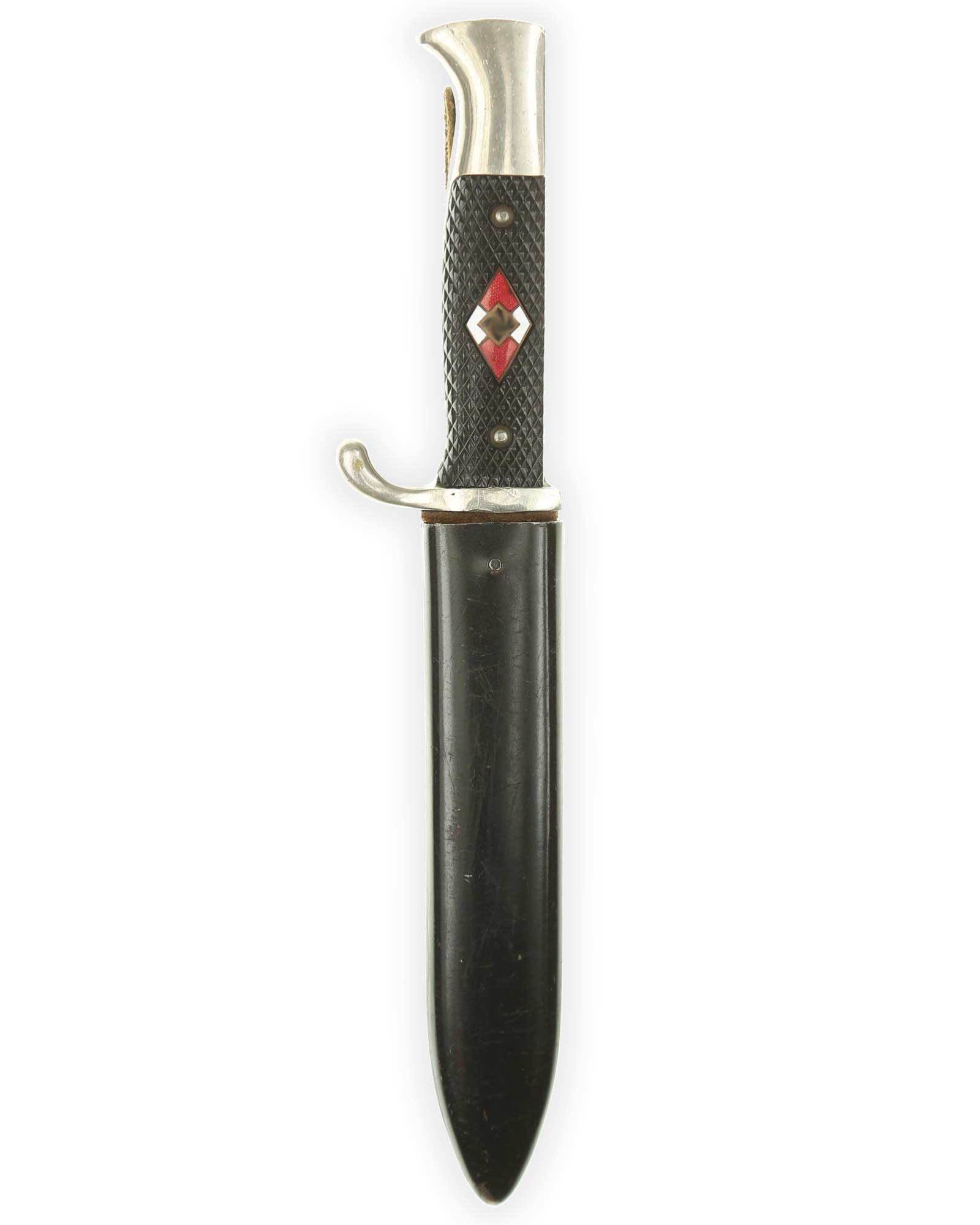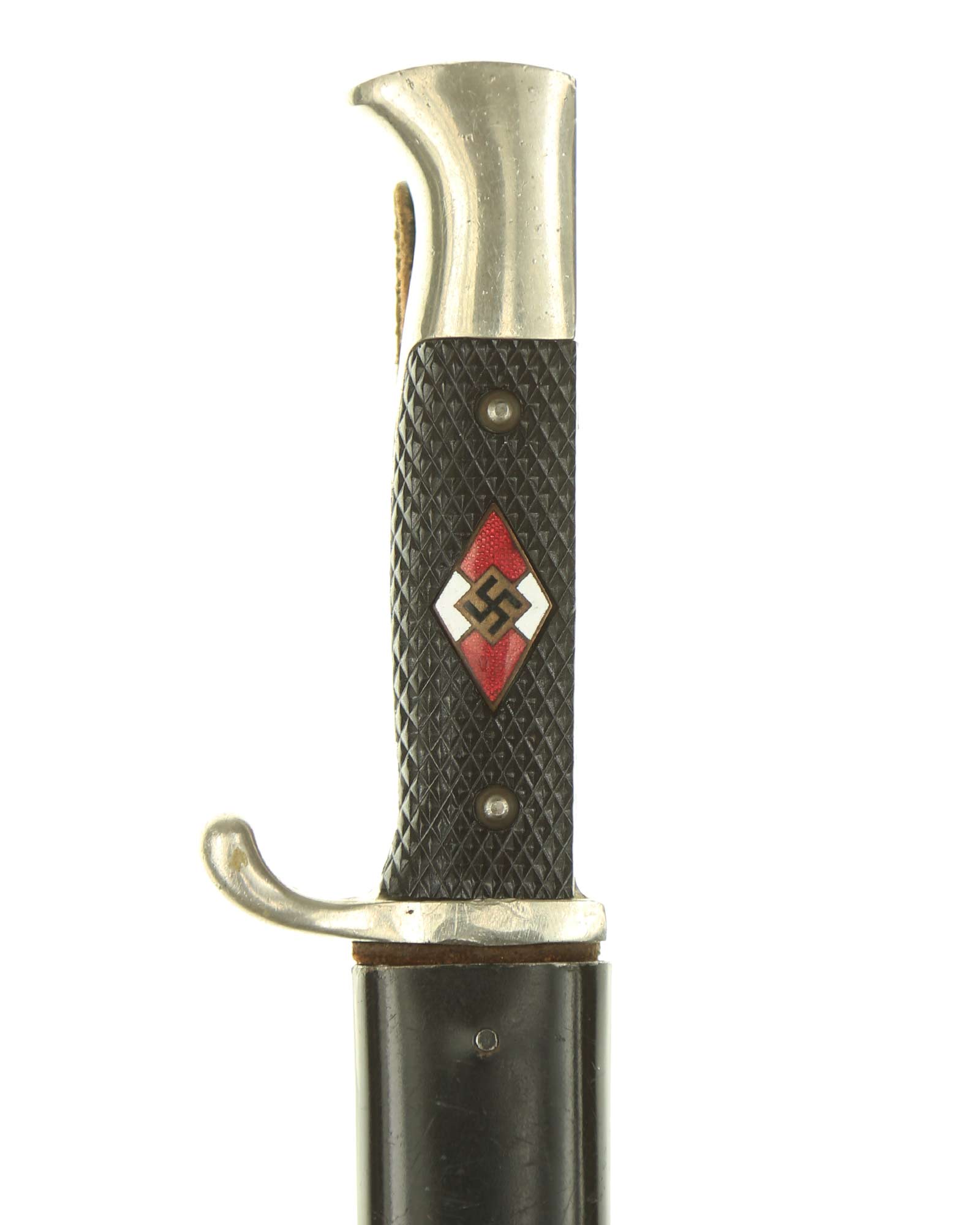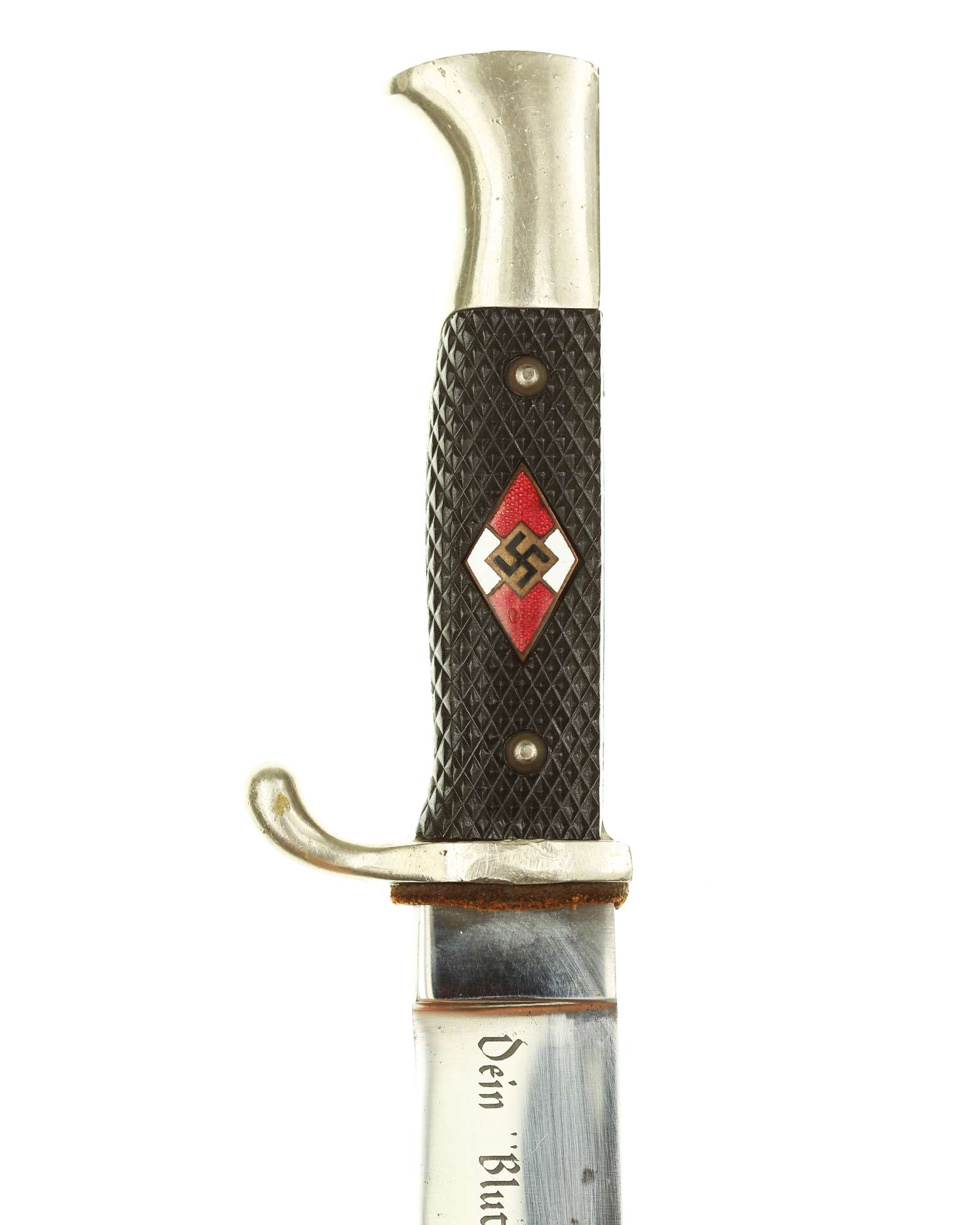 Griff: Vernietete Griffschale, aus Bakelit mit Fischgrätenmuster in Tiefschwarz. Auf der vorderen Seite befindet sich, in der Mitte der Griffschale, das Hitler-Jugend-Abzeichen (versplintet). Einseitig gebogene Parierstange bzw. Knebel.