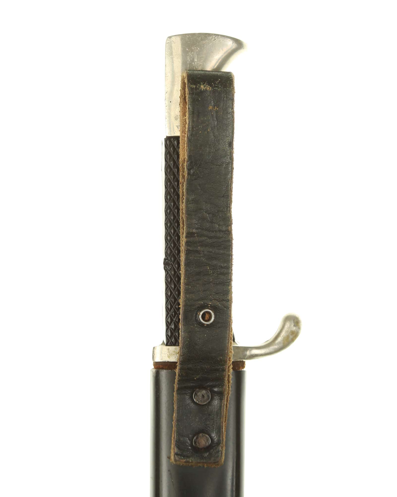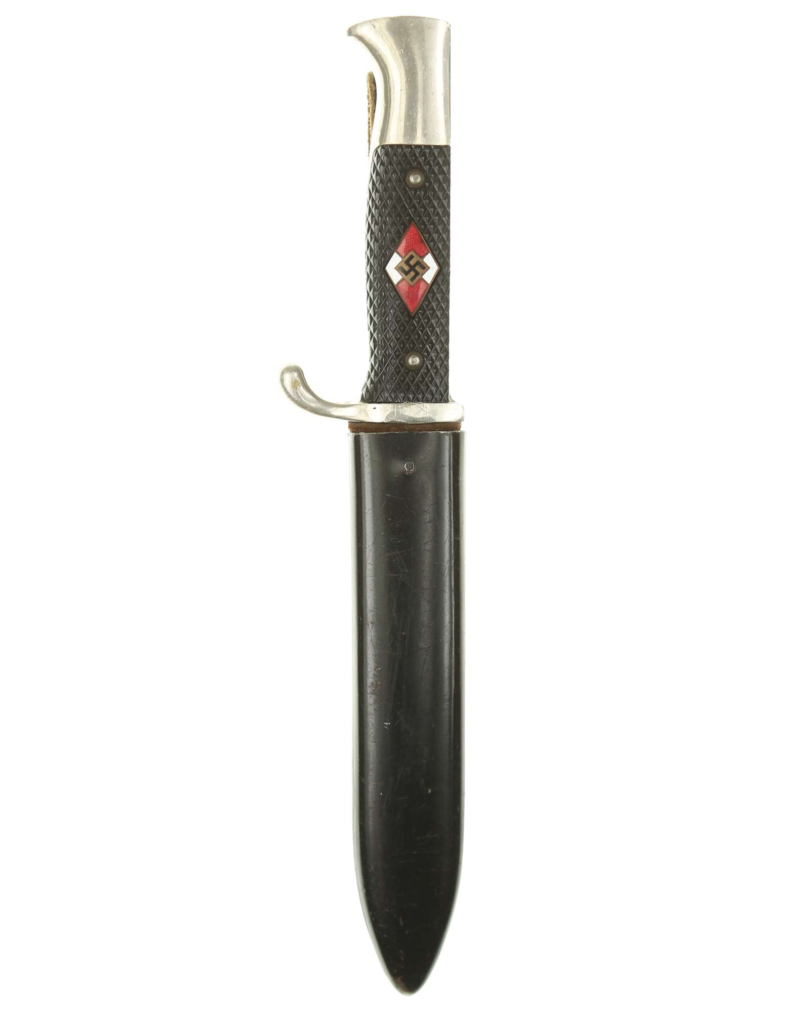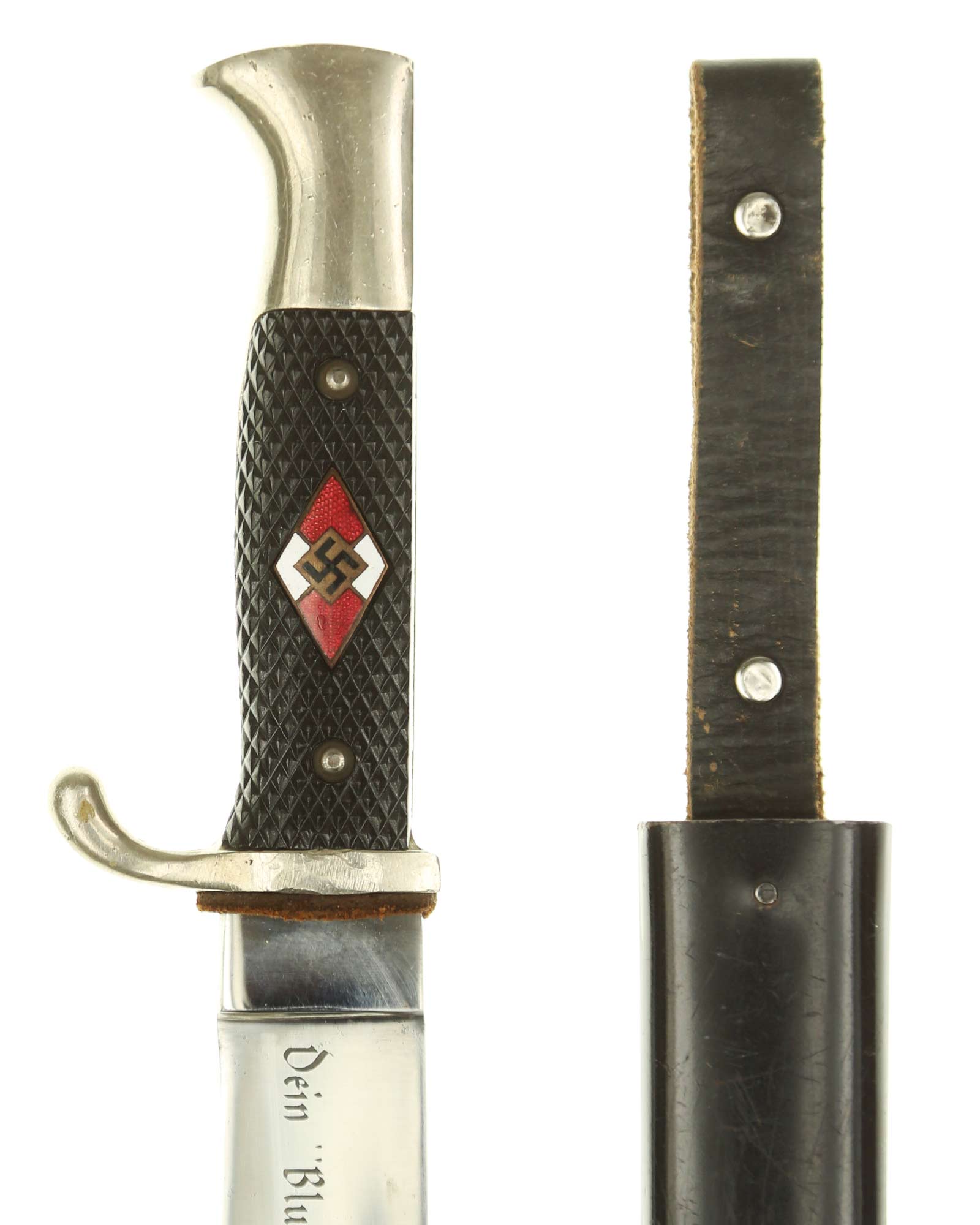 Griff: Vernietete Griffschale, aus Bakelit mit Fischgrätenmuster in Tiefschwarz. Auf der vorderen Seite befindet sich, in der Mitte der Griffschale, das Hitler-Jugend-Abzeichen (versplintet). Einseitig gebogene Parierstange bzw. Knebel.