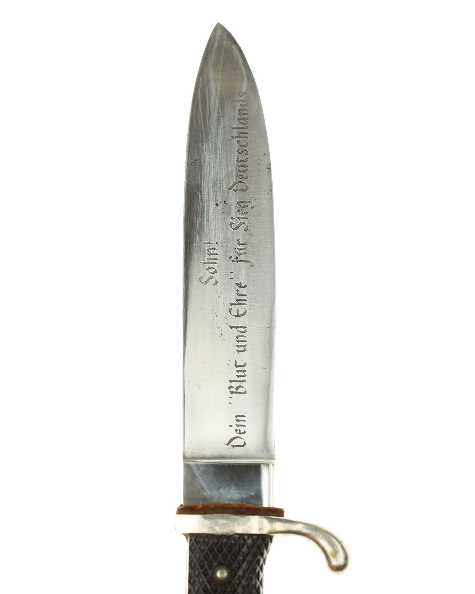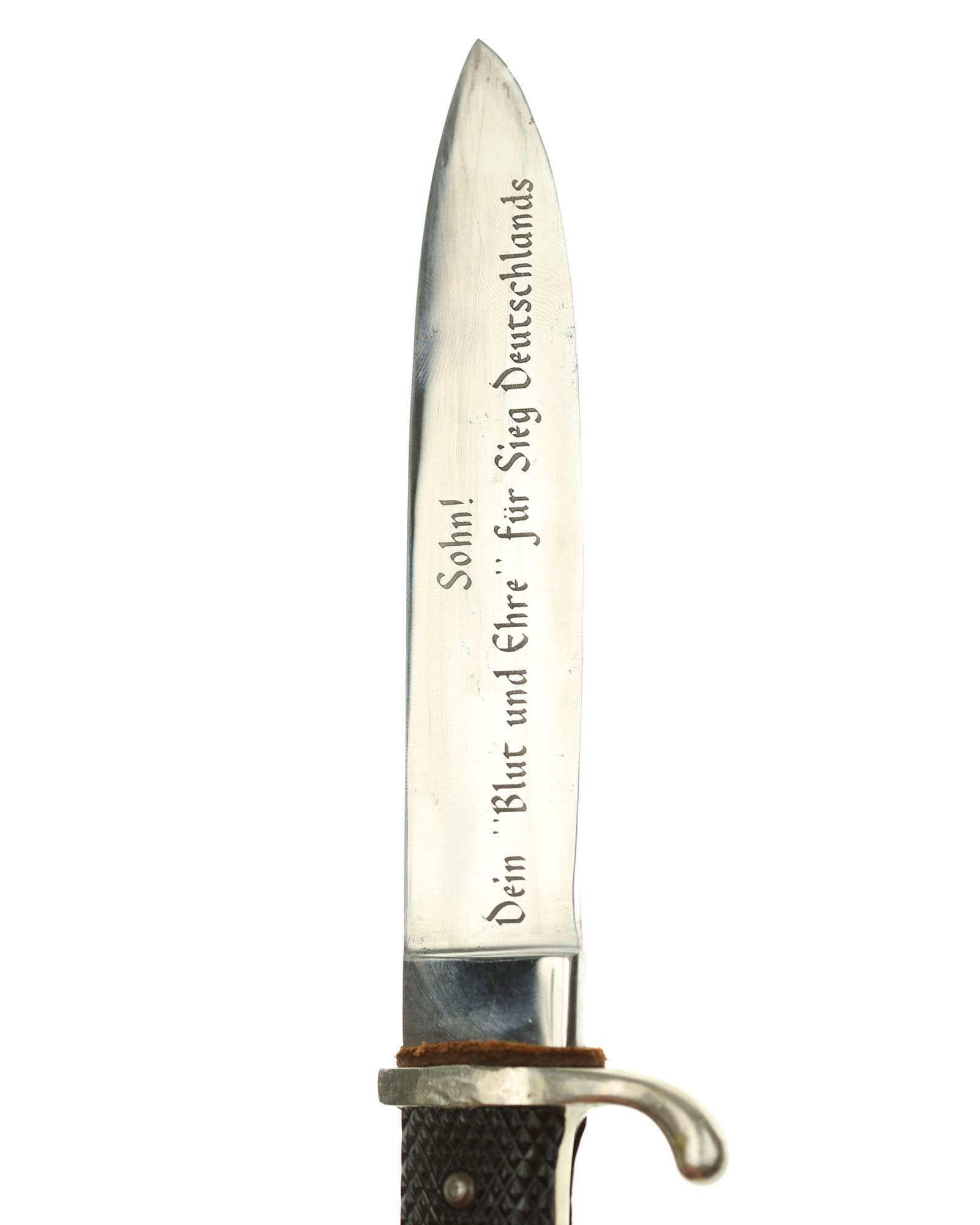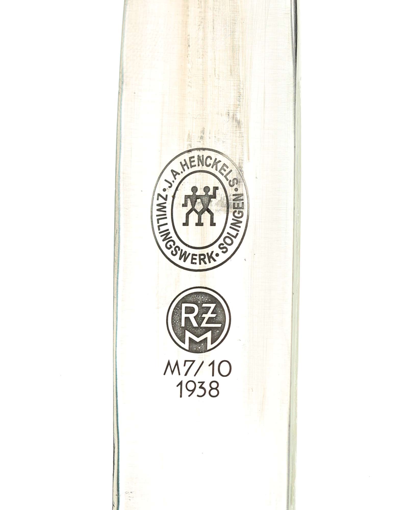 Klinge: Die Klinge ist einschneidig und aus Gussstahl. Diese ist in den Griff eingelassen und vernietet. Die Klinge hat eine Gravur auf der Vorderseite: Sohn! Dein "Blut und Ehre" für Sieg Deutschlands. Die Rückseite der Klinge ist mit dem RZM Hersteller: RZM M7/10 (Zwillingswerk Solingen).