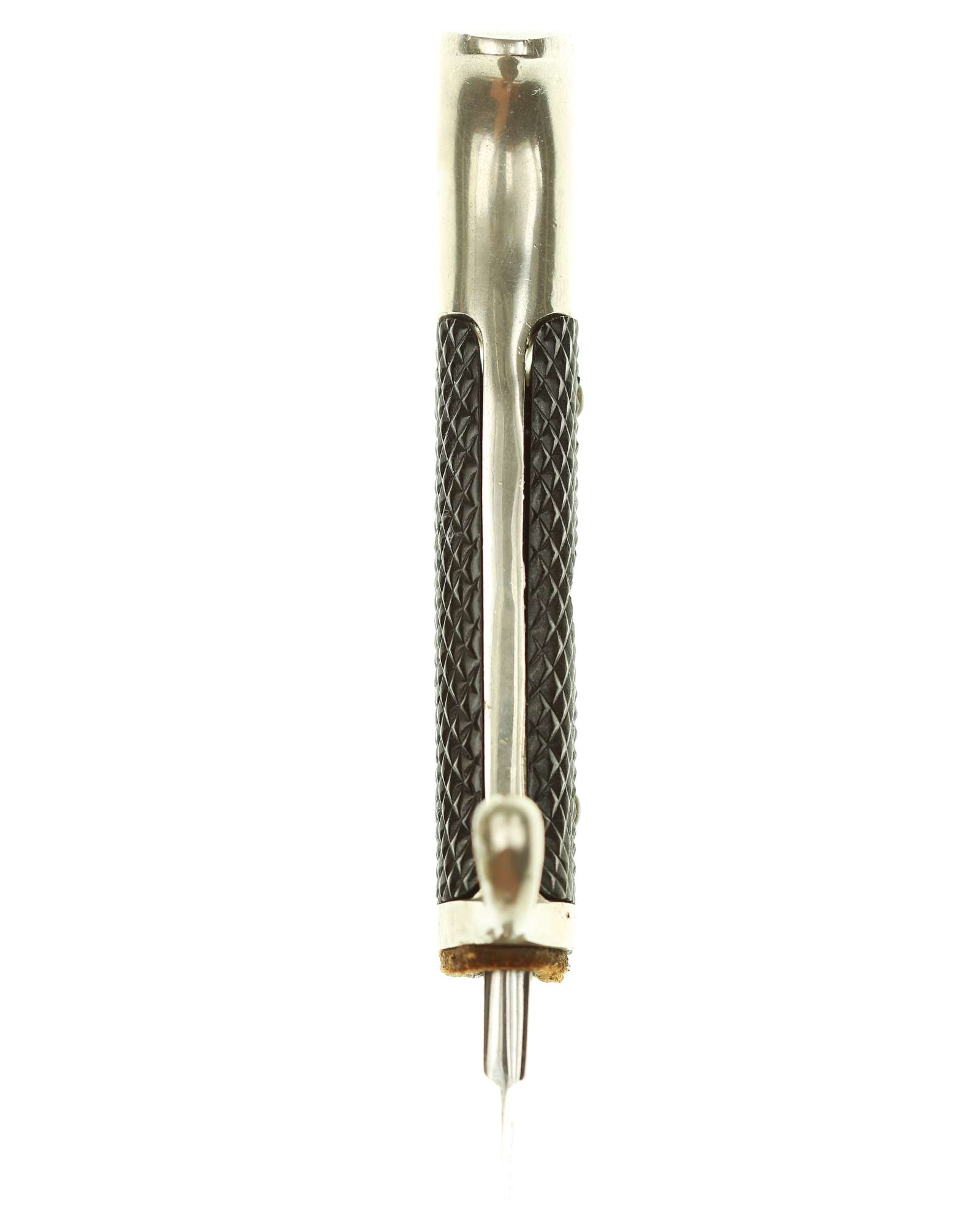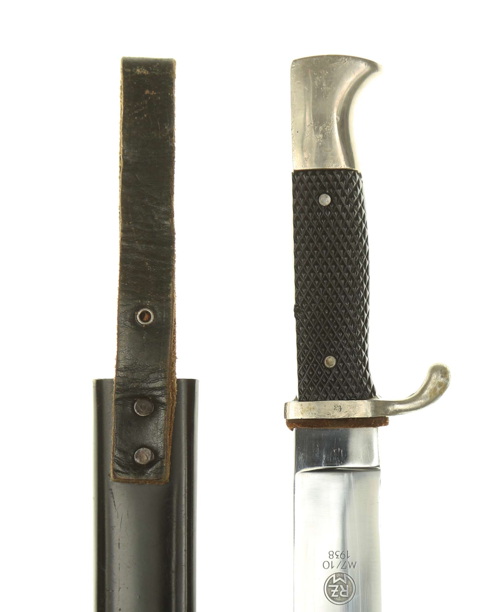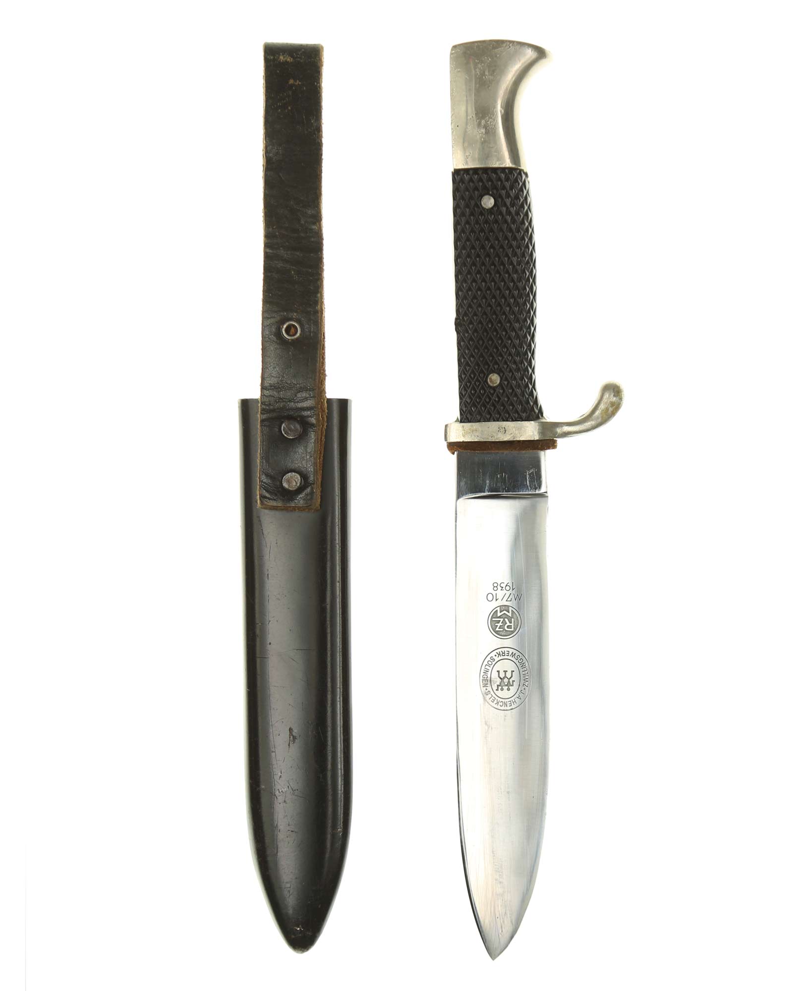 Klinge: Die Klinge ist einschneidig und aus Gussstahl. Diese ist in den Griff eingelassen und vernietet. Die Klinge hat eine Gravur auf der Vorderseite: Sohn! Dein "Blut und Ehre" für Sieg Deutschlands. Die Rückseite der Klinge ist mit dem RZM Hersteller: RZM M7/10 (Zwillingswerk Solingen).