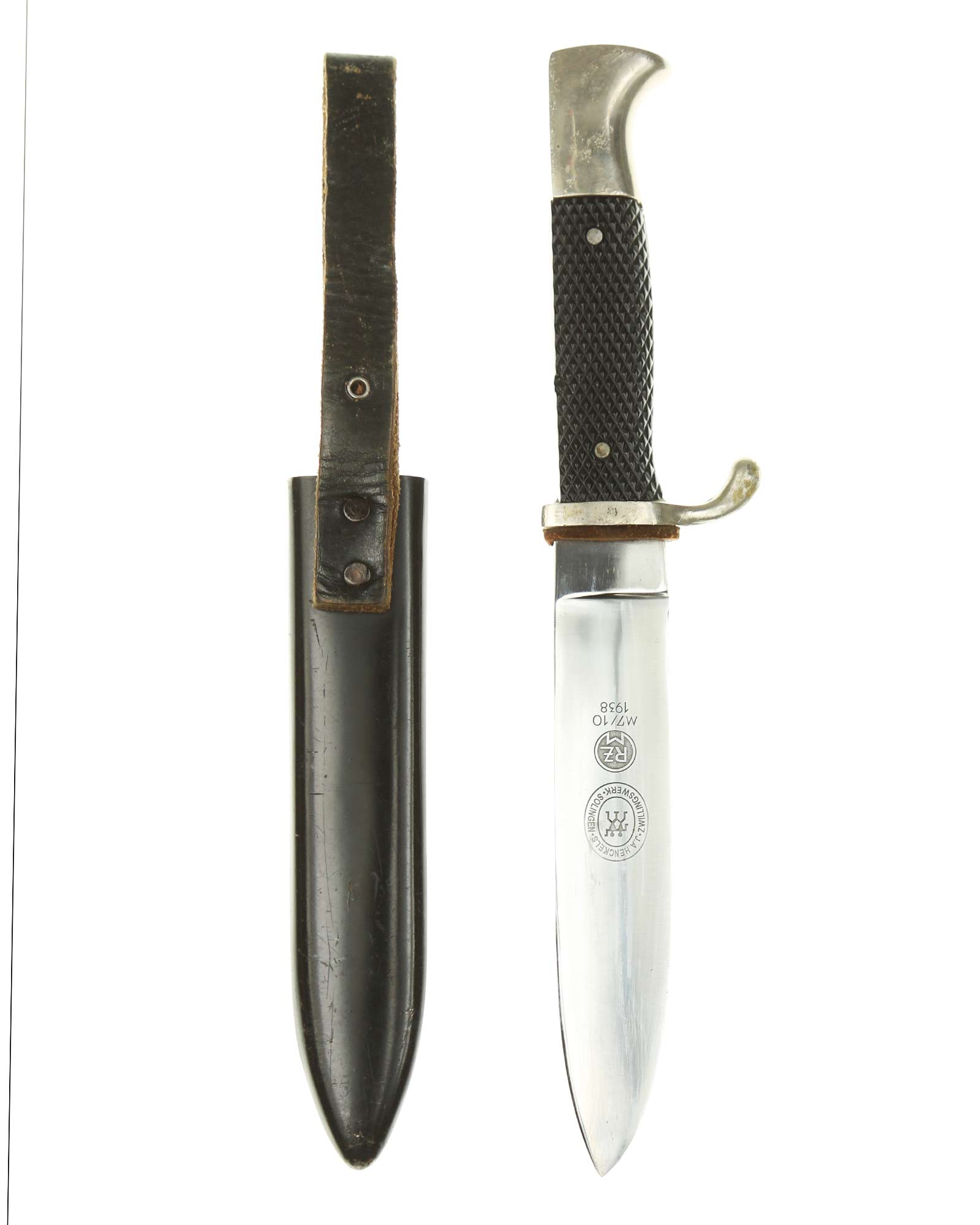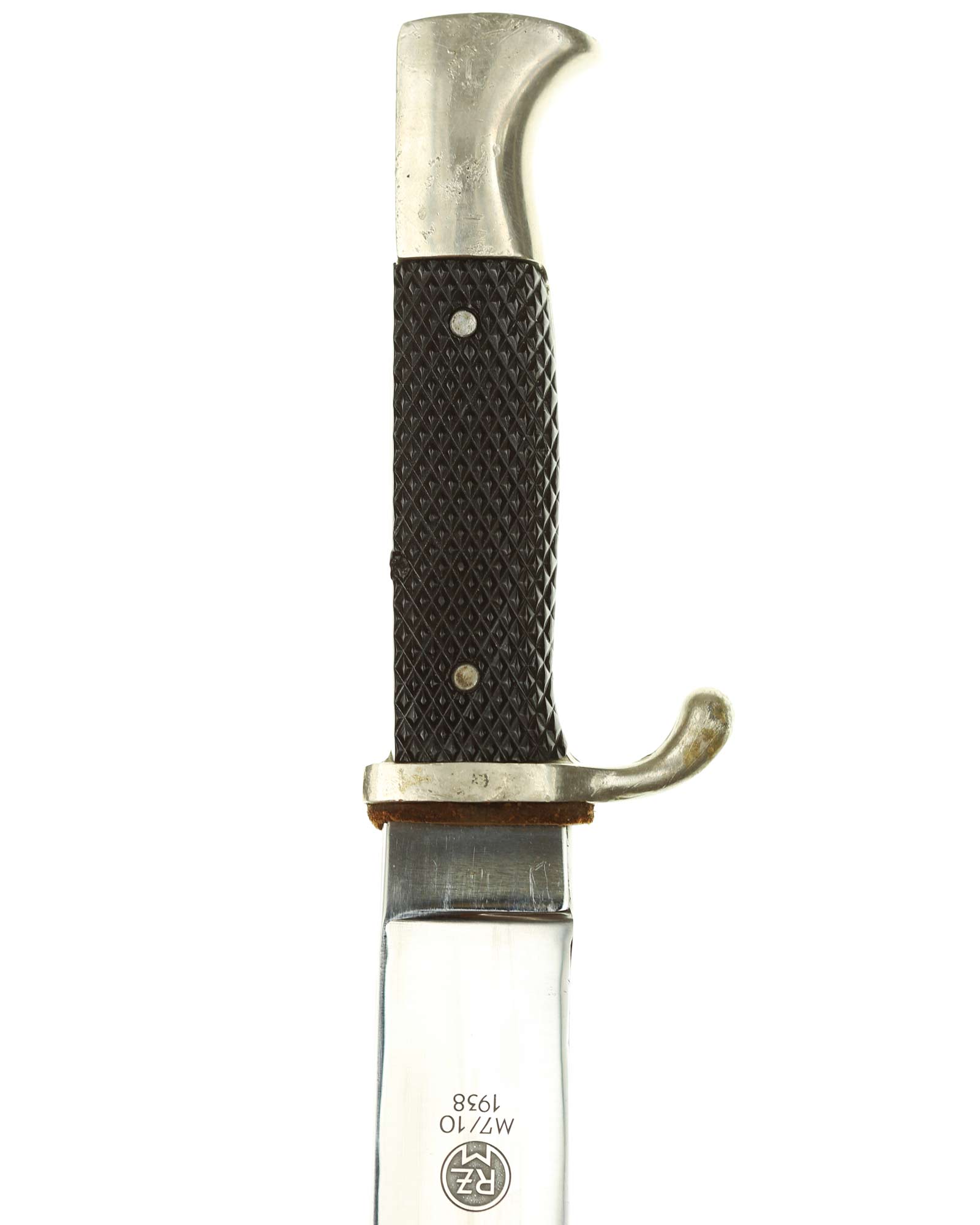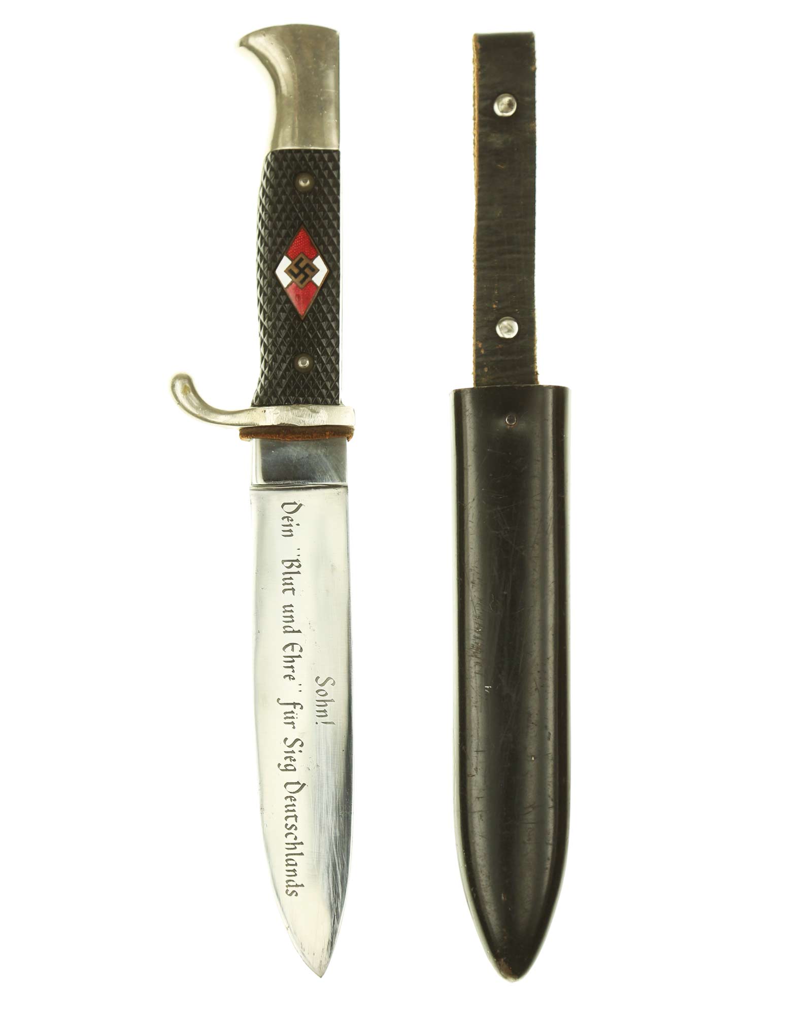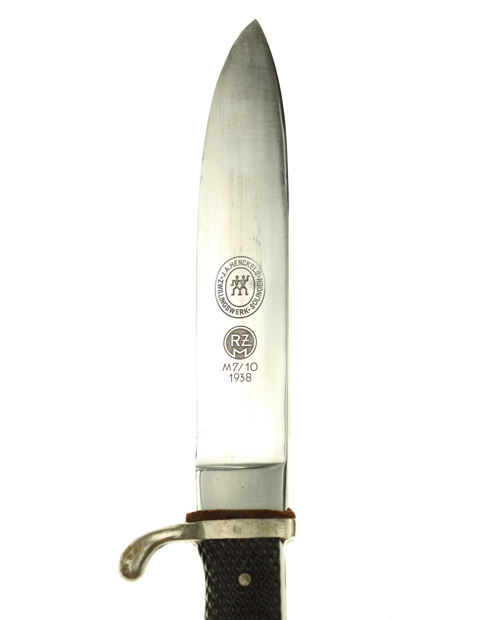 HJ Fahrtenmesser [Hitlerjugend] in mittlerer Fertigung 1936-1938 mit Gravur. HJ Messer ist auf der Rückseite mit Hersteller und RZM Code: RZM M7/10 (Zwillingswerk Solingen).