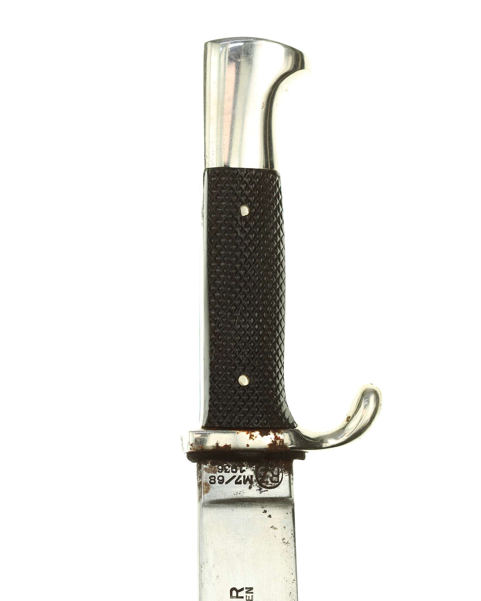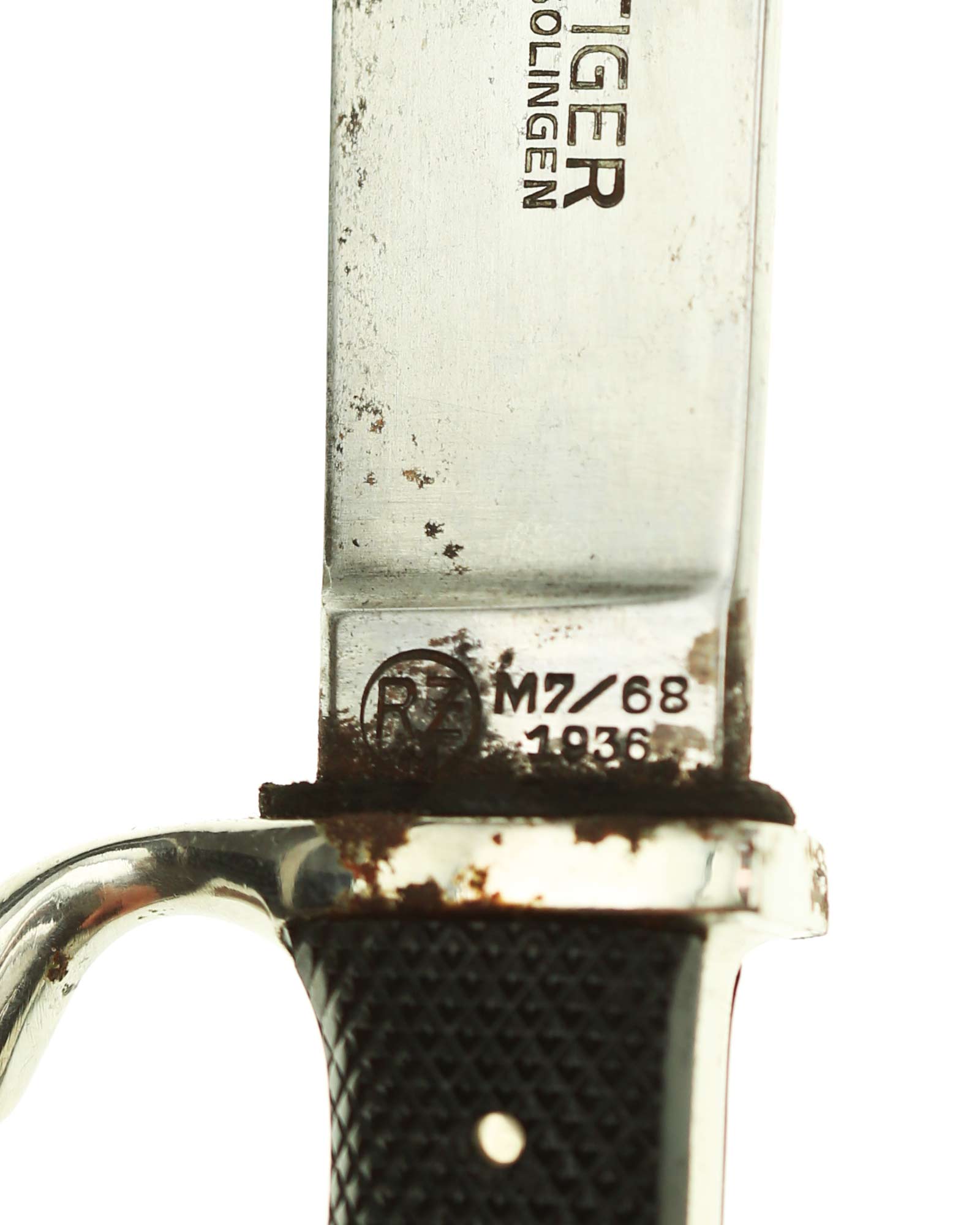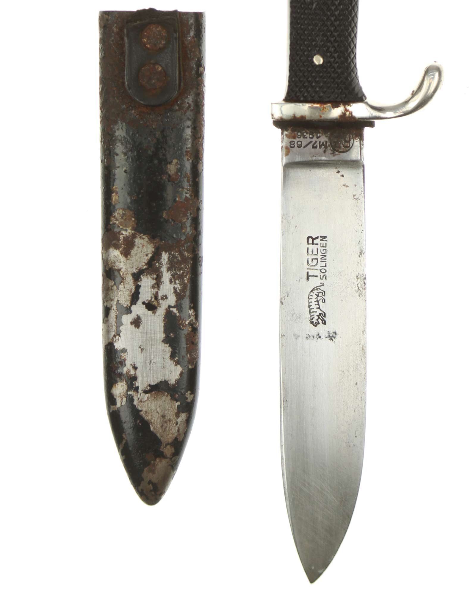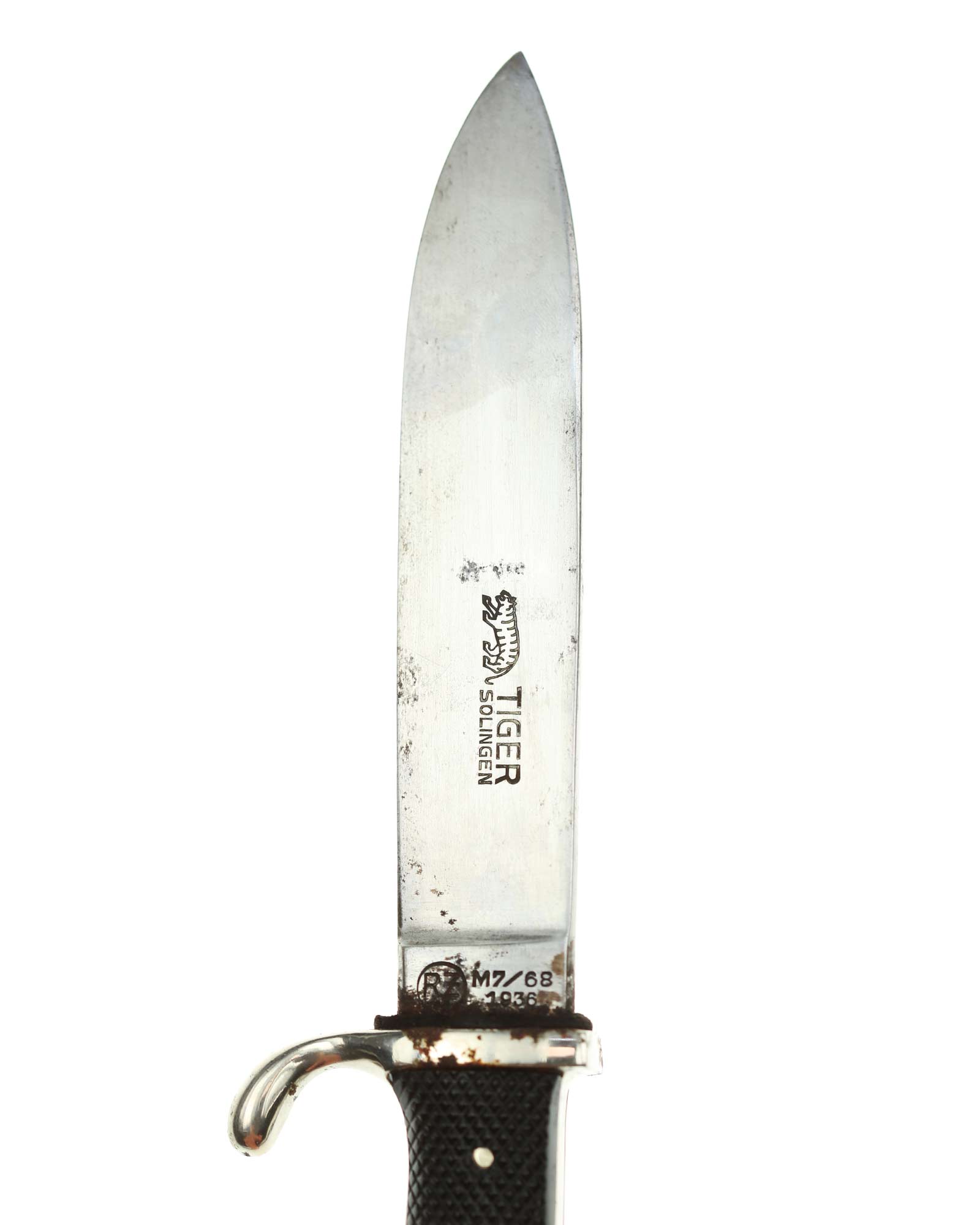 Klinge: Die Klinge ist einschneidig und aus Gussstahl. Diese ist in den Griff eingelassen und vernietet. Auf der vorderen Seite hat die Klinge (bis 19.08.1938) die typische HJ Devise: Blut und Ehre!. Die Rückseite der Klinge ist mit dem Hersteller: Tiger Solingen und RZM Markierung: RZM M7/68, 1936.