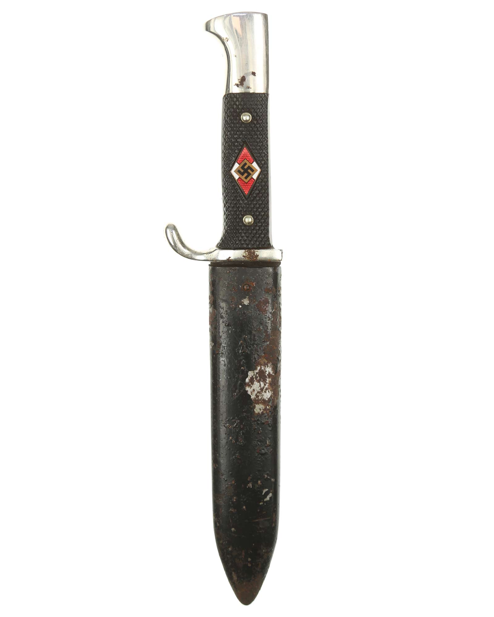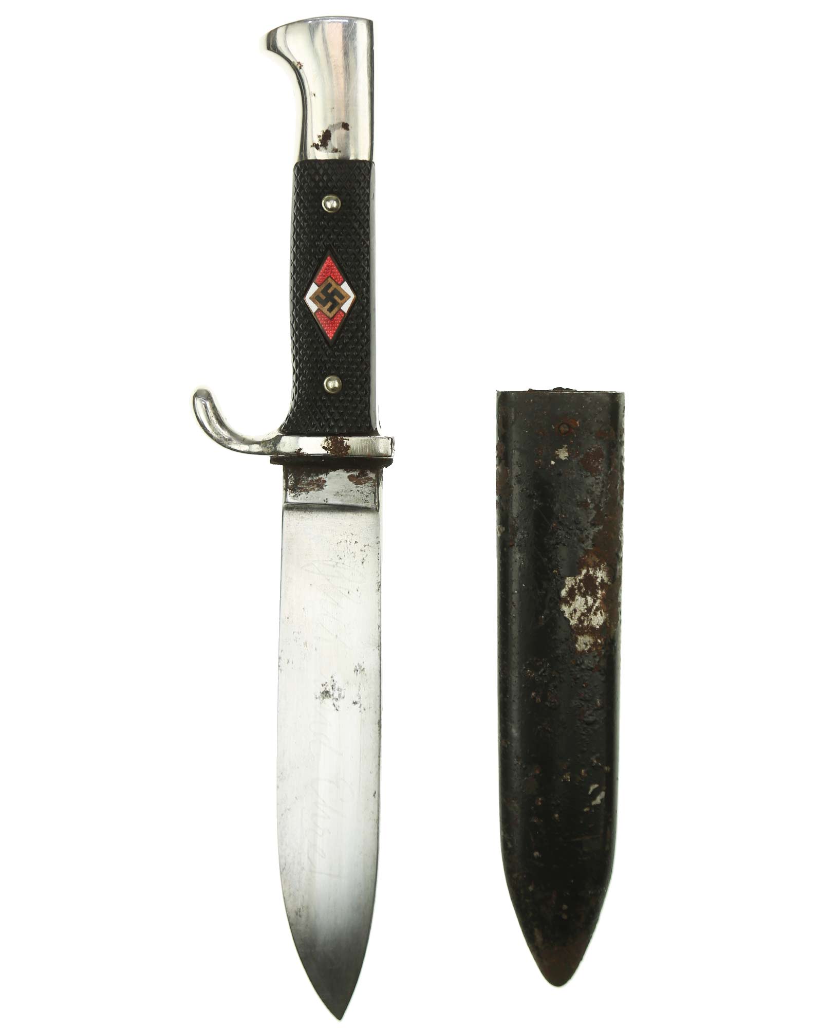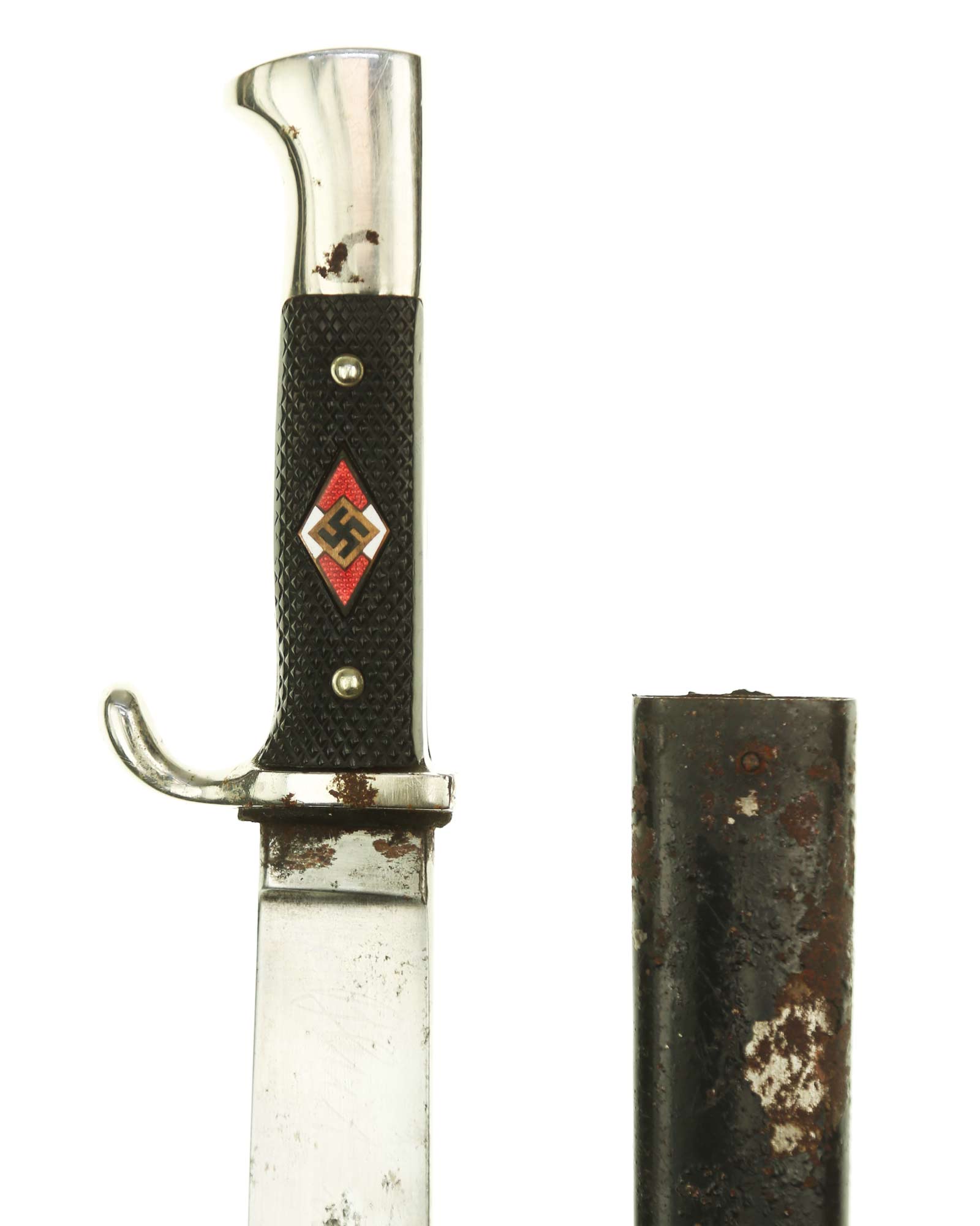 Griff: Vernietete Griffschalen, aus Bakelit mit Fischgrätenmuster in Tiefschwarz. Auf der vorderen Seite befindet sich, in der Mitte der Griffschale, das Hitler-Jugend-Abzeichen. Einseitig gebogene Parierstange bzw. Knebel, dieser ist aus Eisen vernickelt (magnetisch).