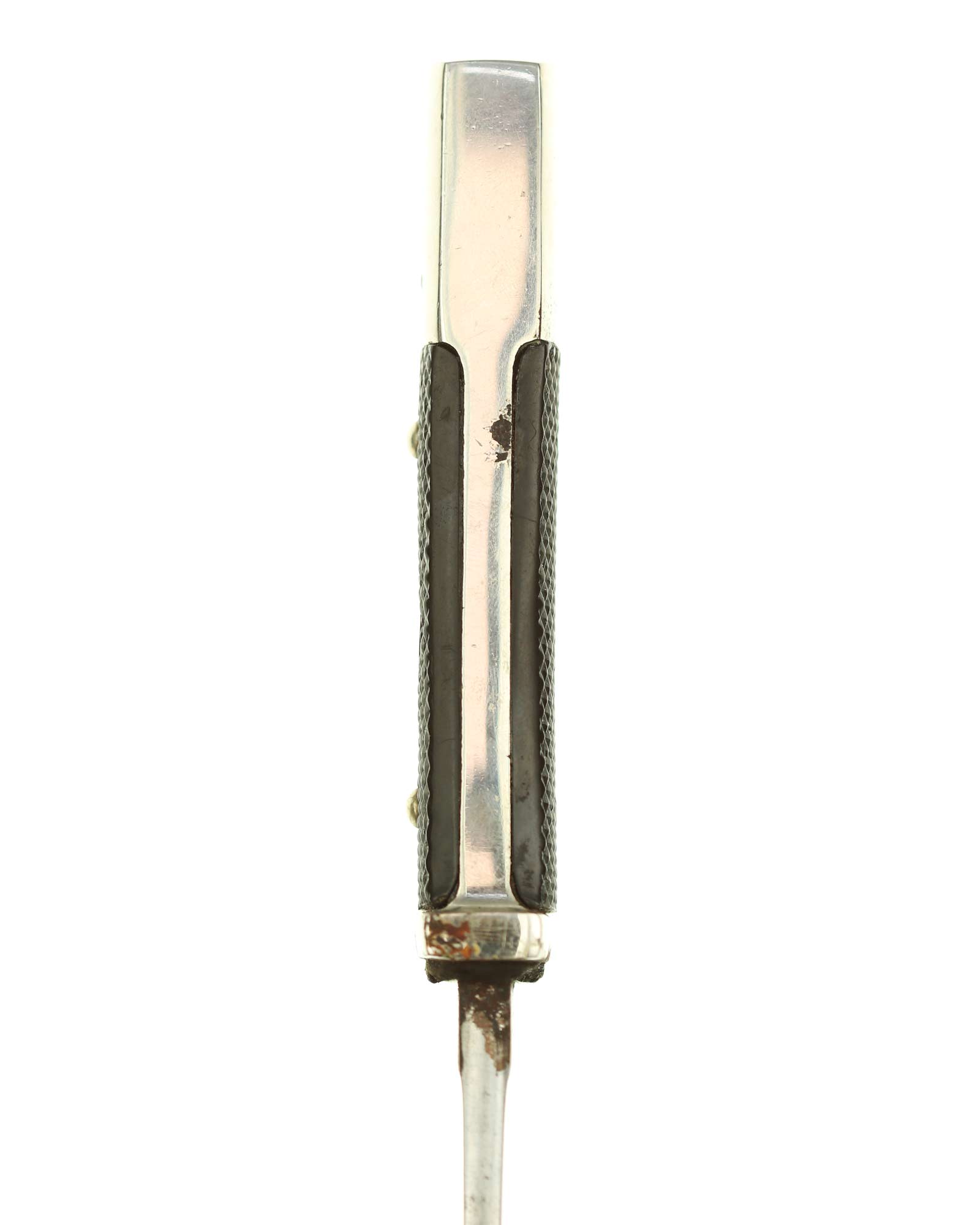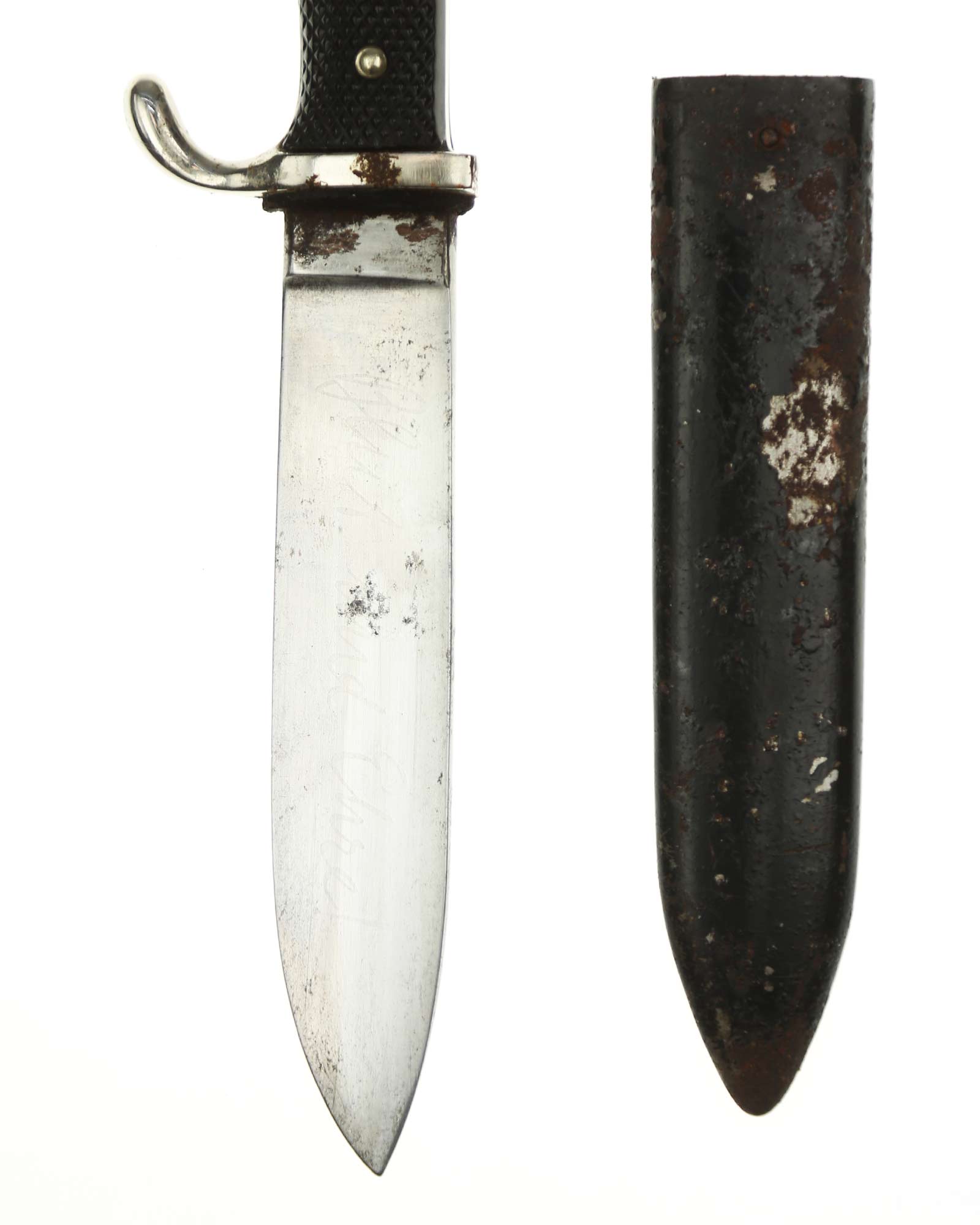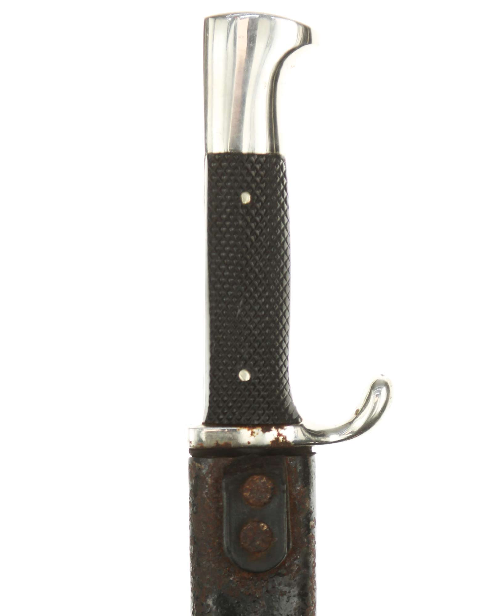 Griff: Vernietete Griffschalen, aus Bakelit mit Fischgrätenmuster in Tiefschwarz. Auf der vorderen Seite befindet sich, in der Mitte der Griffschale, das Hitler-Jugend-Abzeichen. Einseitig gebogene Parierstange bzw. Knebel, dieser ist aus Eisen vernickelt (magnetisch).