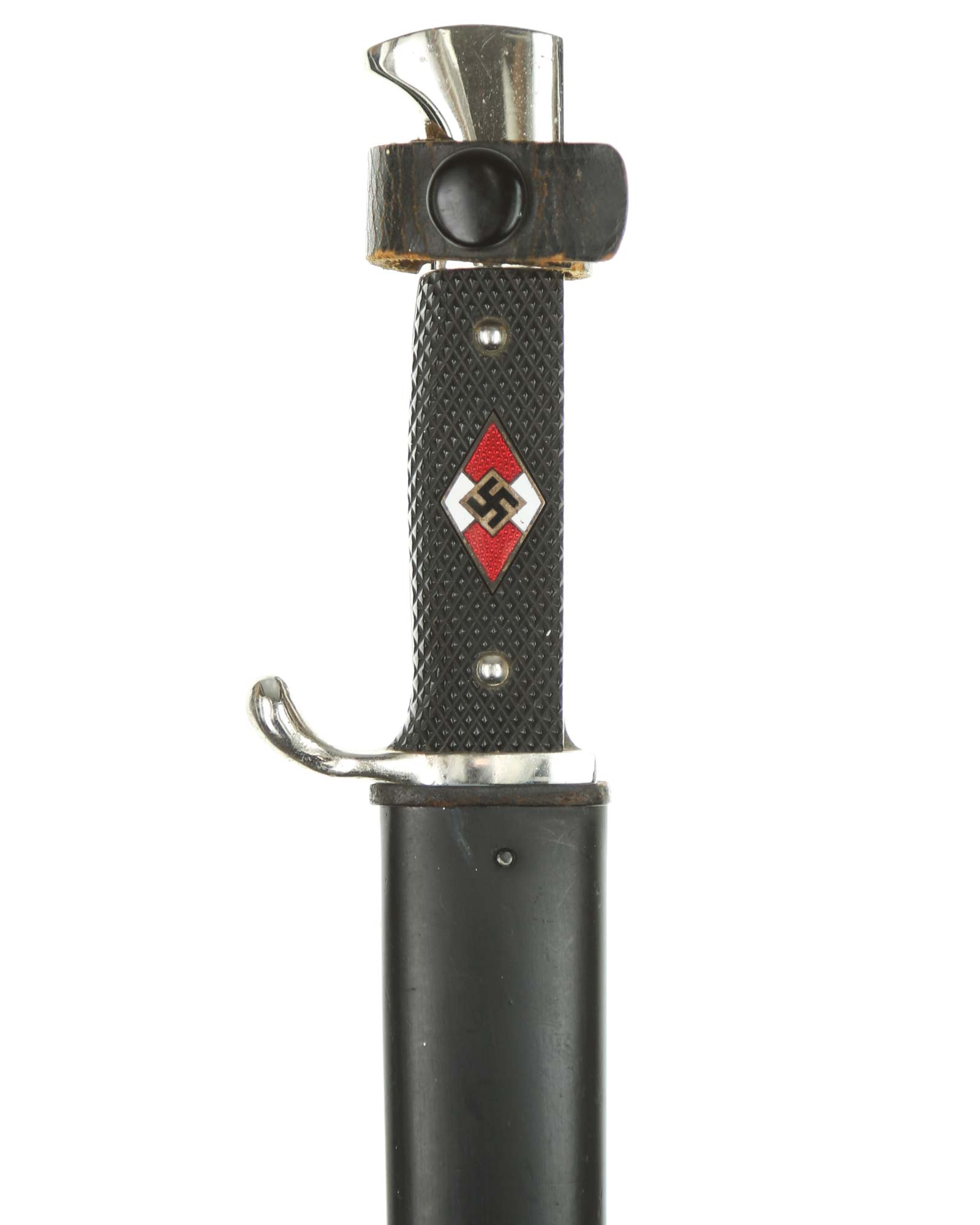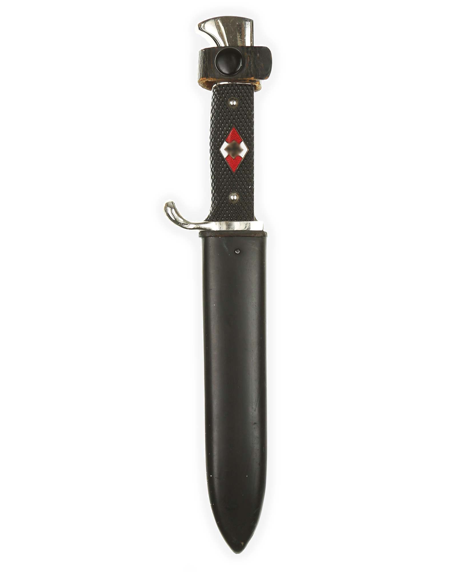 Griff: Vernietete Griffschale, aus Bakelit mit Fischgrätenmuster in Tiefschwarz. Auf der vorderen Seite befindet sich, in der Mitte der Griffschale, das Hitler-Jugend-Abzeichen. Einseitig gebogene Parierstange bzw. Knebel.