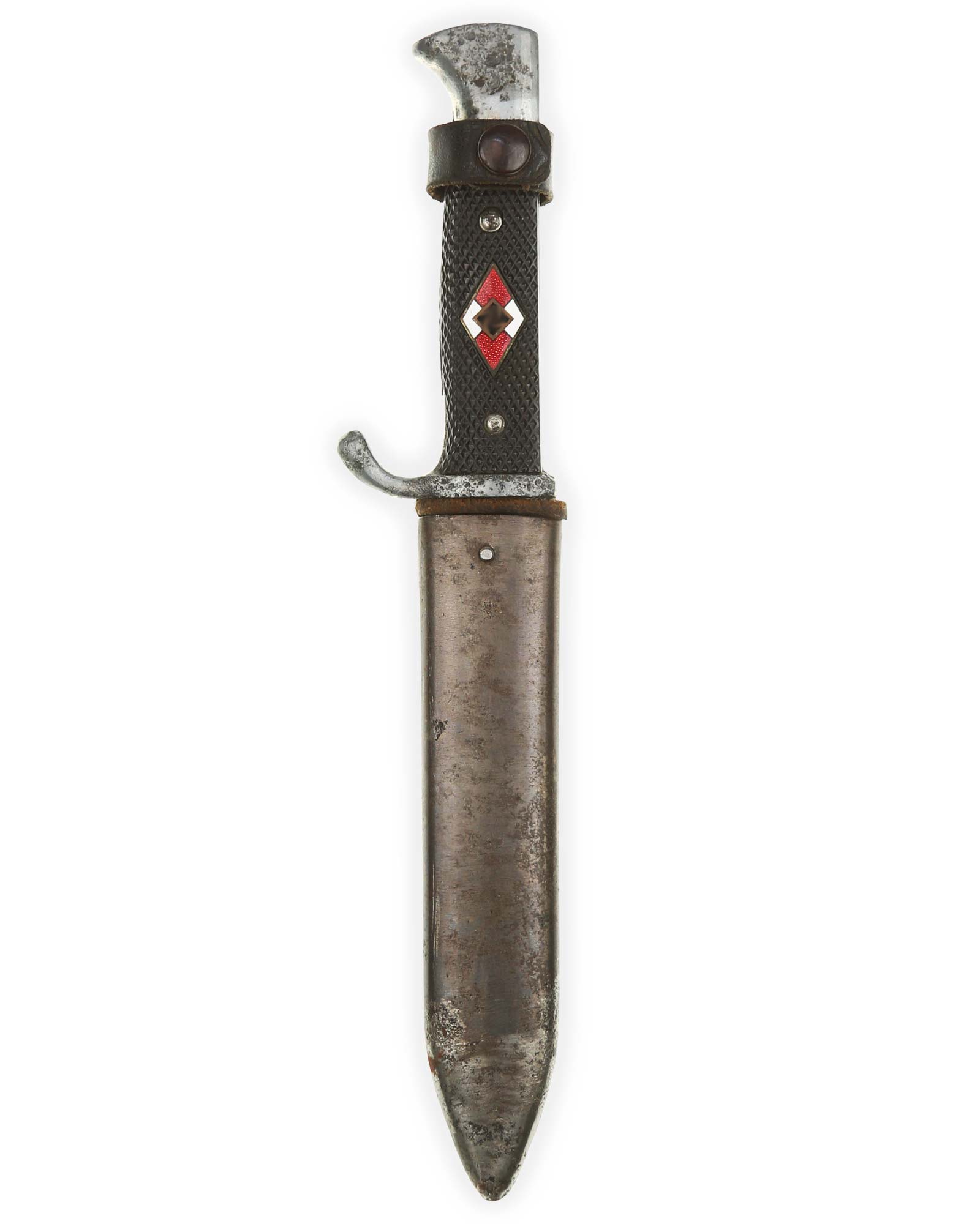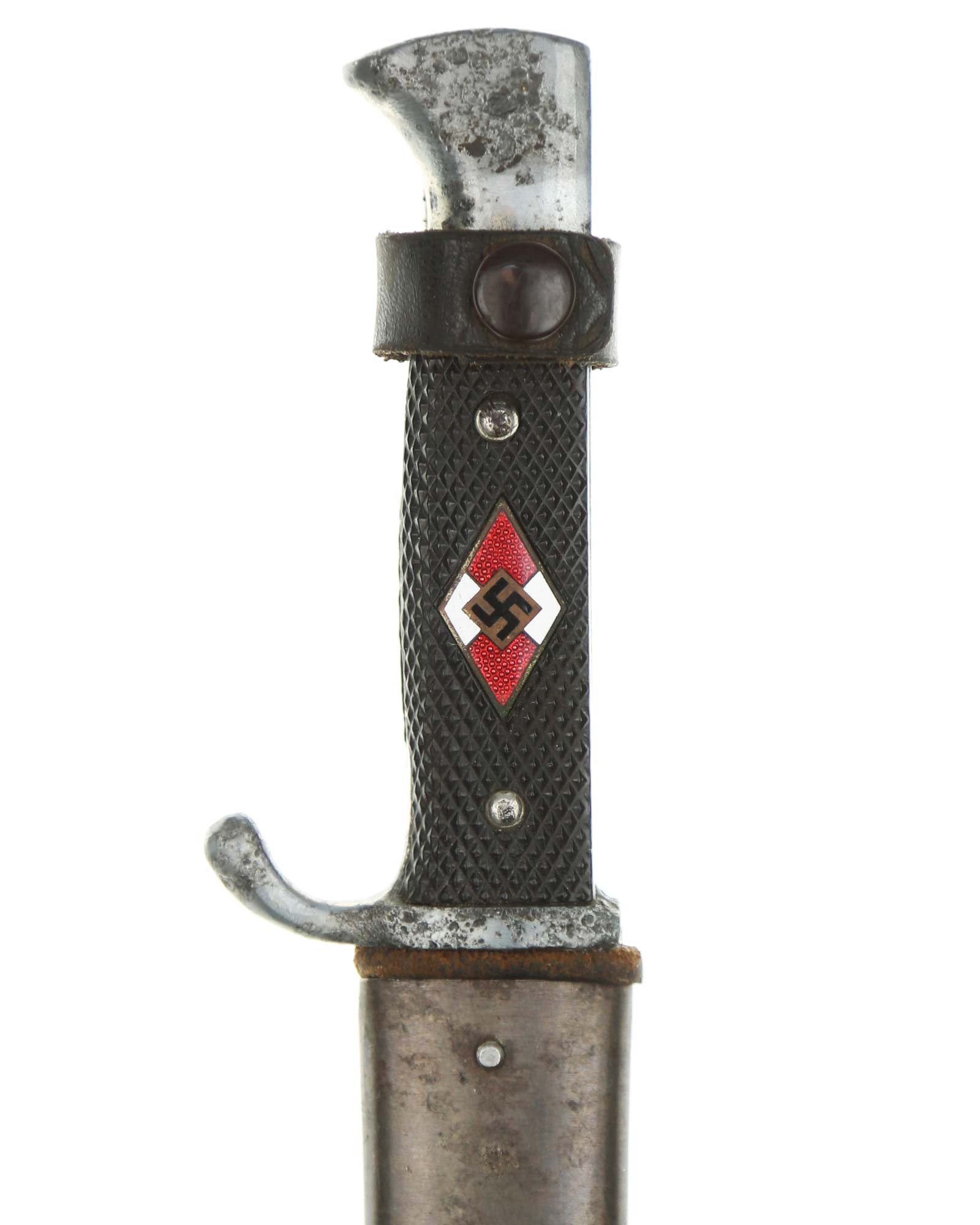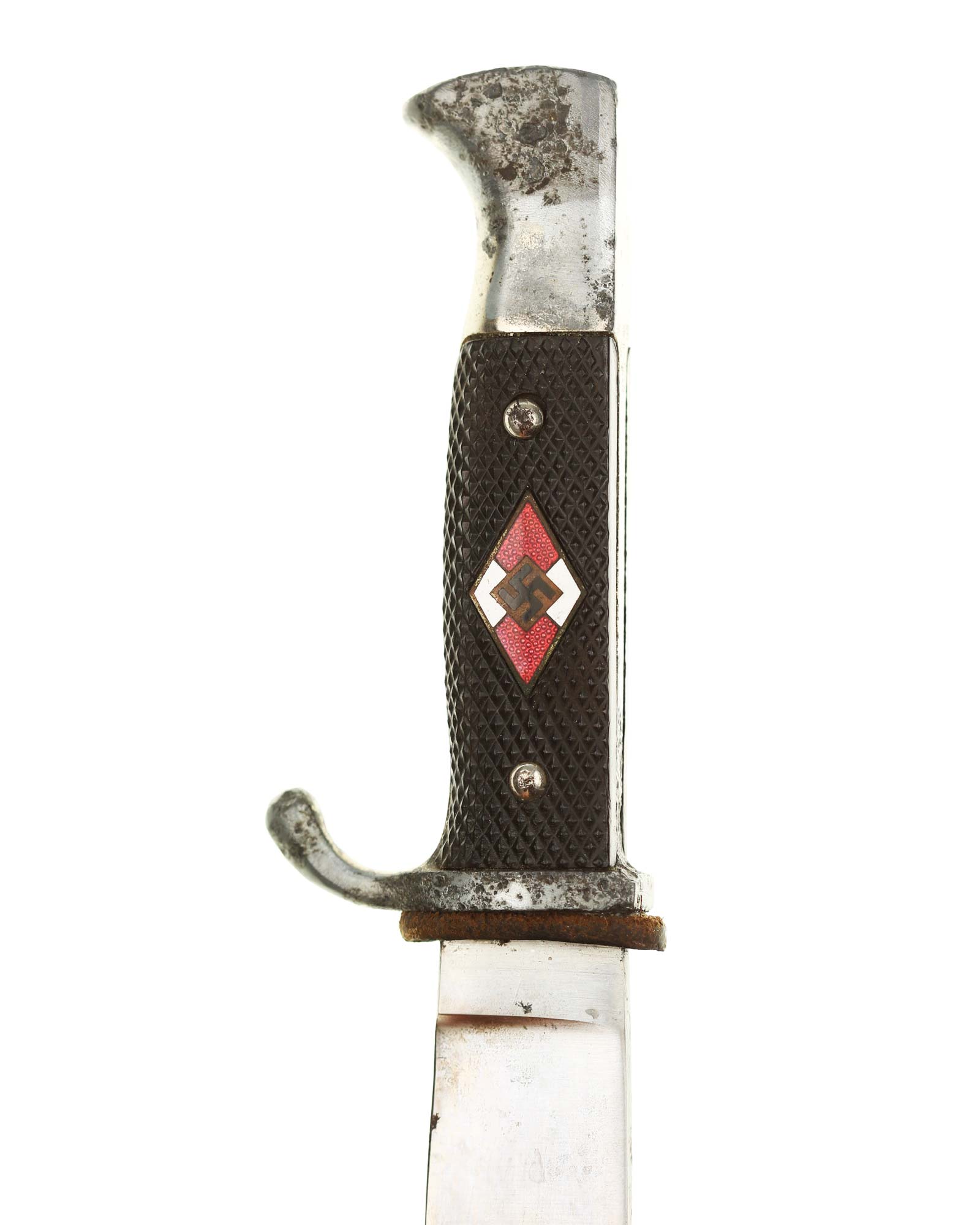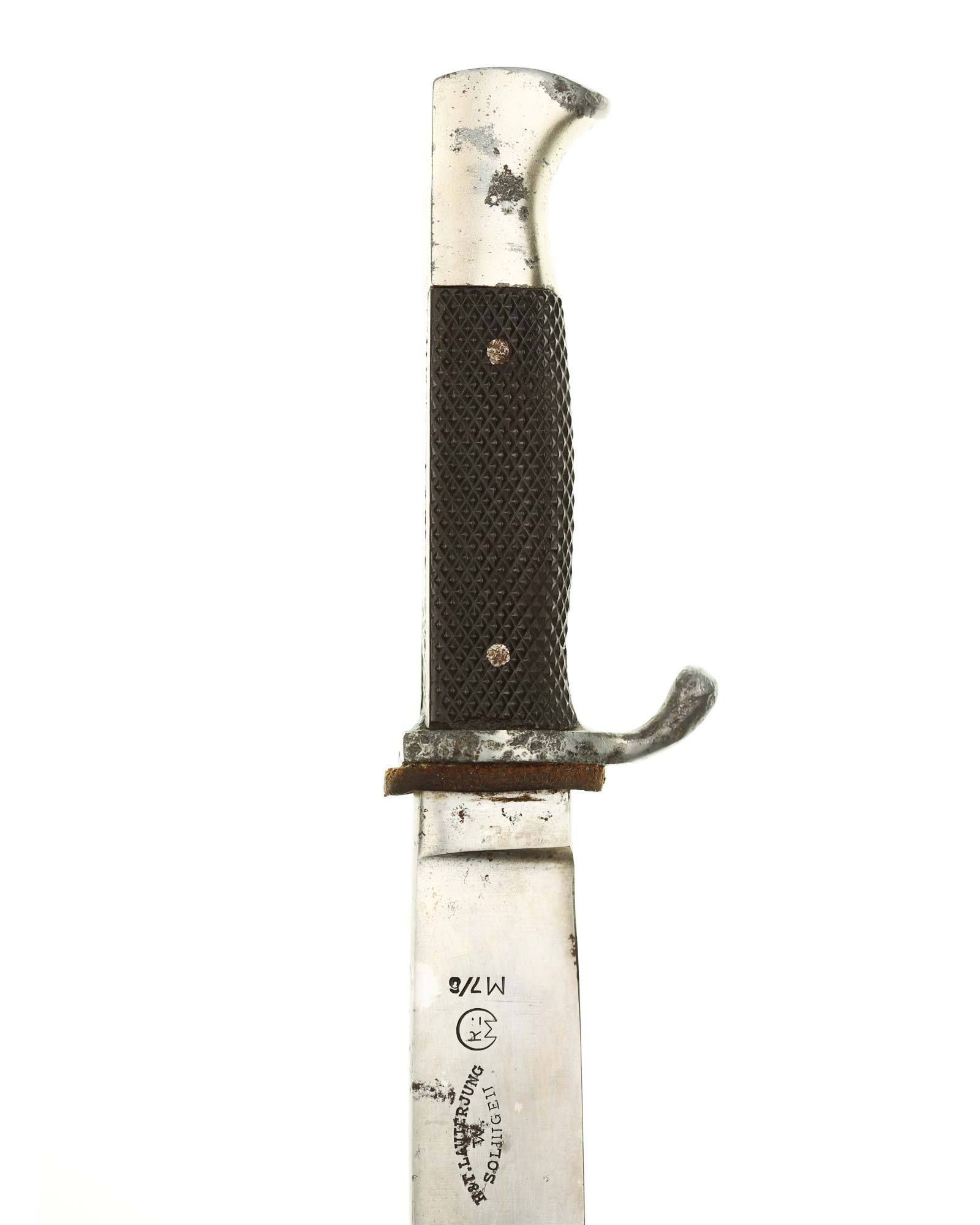 Griff: Vernietete Griffschalen, aus Bakelit mit Fischgrätenmuster in Tiefschwarz. Auf der vorderen Seite befindet sich, in der Mitte der Griffschale, das Hitler-Jugend-Abzeichen (versplintet). Einseitig gebogene Parierstange bzw. Knebel.