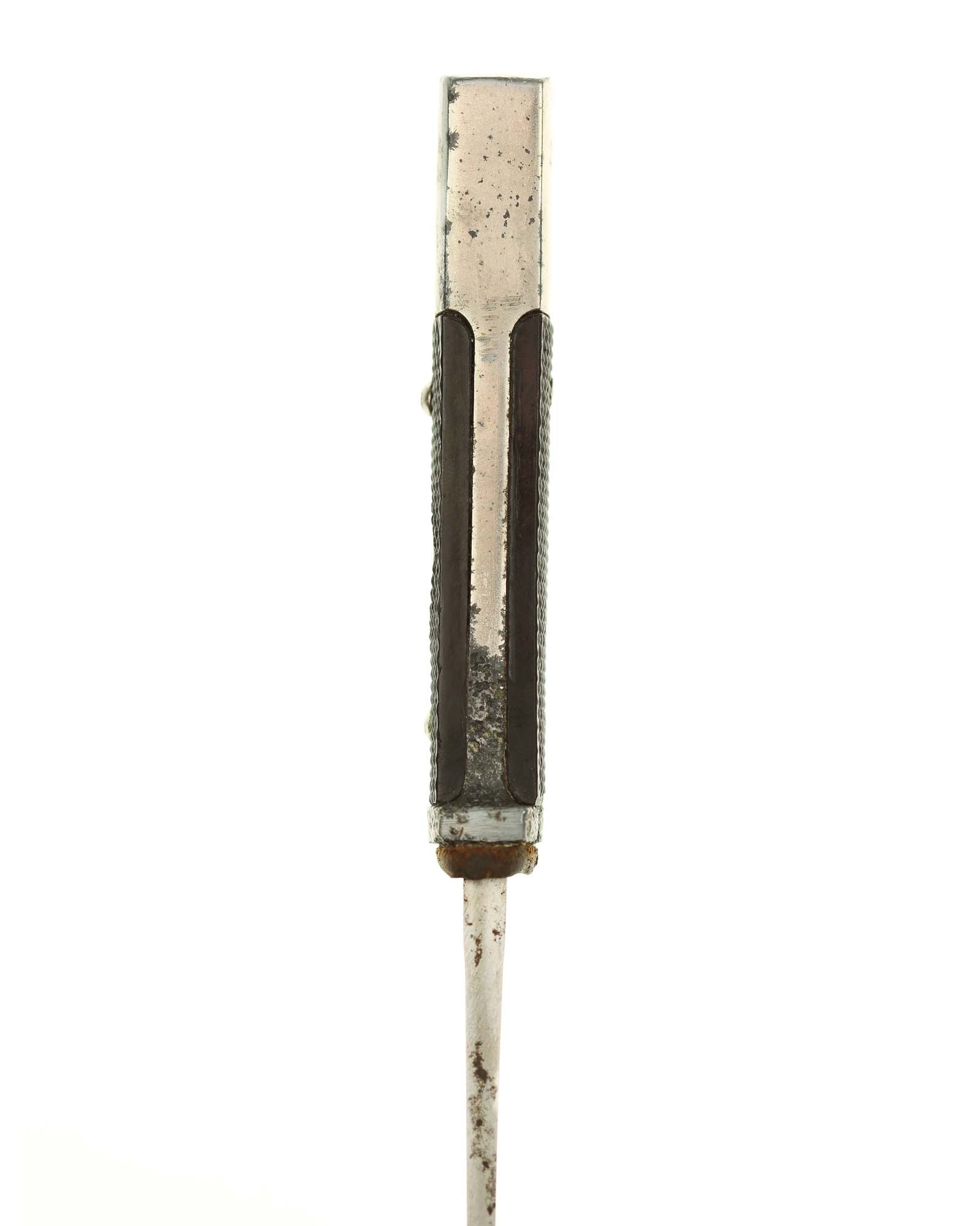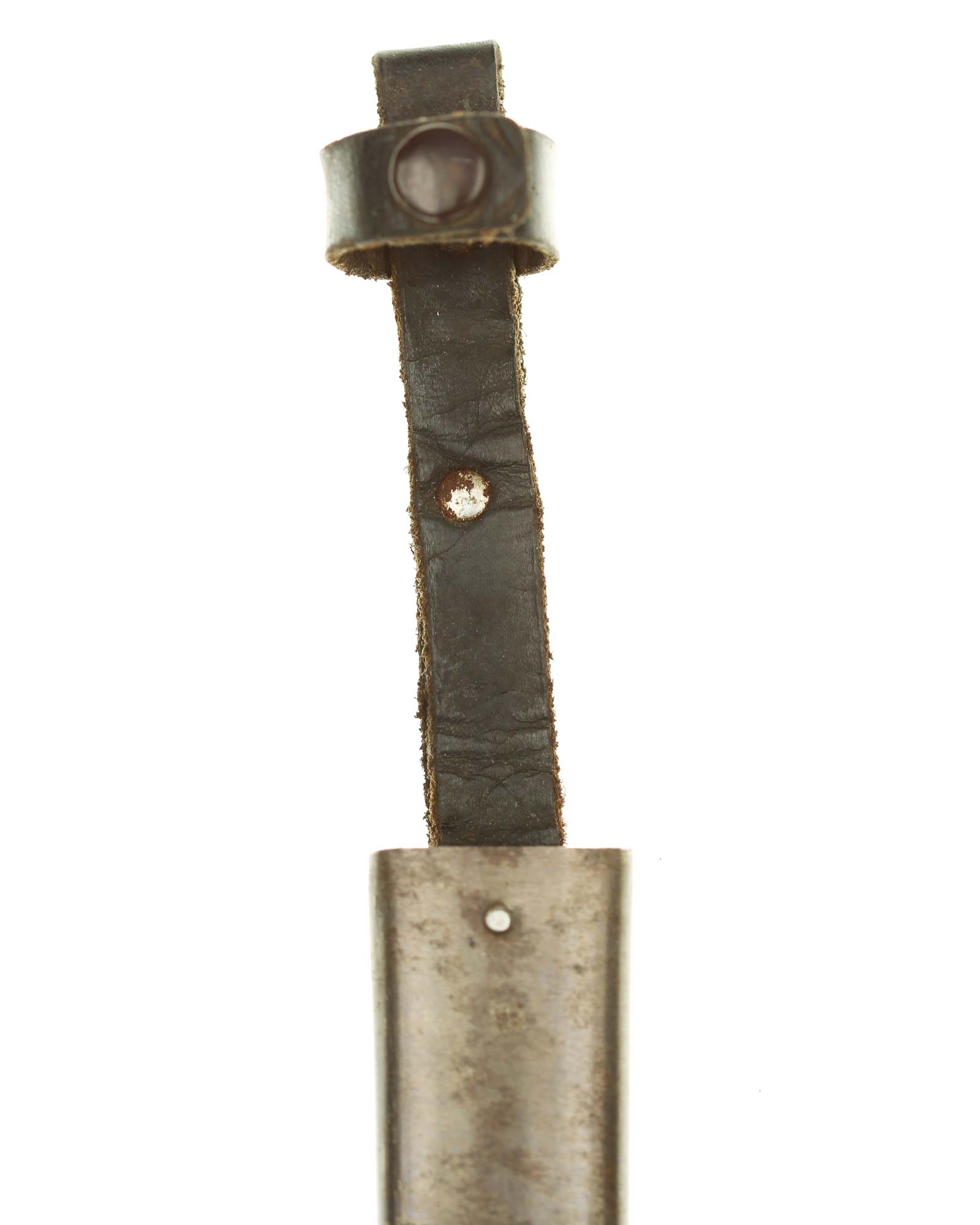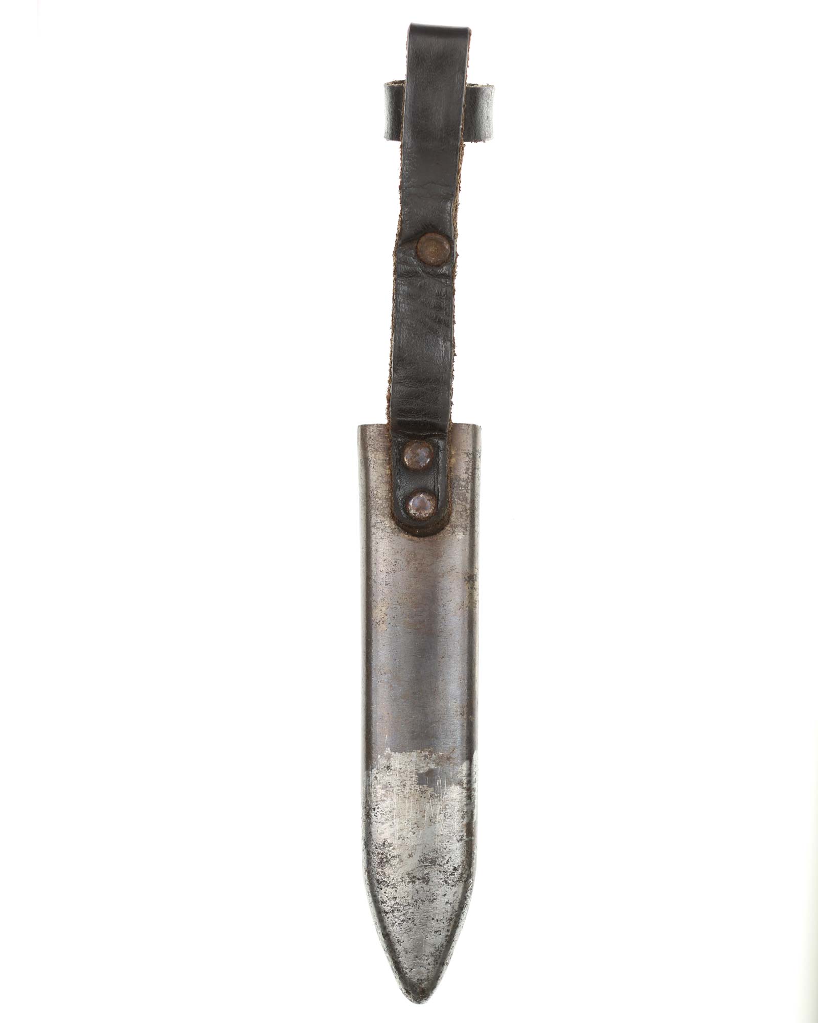 Scheide: Die Scheide ist aus Eisen. Die Tragevorrichtung besteht aus einer Schlaufe, die aus einem doppelt gelegten Riemen besteht.