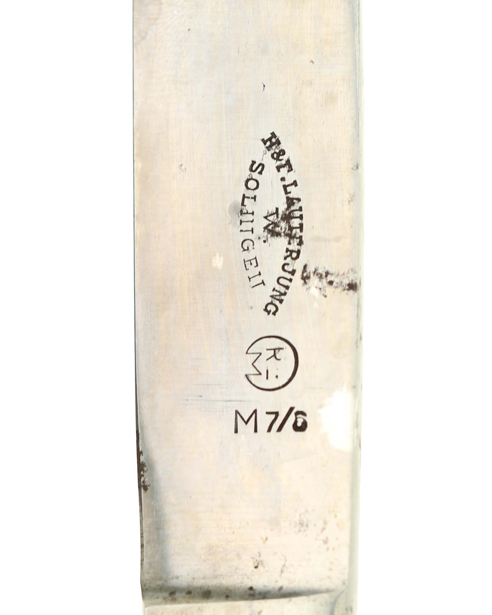Klinge: Die Klinge ist einschneidig und aus Gussstahl. Diese ist in den Griff eingelassen und vernietet. Die Rückseite der Klinge ist mit dem RZM Hersteller: RZM M7/6 und H&F. Lauterjung W. Solingen.