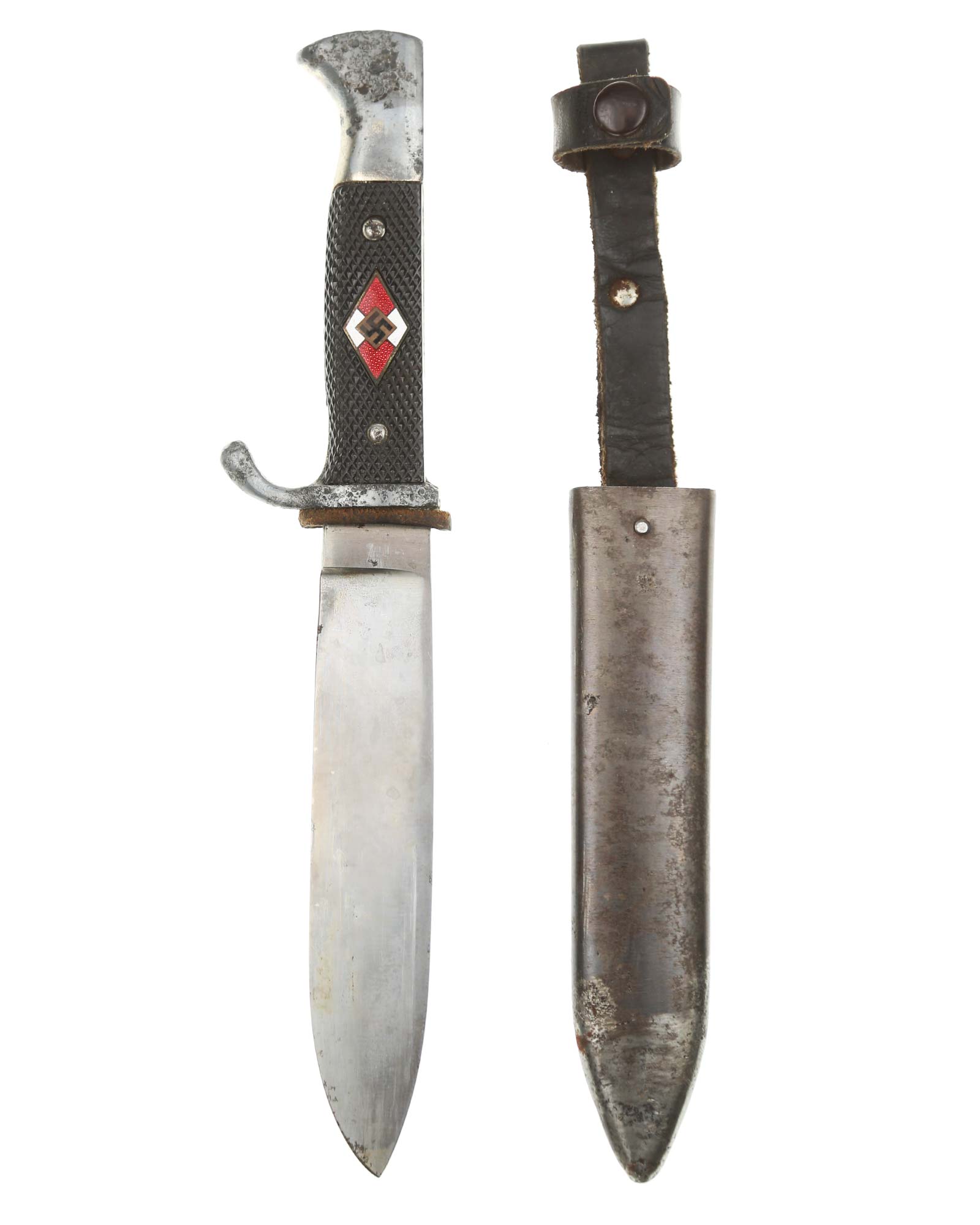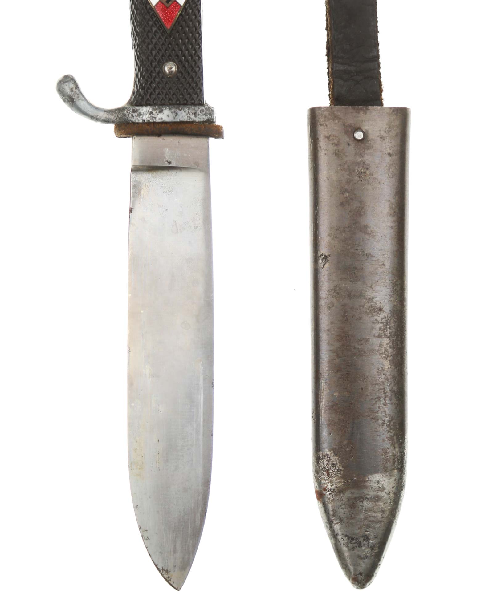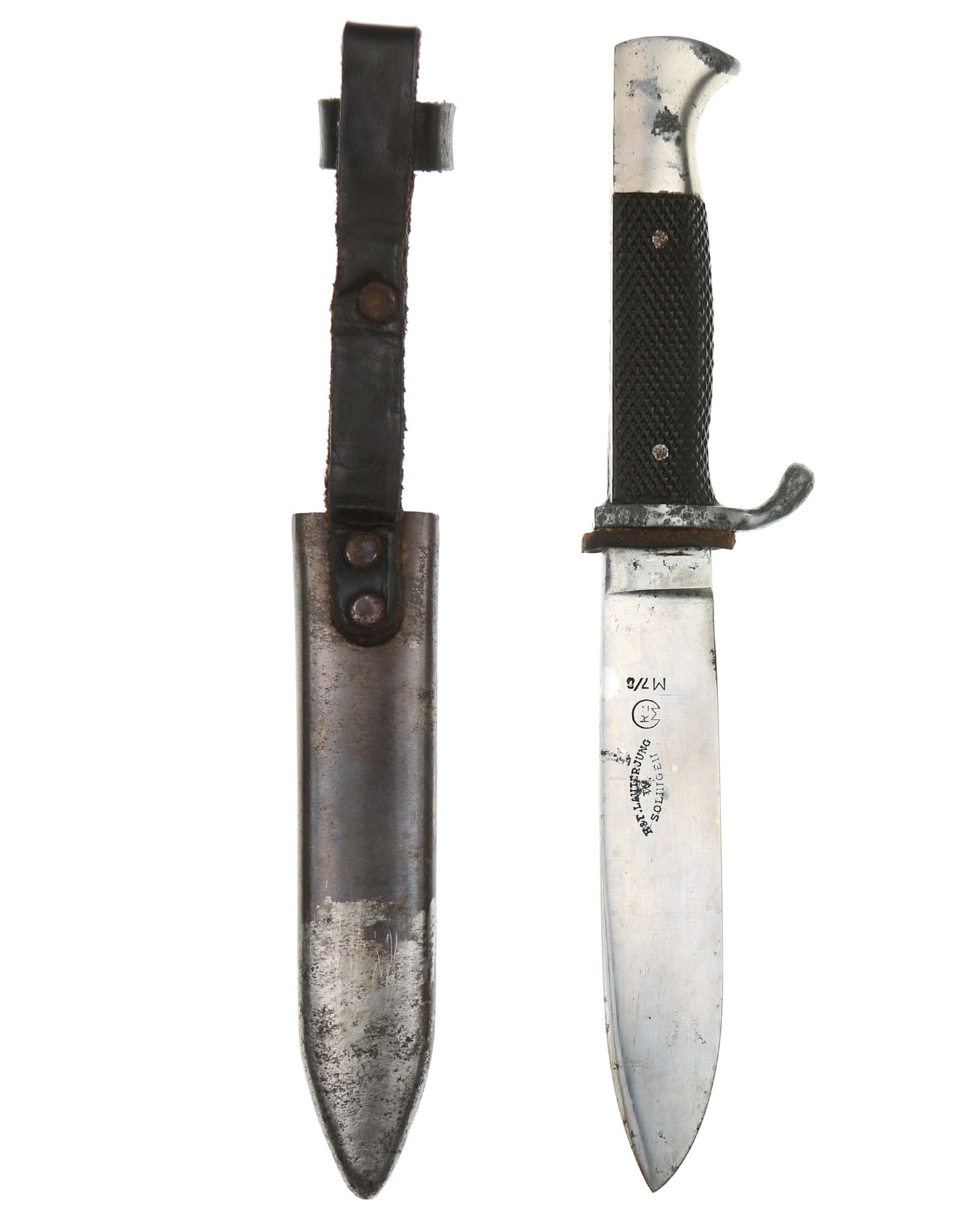 HJ Fahrtenmesser [Hitlerjugend] in mittlerer Fertigung 1936-1938. HJ Messer ist auf der Rückseite mit Hersteller und RZM Code: M7/6 (H&F. Lauterjung W. Solingen).