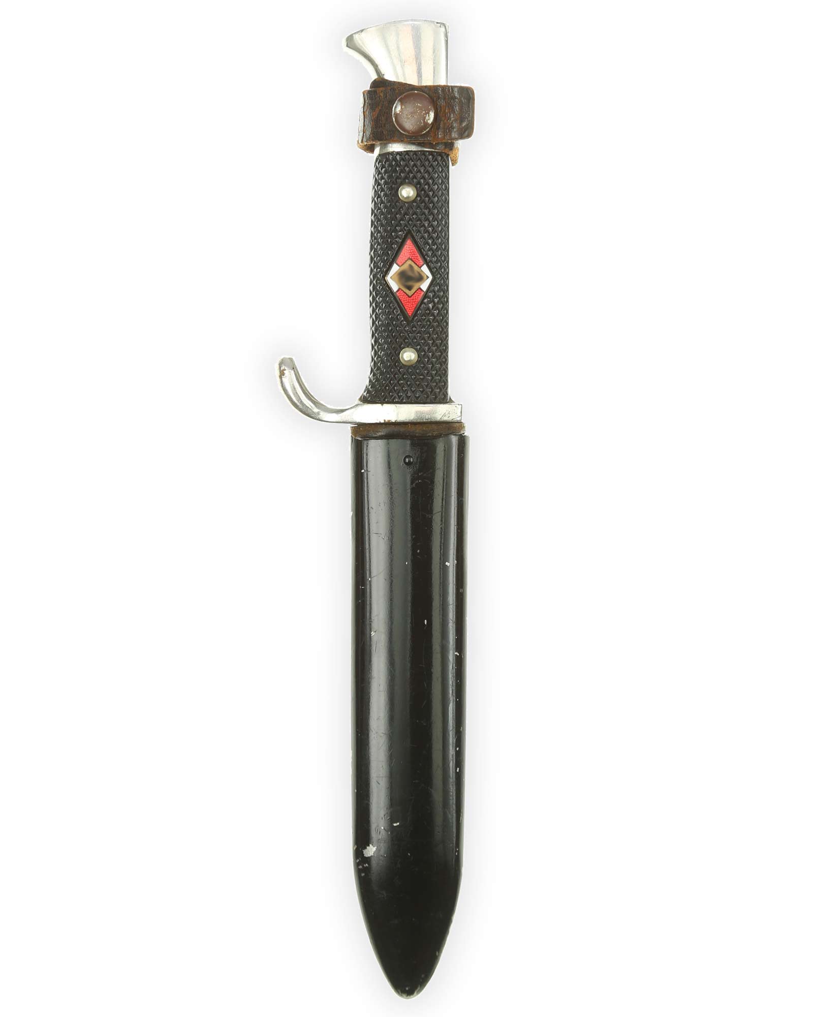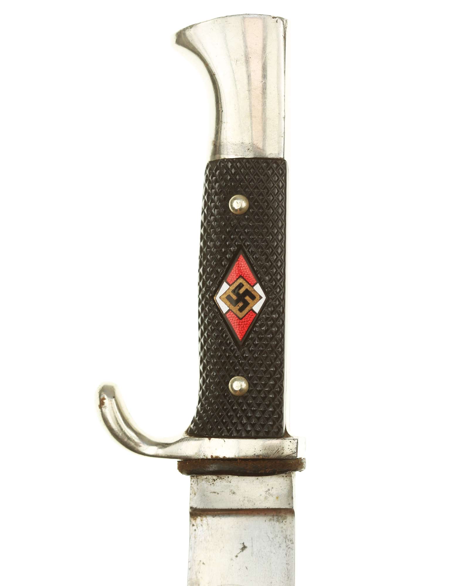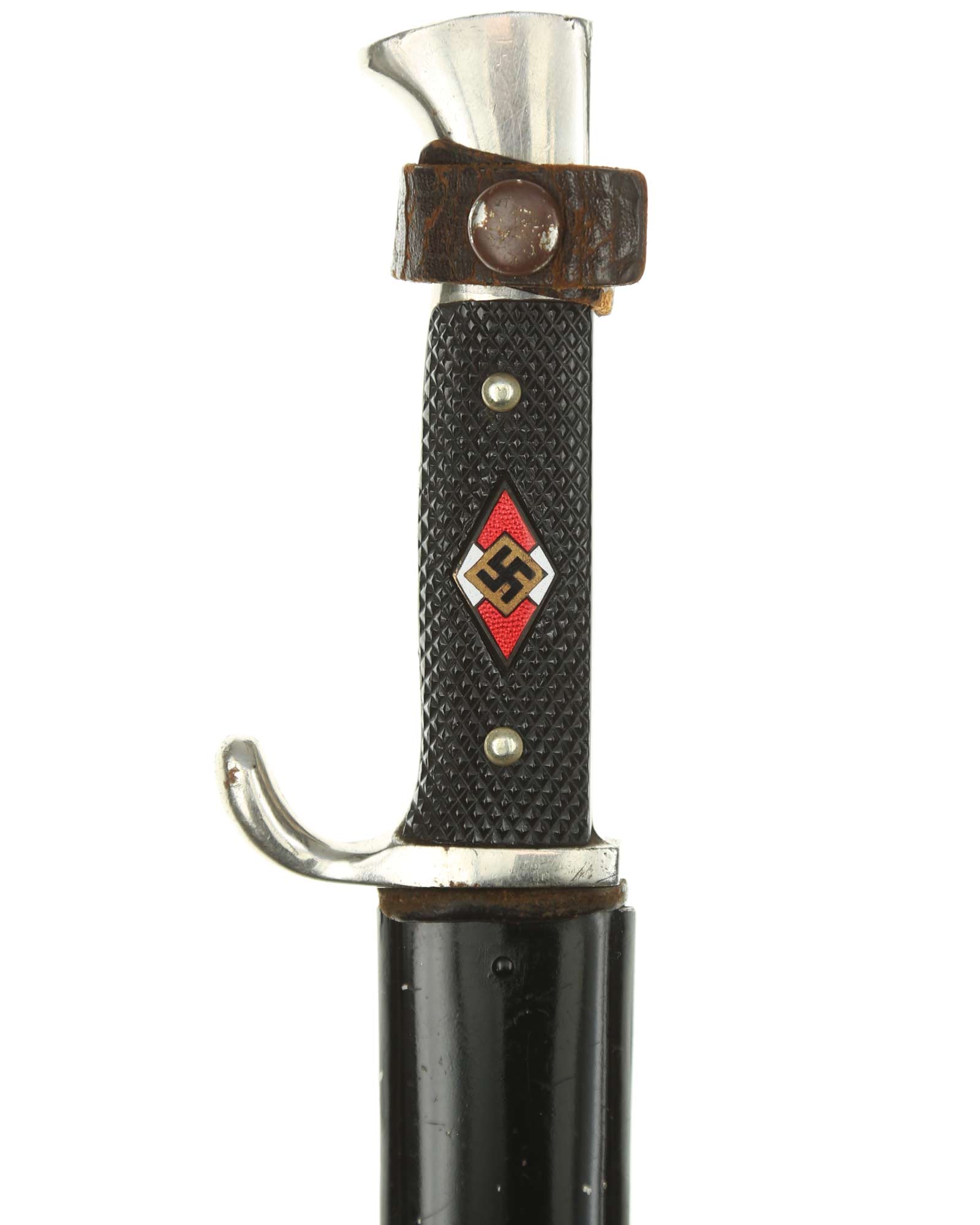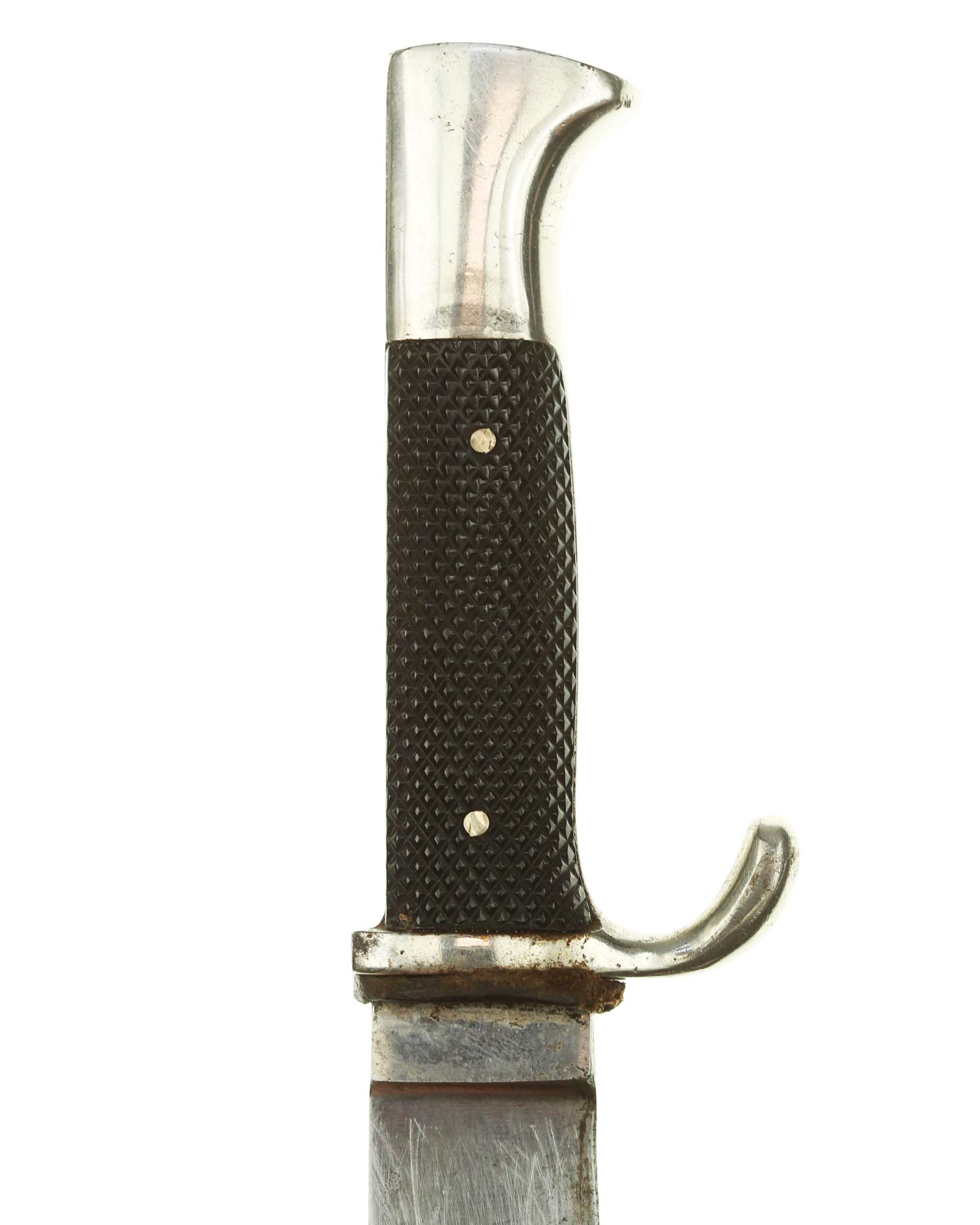 Griff: Vernietete Griffschalen, aus Bakelit mit Fischgrätenmuster in Tiefschwarz. Auf der vorderen Seite befindet sich, in der Mitte der Griffschale, das Hitler-Jugend-Abzeichen (versplintet). Einseitig gebogene Parierstange bzw. Knebel.